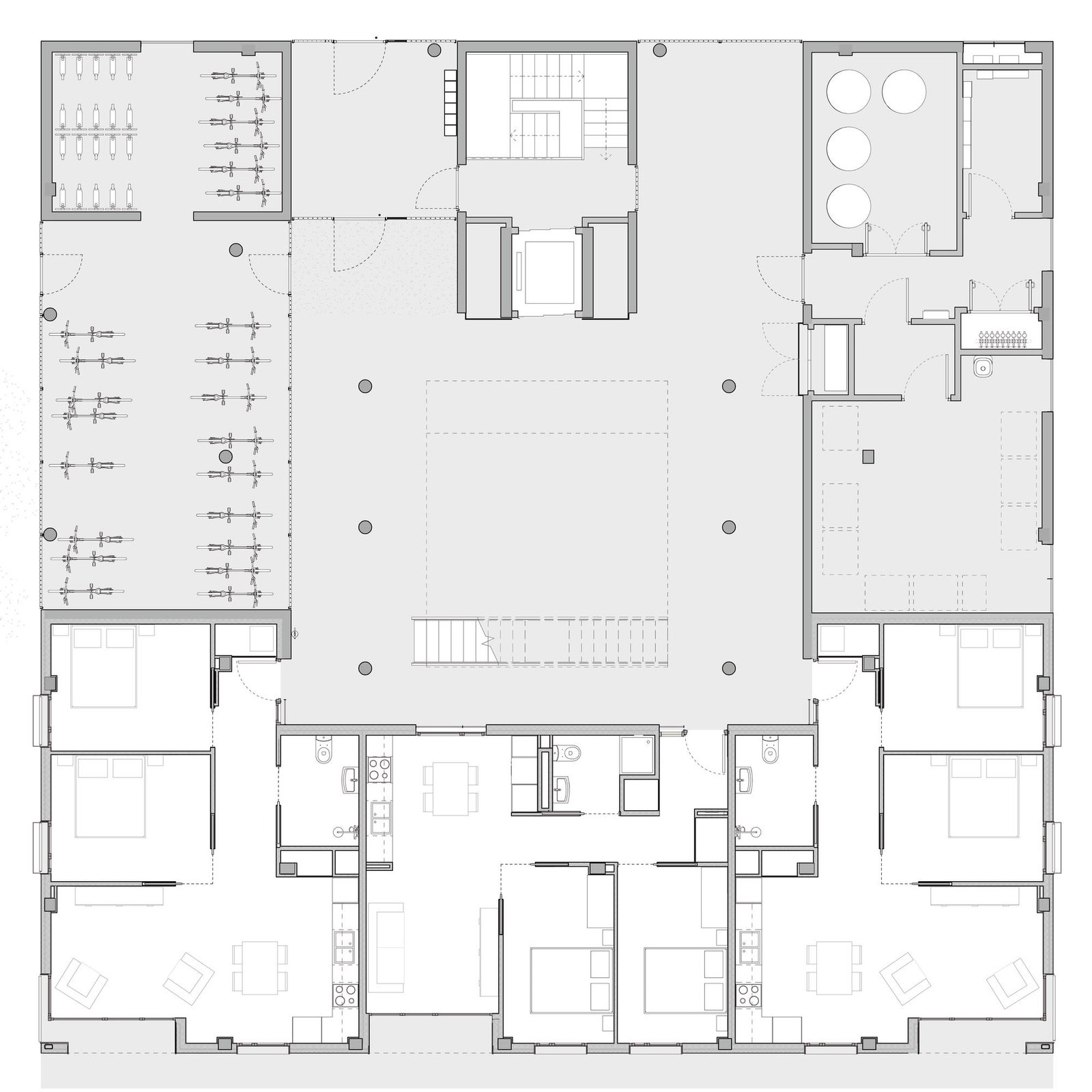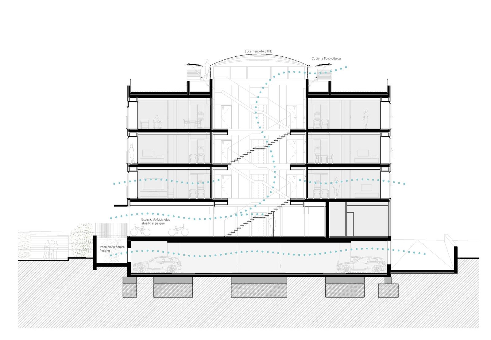 La planta baja se libera deliberadamente para convertirse en el verdadero corazón del proyecto. En lugar de adoptar una distribución convencional, este nivel concentra puntos de acceso, espacios técnicos, zonas comunes y un amplio aparcamiento de bicicletas, configurando un espacio colectivo conectado tanto con el parque como con el barrio. Para ello, se replanteó la tipología de las viviendas: de las seis viviendas inicialmente previstas por planta se aumentaron a siete en las plantas tipo, mientras que la planta baja alberga solo tres unidades, priorizando el espacio compartido sobre la eficiencia estrictamente cuantitativa.