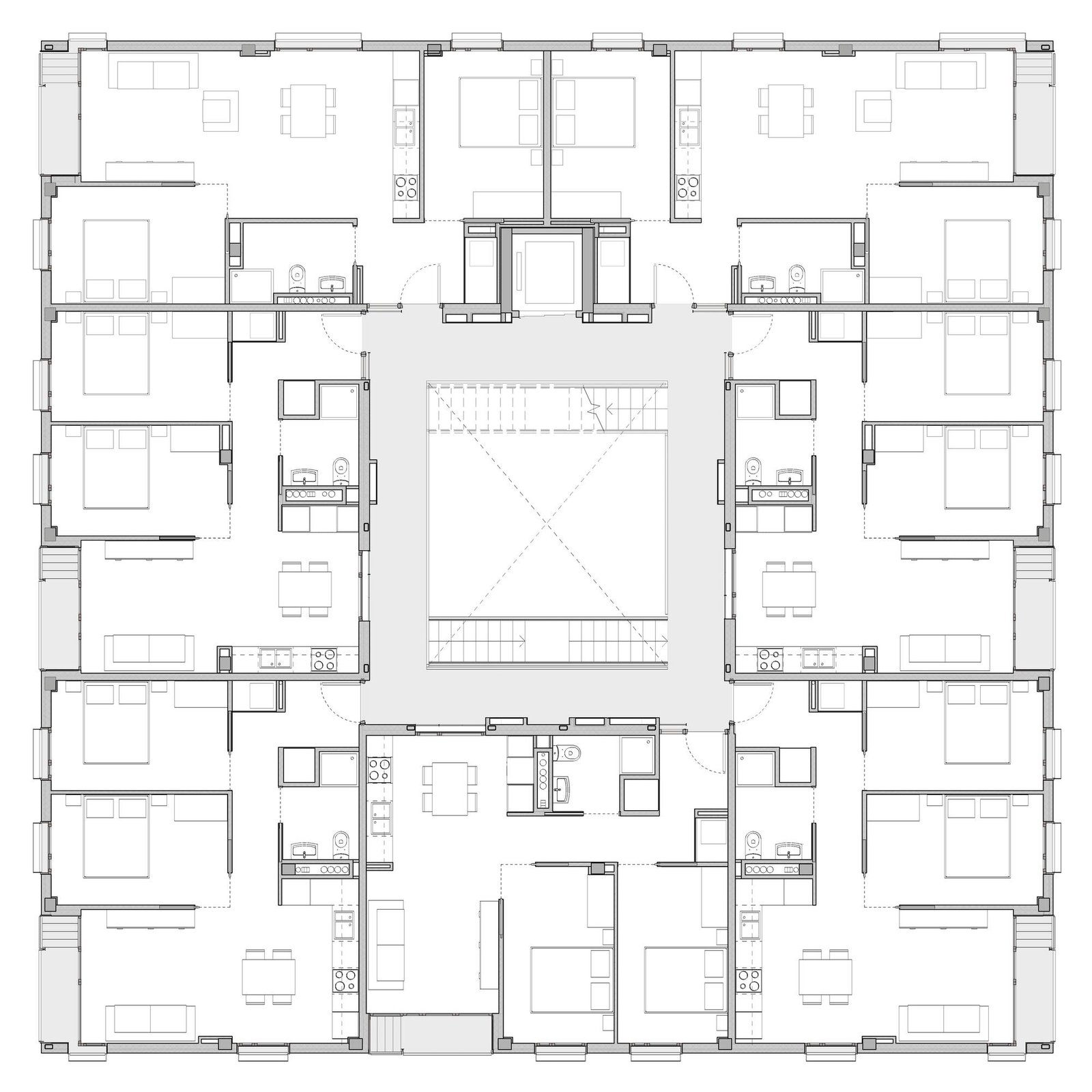 Las viviendas resultantes son compactas, pero buscan trascender las limitaciones dimensionales mediante estrategias espaciales precisas. El enfoque de «esquina destruida» rompe los límites visuales convencionales, amplía las perspectivas interiores y potencia la continuidad espacial, generando viviendas luminosas y flexibles a pesar de su limitada superficie.