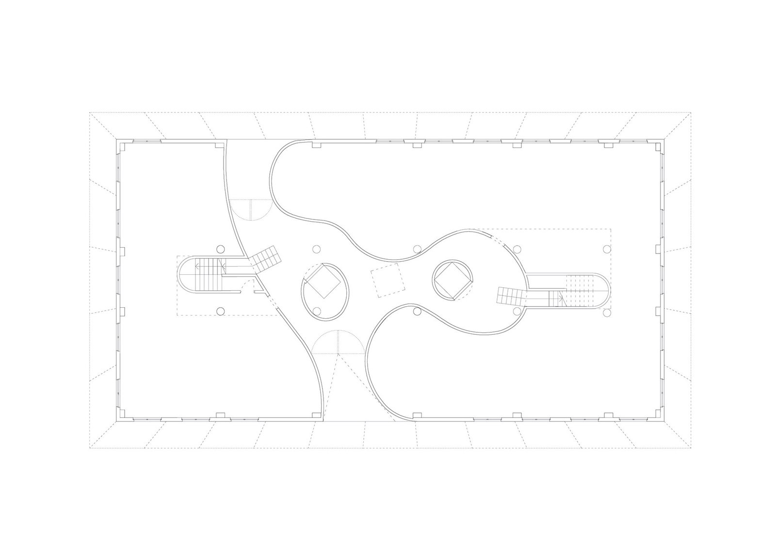 La planta baja define un pasaje interior que comunica la calle y el parque proporcionando conectividad e integración entre las dos áreas urbanas al mismo tiempo que divide el espacio en dos espacios cerrados para uso comercial y público. Su forma sigue la naturaleza de su entorno para una mejor integración y sus acabados de base dura facilitan la accesibilidad y el mantenimiento.