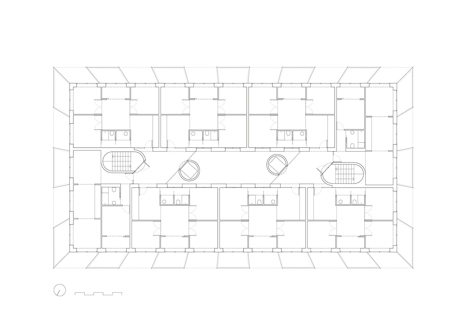 Los apartamentos están contenidos en un paralelepípedo compacto y ortogonal y organizados alrededor de un patio que regula pasivamente la temperatura interior y la ventilación reduciendo consumos y dependencias económicas.