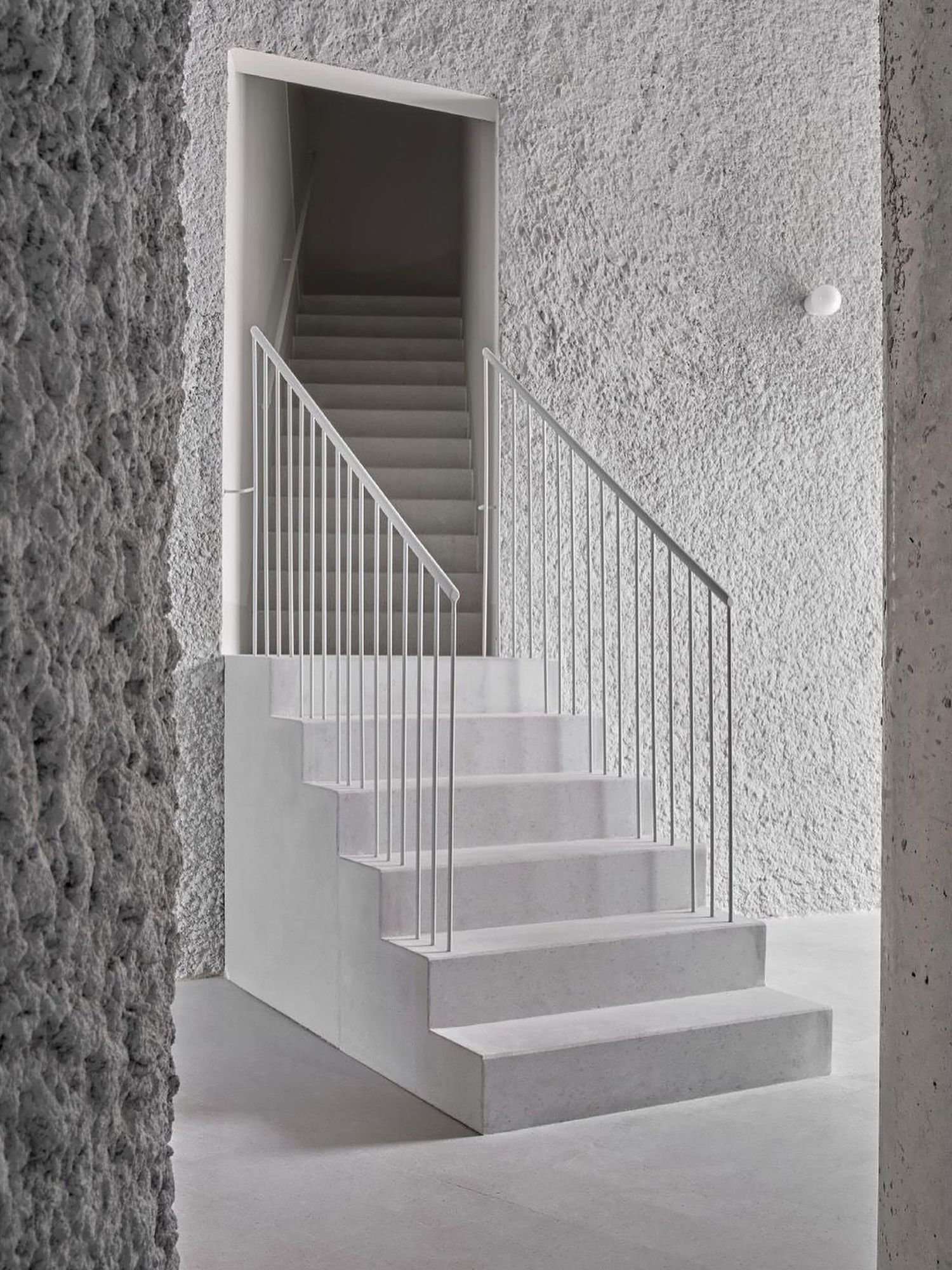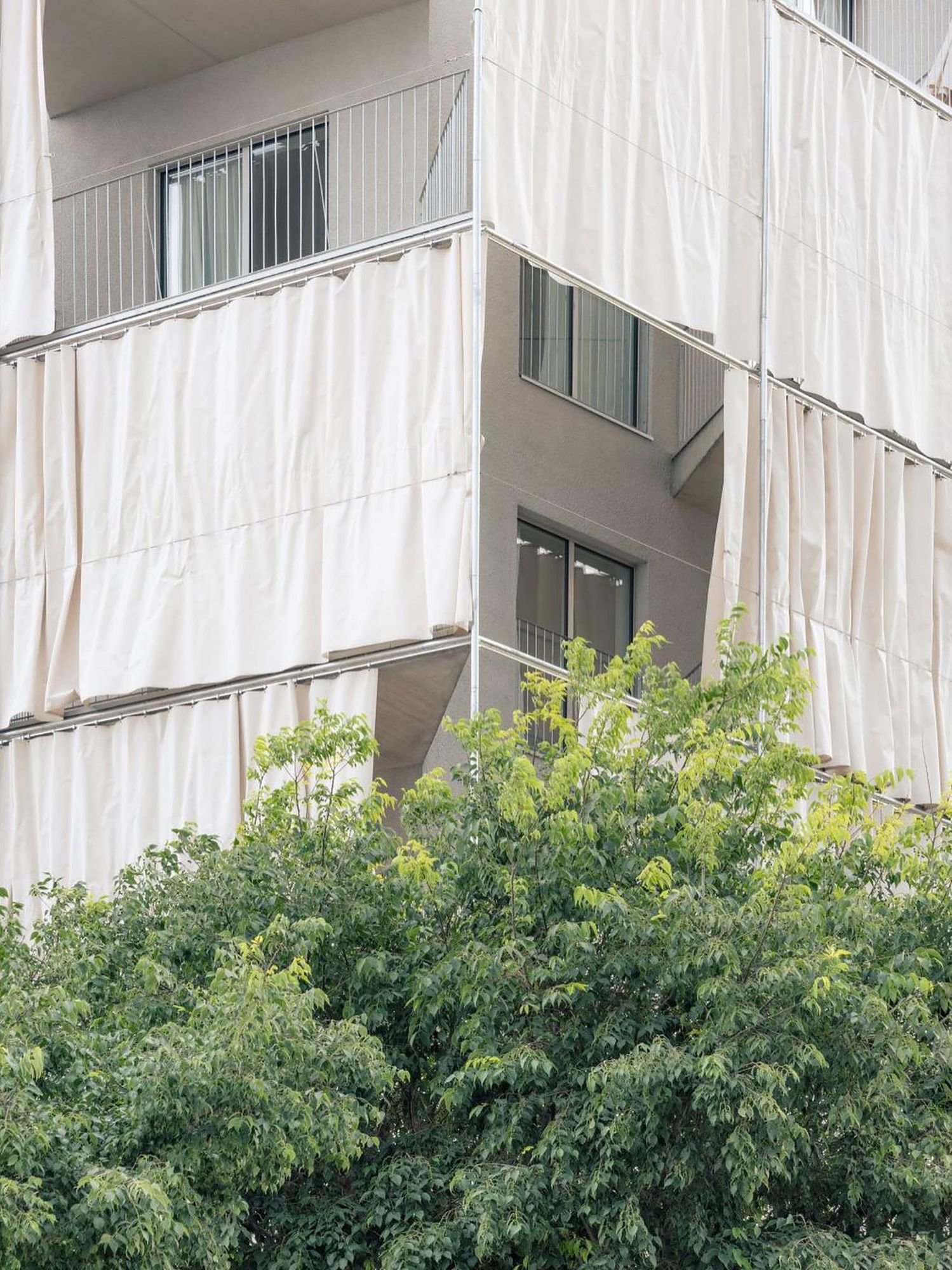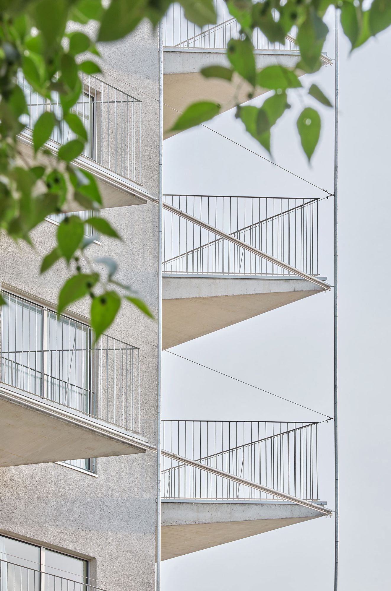 A su vez, las fachadas están definidas por balcones que ocupan la superficie máxima permitida por la normativa local, que limita su presencia al 50% de la fachada. Siguiendo estrictamente una forma de abanico, el proyecto extiende la superficie exterior de los apartamentos al máximo permitido, definiendo grandes espacios exteriores.