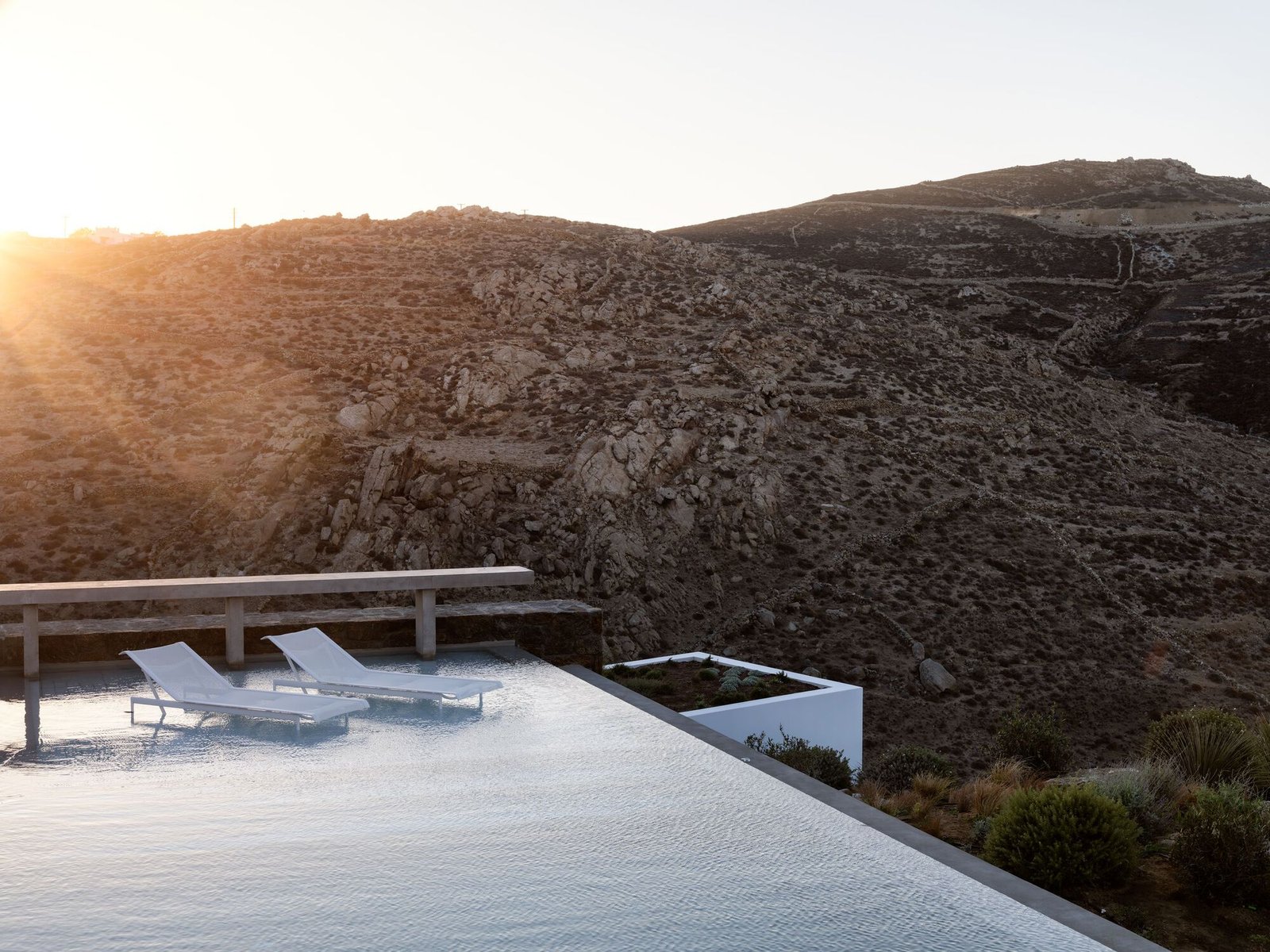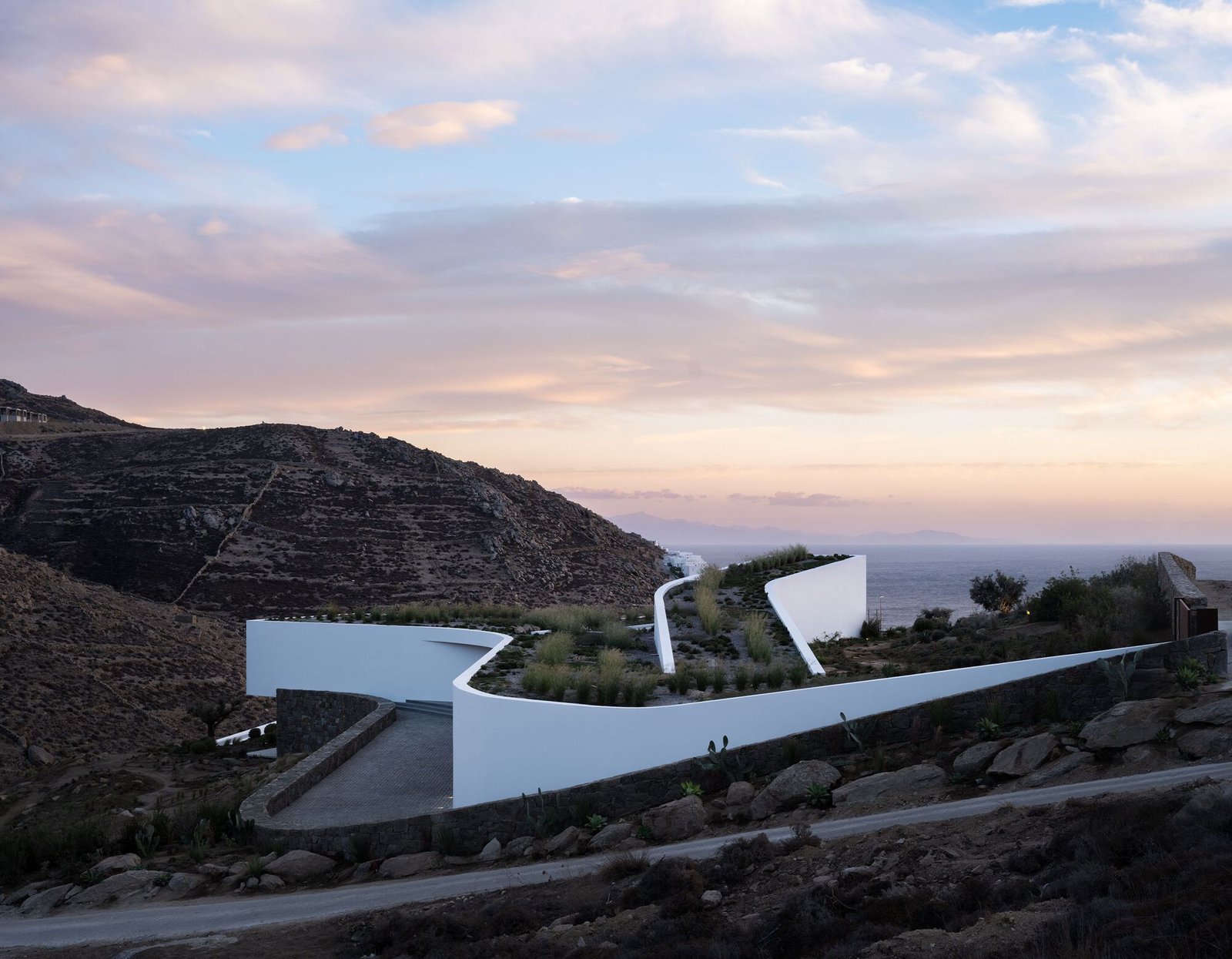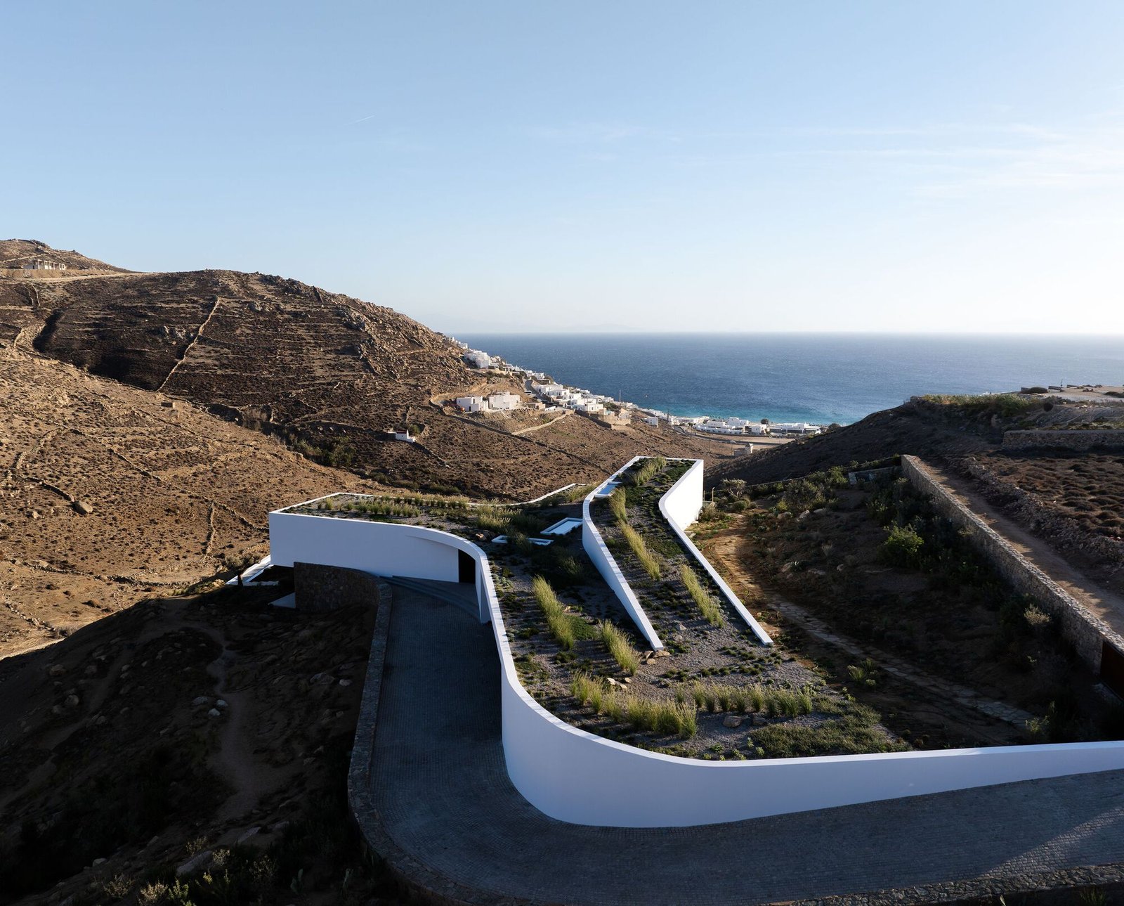 El paisaje es la inspiración tanto para el agricultor del pasado como para el arquitecto de hoy. Como resultado, una pared de 62 metros hecha de piedra de granito local de Mykonos y que sigue suavemente las líneas de contorno del terreno es la «columna vertebral» de la nueva composición arquitectónica en la que se asienta suavemente el nuevo edificio. El edificio se abre hacia el sur, ofreciendo una espectacular vista al mar y a la playa de Elia, y hacia el este, hacia una imponente colina de granito rocoso llena de antiguas paredes de piedra seca que están catalogadas por la UNESCO como monumentos de patrimonio cultural inmaterial.
