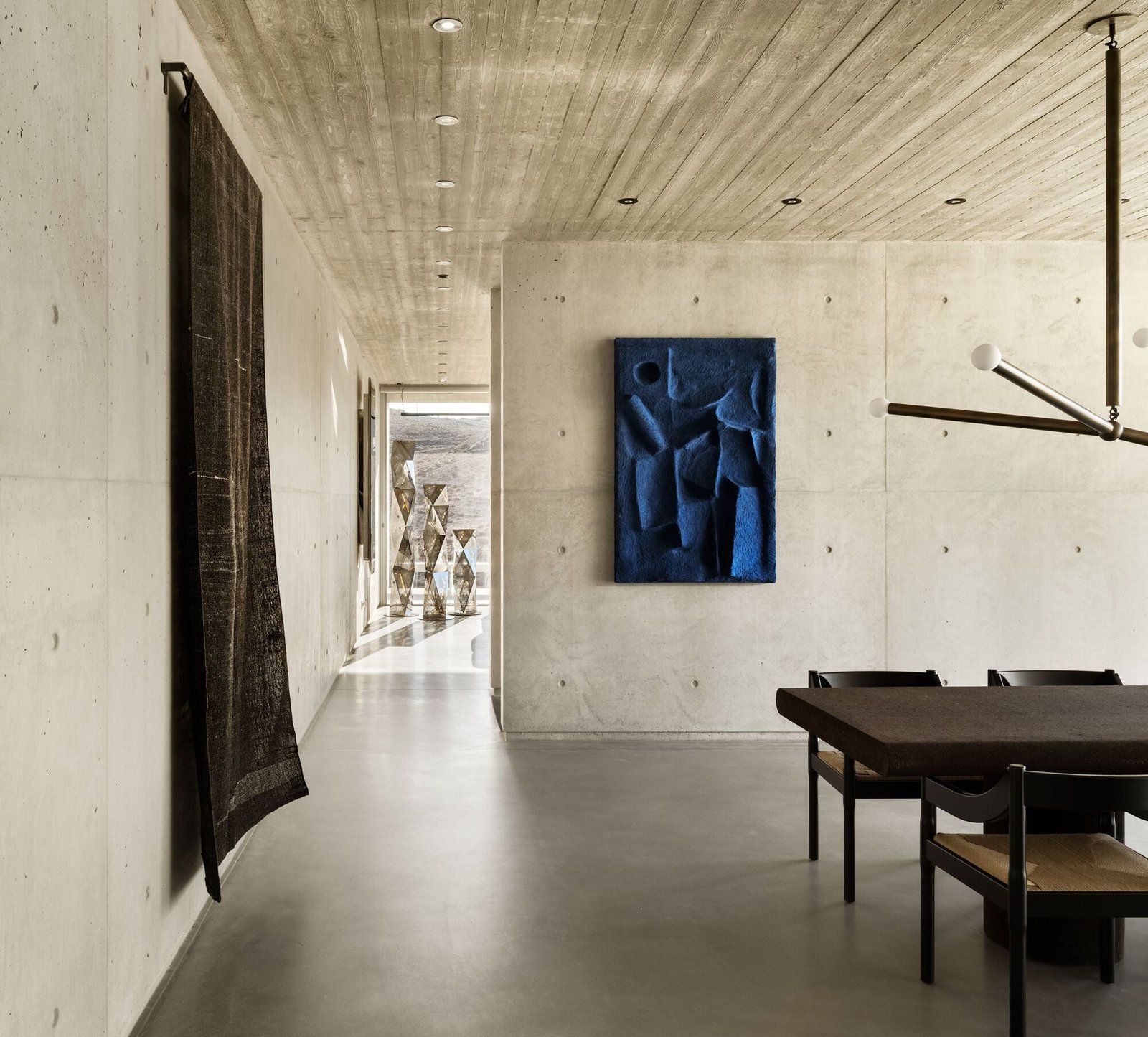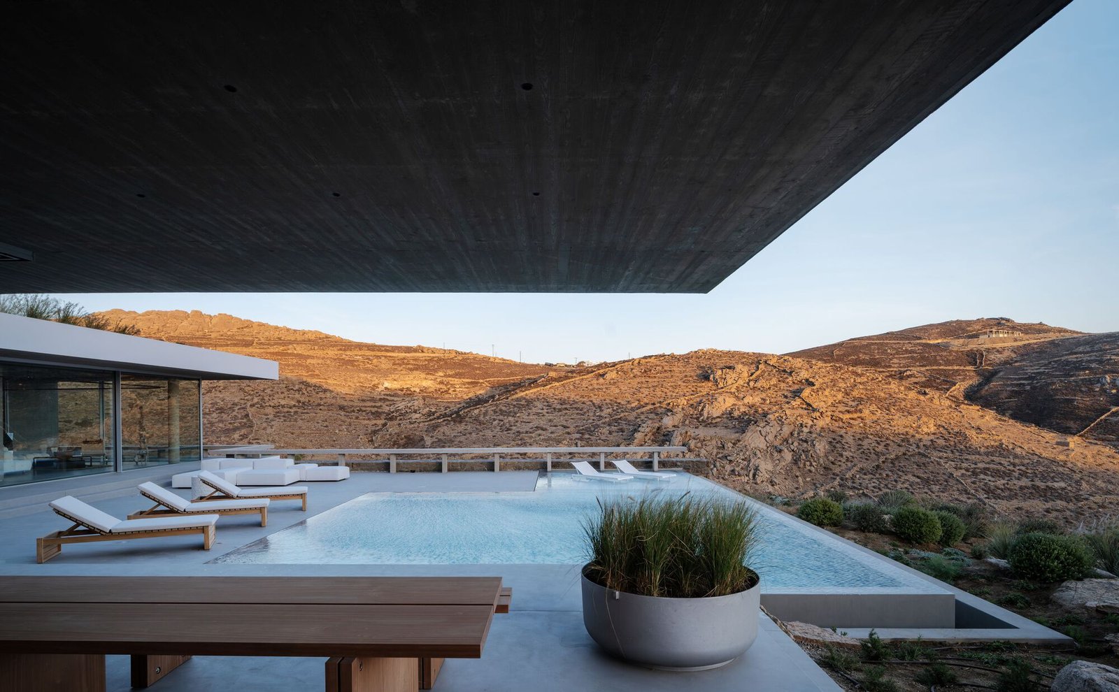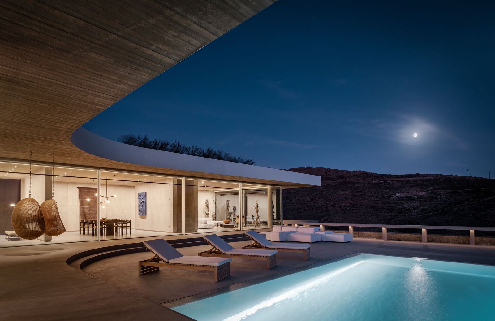 El paisaje es la inspiración tanto para el agricultor del pasado como para el arquitecto de hoy. Como resultado, una pared de 62 metros hecha de piedra de granito local de Mykonos y que sigue suavemente las líneas de contorno del terreno es la «columna vertebral» de la nueva composición arquitectónica en la que se asienta suavemente el nuevo edificio. El edificio se abre hacia el sur, ofreciendo una espectacular vista al mar y a la playa de Elia, y hacia el este, hacia una imponente colina de granito rocoso llena de antiguas paredes de piedra seca que están catalogadas por la UNESCO como monumentos de patrimonio cultural inmaterial.