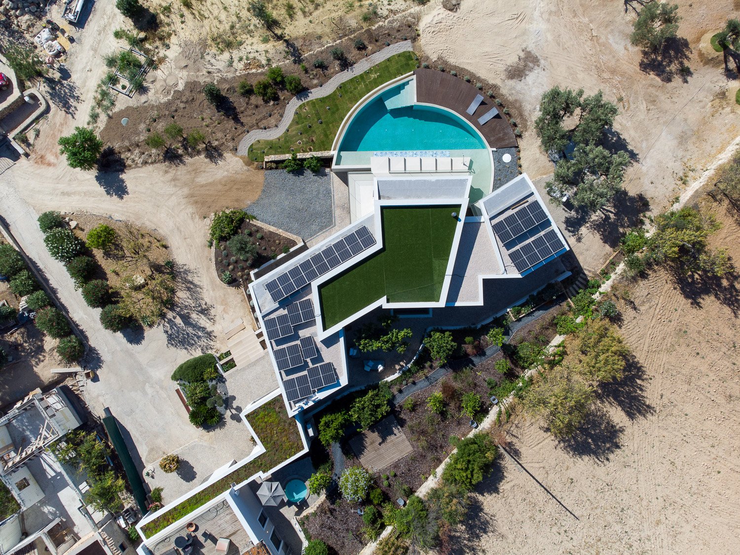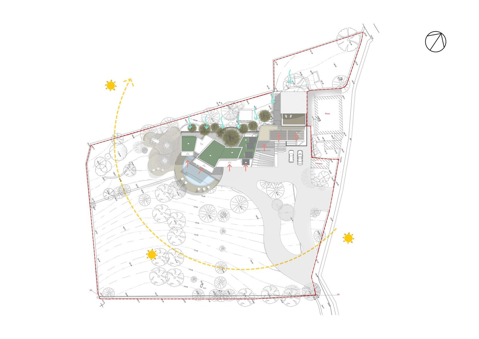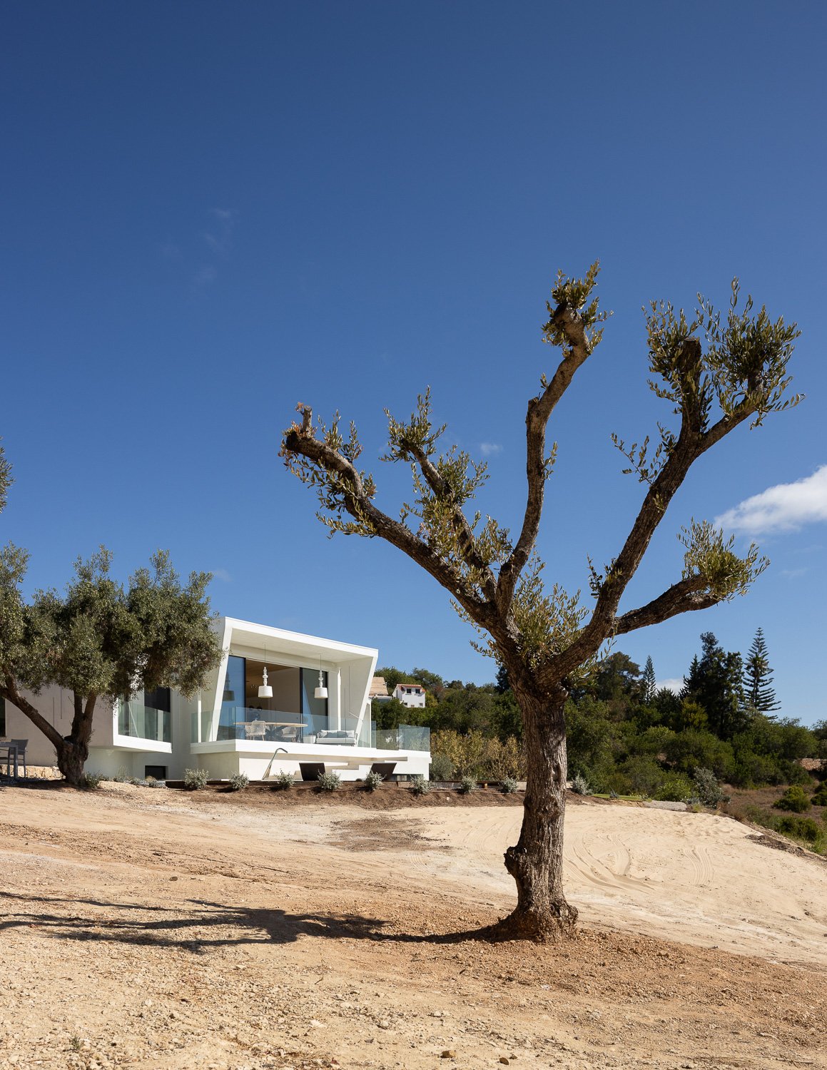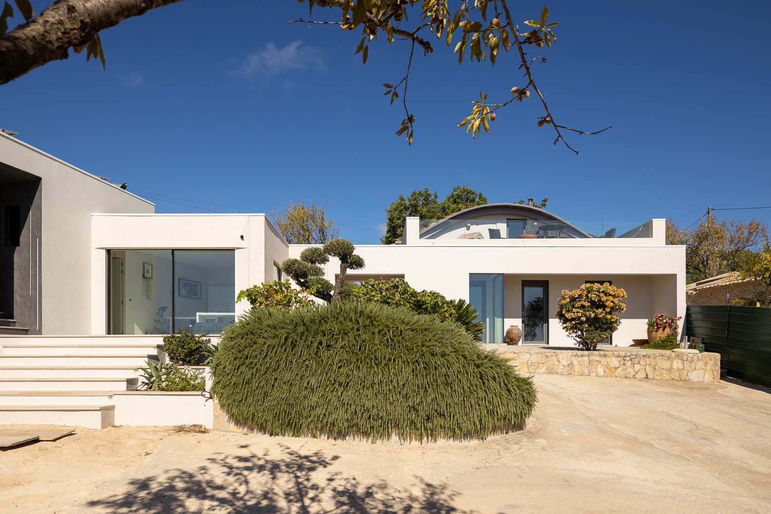 La parcela de 5.230 metros cuadrados está poblada de viejos olivos, almendros y naranjos. La forma del nuevo edificio se basó en levantamientos bioclimáticos y topográficos. La fachada norte se planea más estrecha y cerrada para mantener alejados los vientos fríos. El sur es amplio y abierto como un abanico y ofrece una vida espaciosa de planta abierta con vista al mar y luz natural.