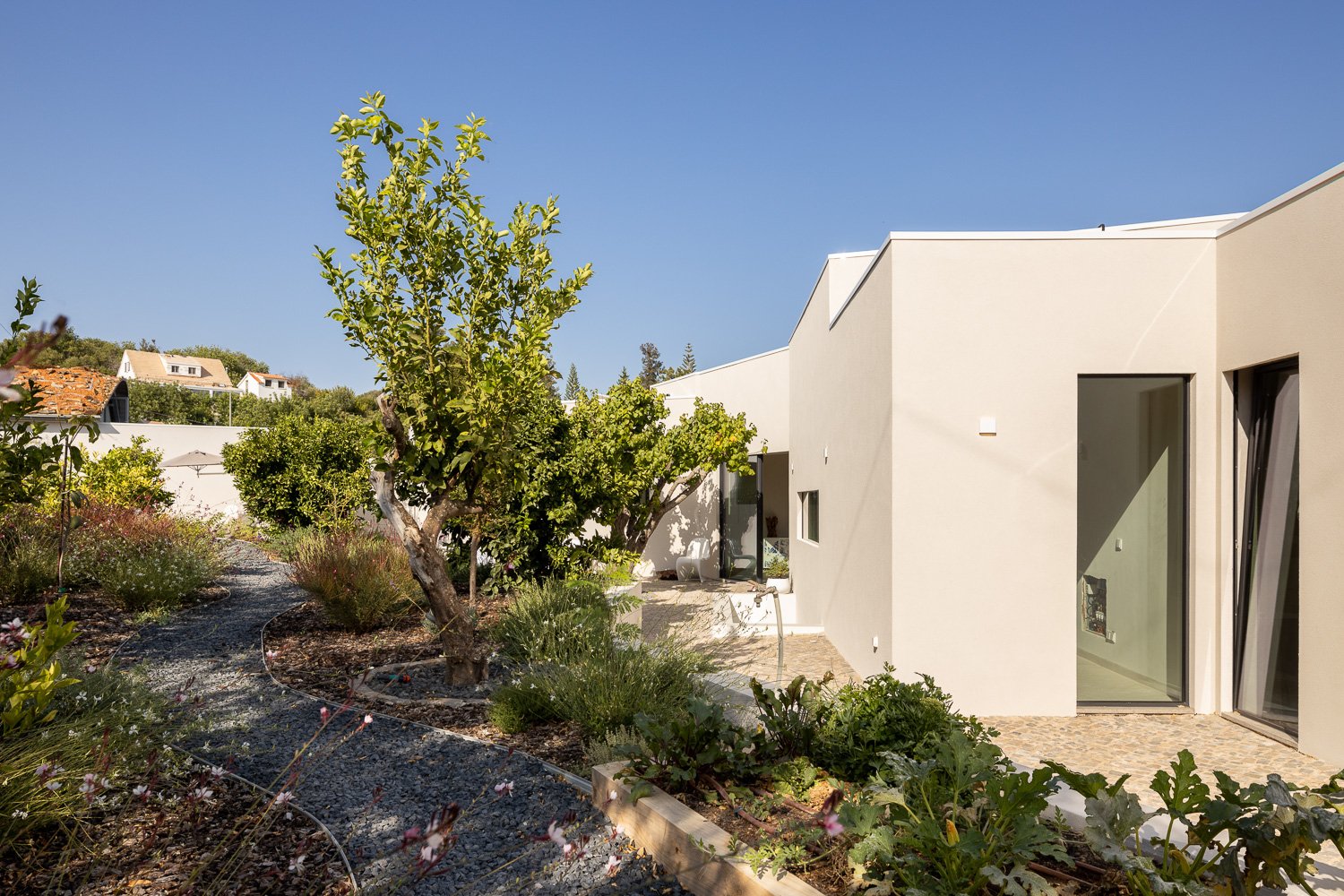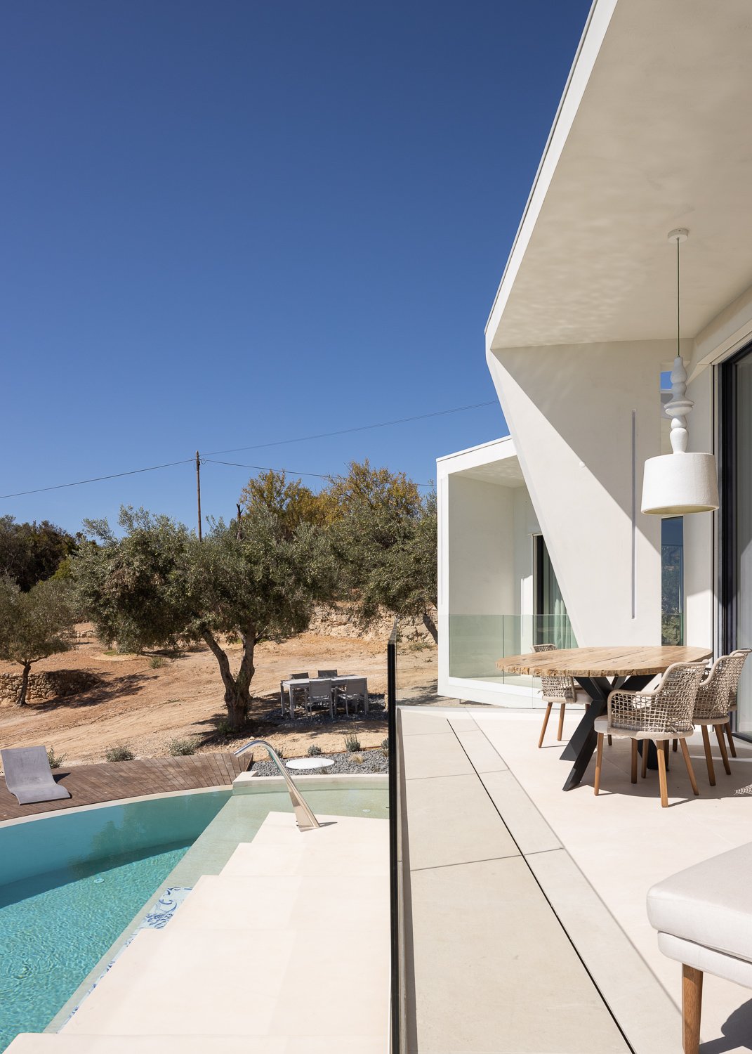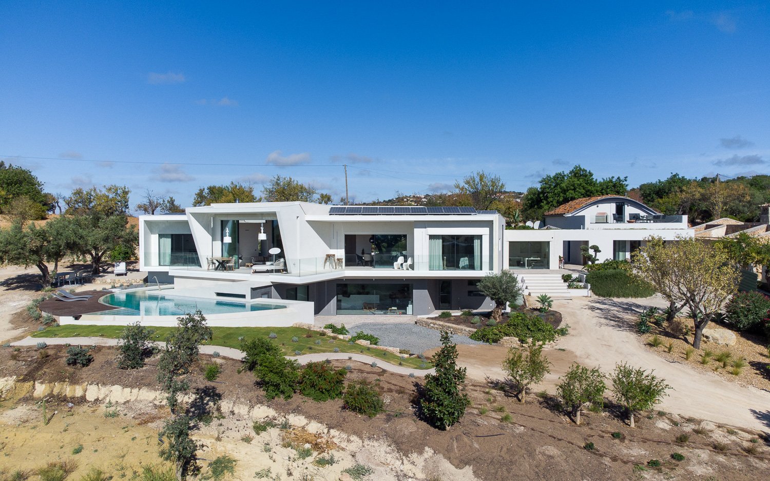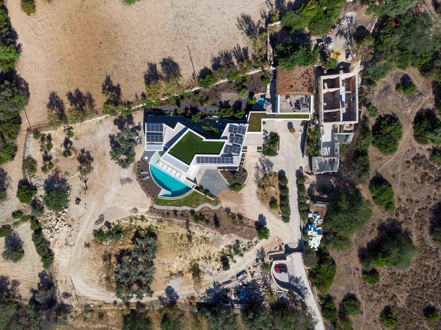 La parcela de 5.230 metros cuadrados está poblada de viejos olivos, almendros y naranjos. La forma del nuevo edificio se basó en levantamientos bioclimáticos y topográficos. La fachada norte se planea más estrecha y cerrada para mantener alejados los vientos fríos. El sur es amplio y abierto como un abanico y ofrece una vida espaciosa de planta abierta con vista al mar y luz natural.