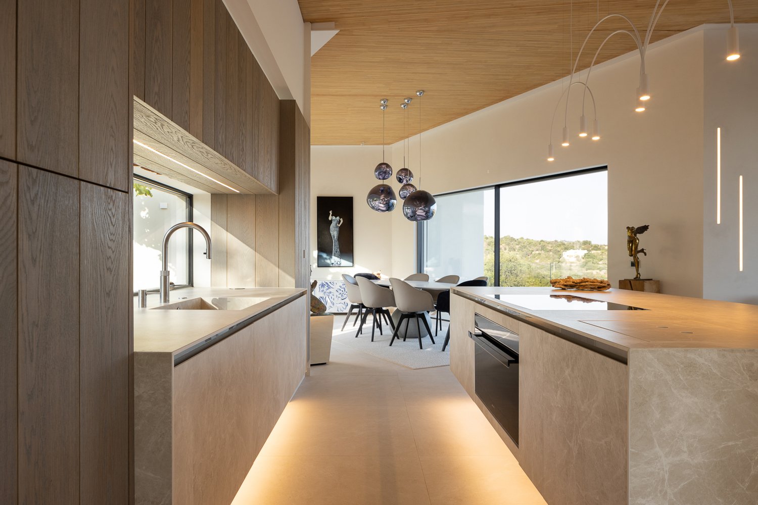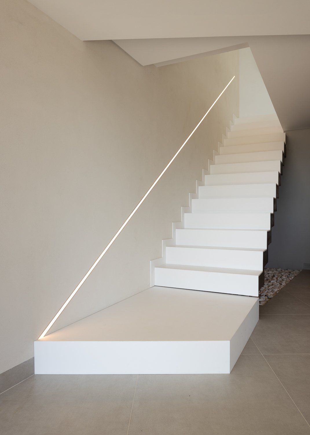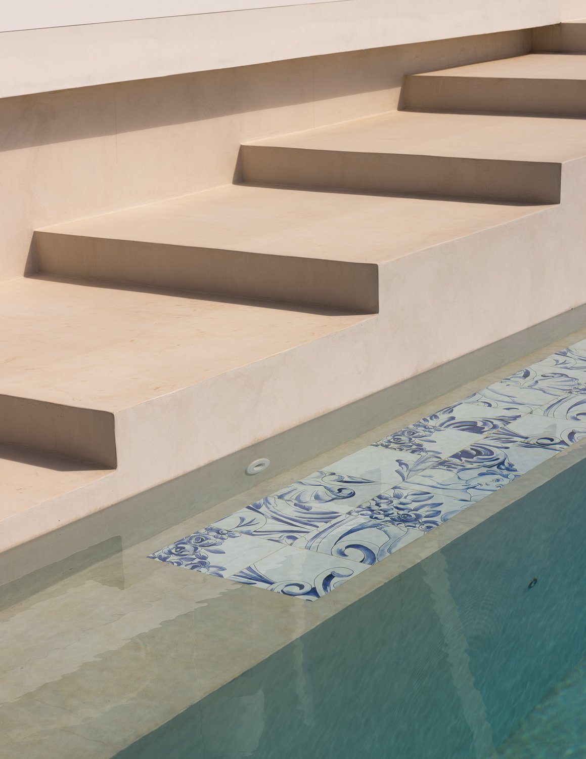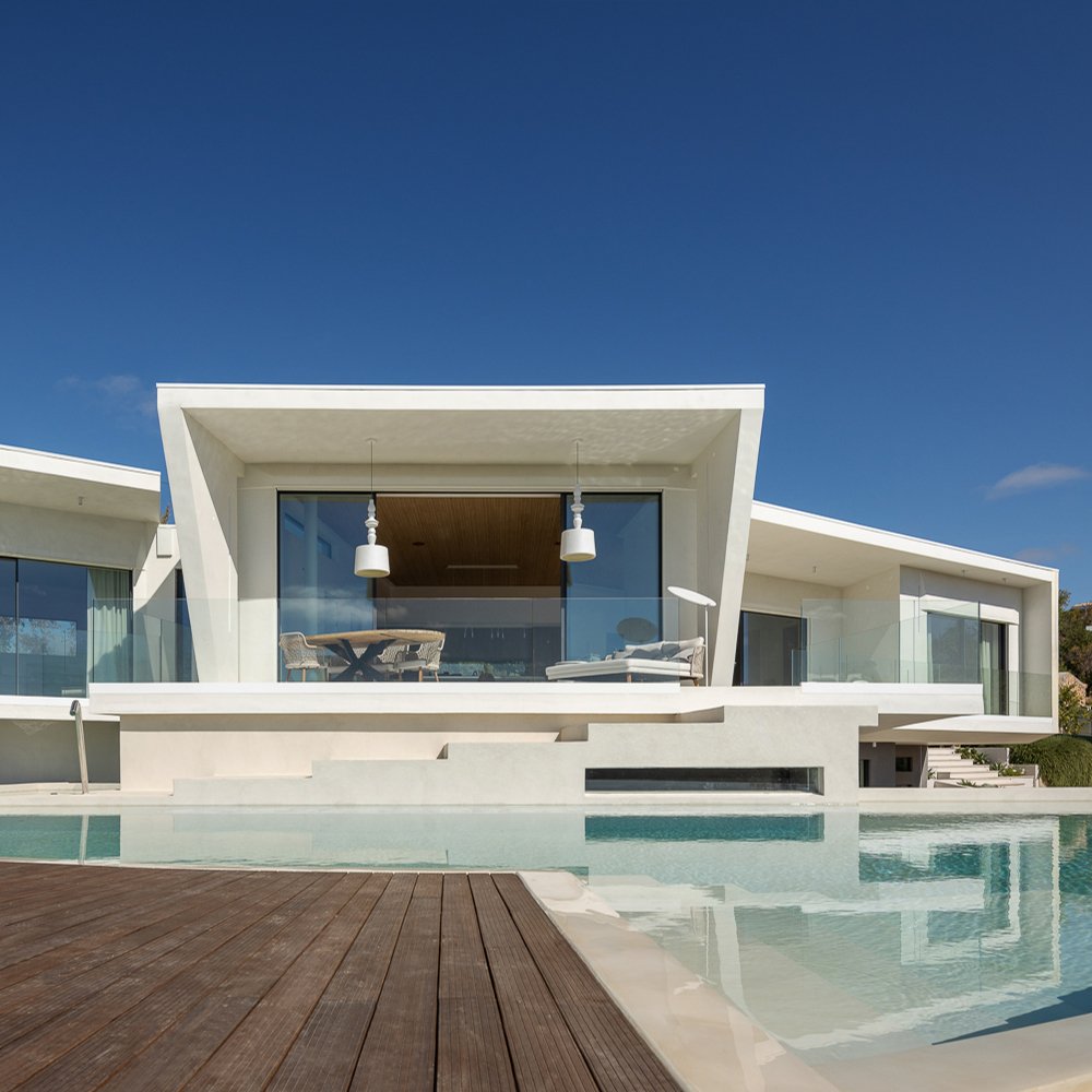 Diseño de interiores. Coherencia de materiales y formas en toda la casa. Los suelos de madera de los dormitorios se utilizaron para construir los muebles de cocina a medida. CORIAN se utilizó para el lavabo de diseño personalizado en el baño y para las escaleras de diseño personalizado que conducen al sótano. Azulejos portugueses utilizados en las paredes de los patios, en la piscina y en los aparadores del comedor diseñado a medida. La intención era mantener la coherencia material entre los distintos ambientes de la casa.