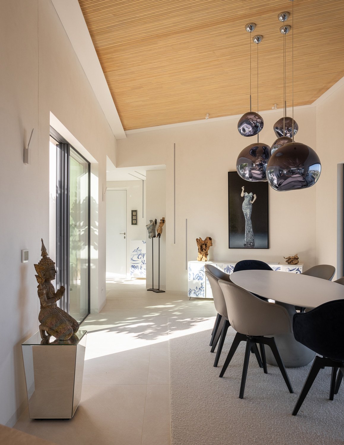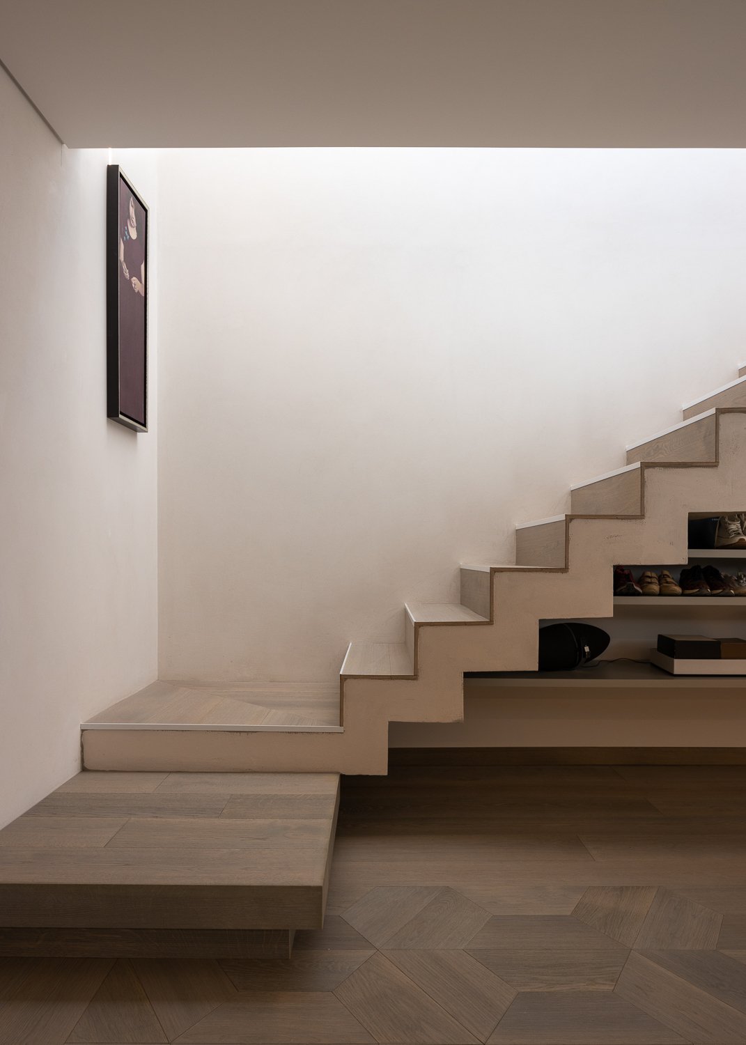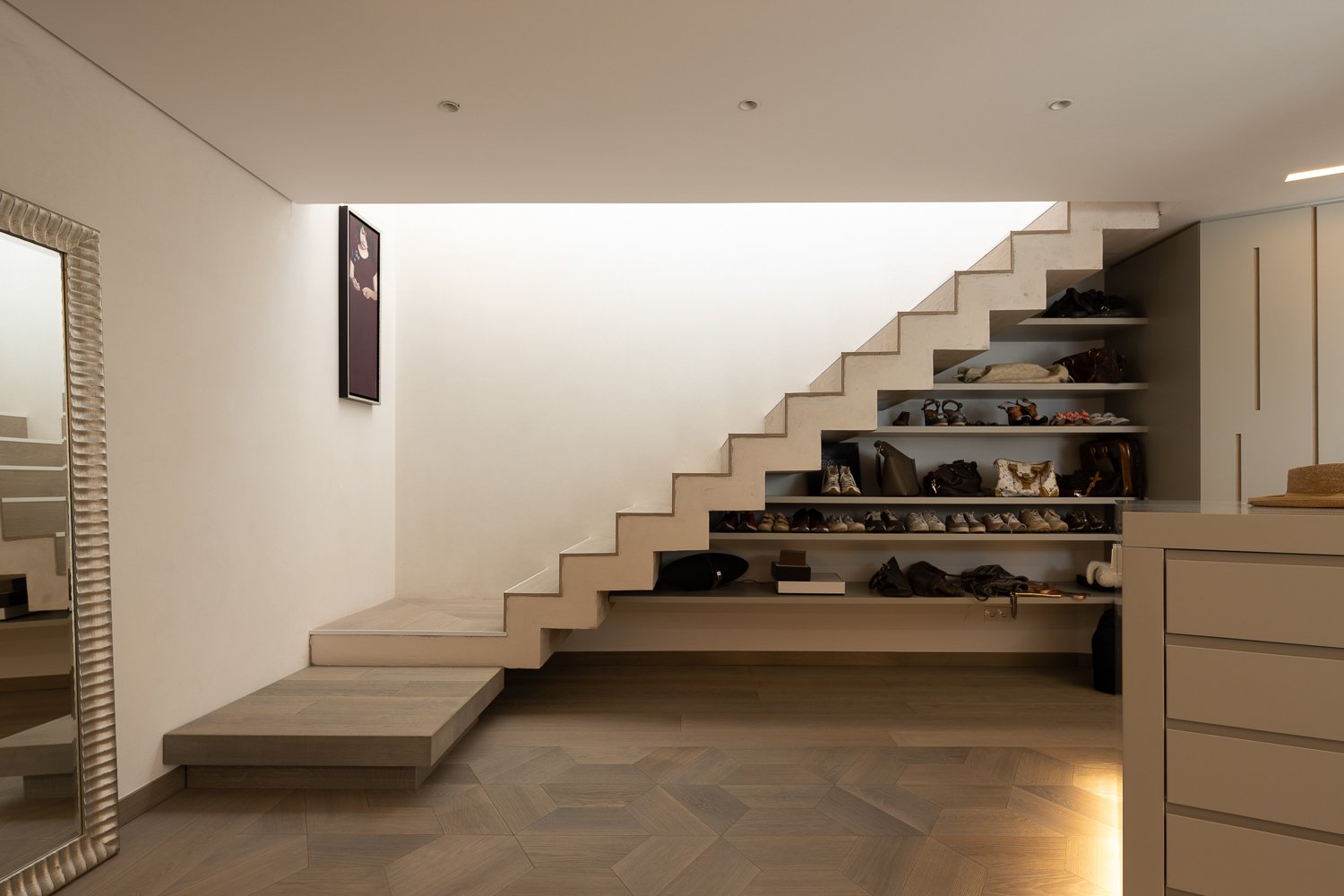 Diseño de interiores. Coherencia de materiales y formas en toda la casa. Los suelos de madera de los dormitorios se utilizaron para construir los muebles de cocina a medida. CORIAN se utilizó para el lavabo de diseño personalizado en el baño y para las escaleras de diseño personalizado que conducen al sótano. Azulejos portugueses utilizados en las paredes de los patios, en la piscina y en los aparadores del comedor diseñado a medida. La intención era mantener la coherencia material entre los distintos ambientes de la casa.