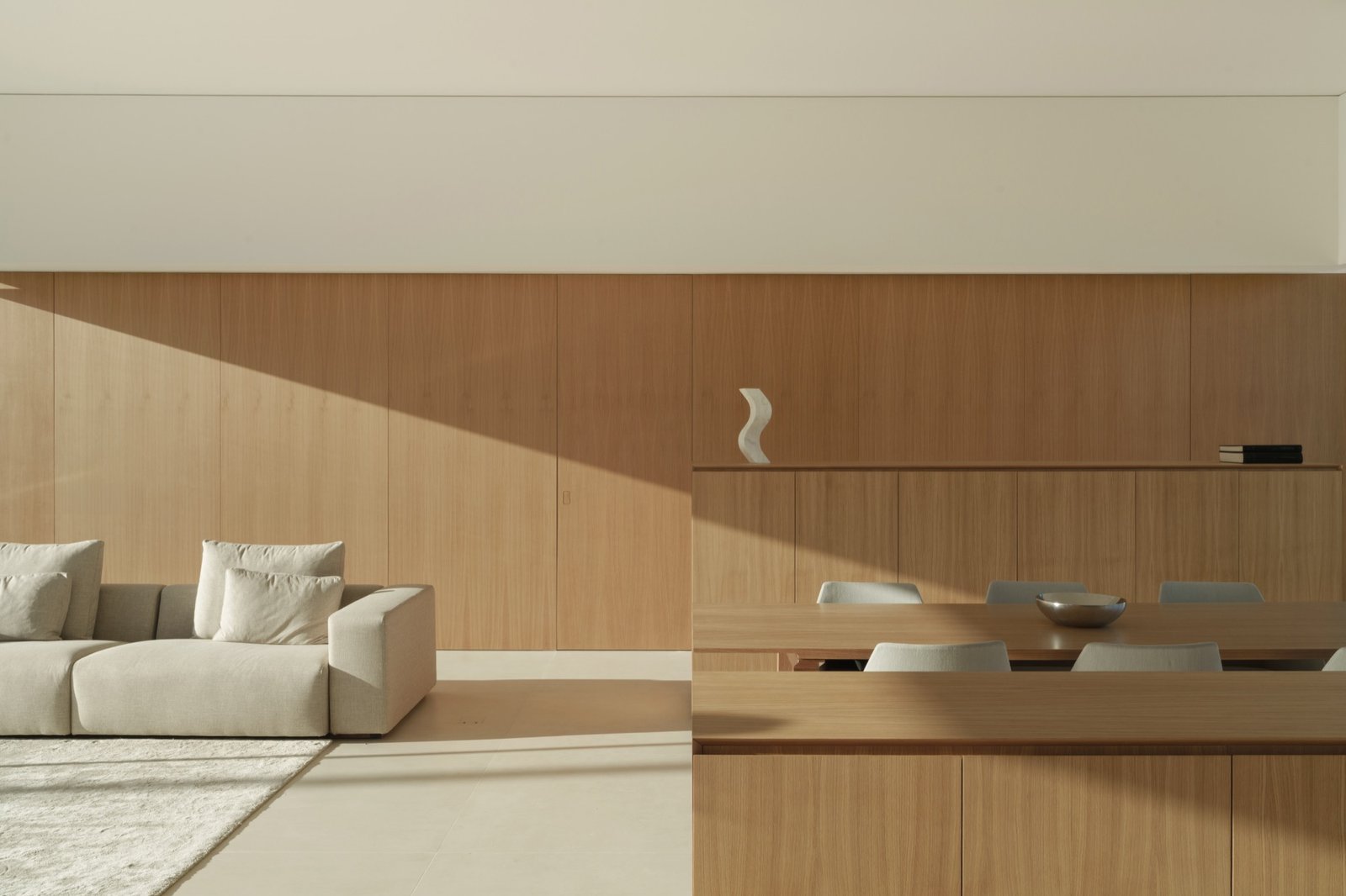 En el interior, los materiales se resuelven mediante un cromatismo continuo y cálido. Algunos paramentos verticales y piezas de mobiliario se ejecutan en madera de roble, aportando textura y profundidad al conjunto. Esta decisión, junto con la temperatura de color de la iluminación, confiere a la propuesta el carácter doméstico buscado.