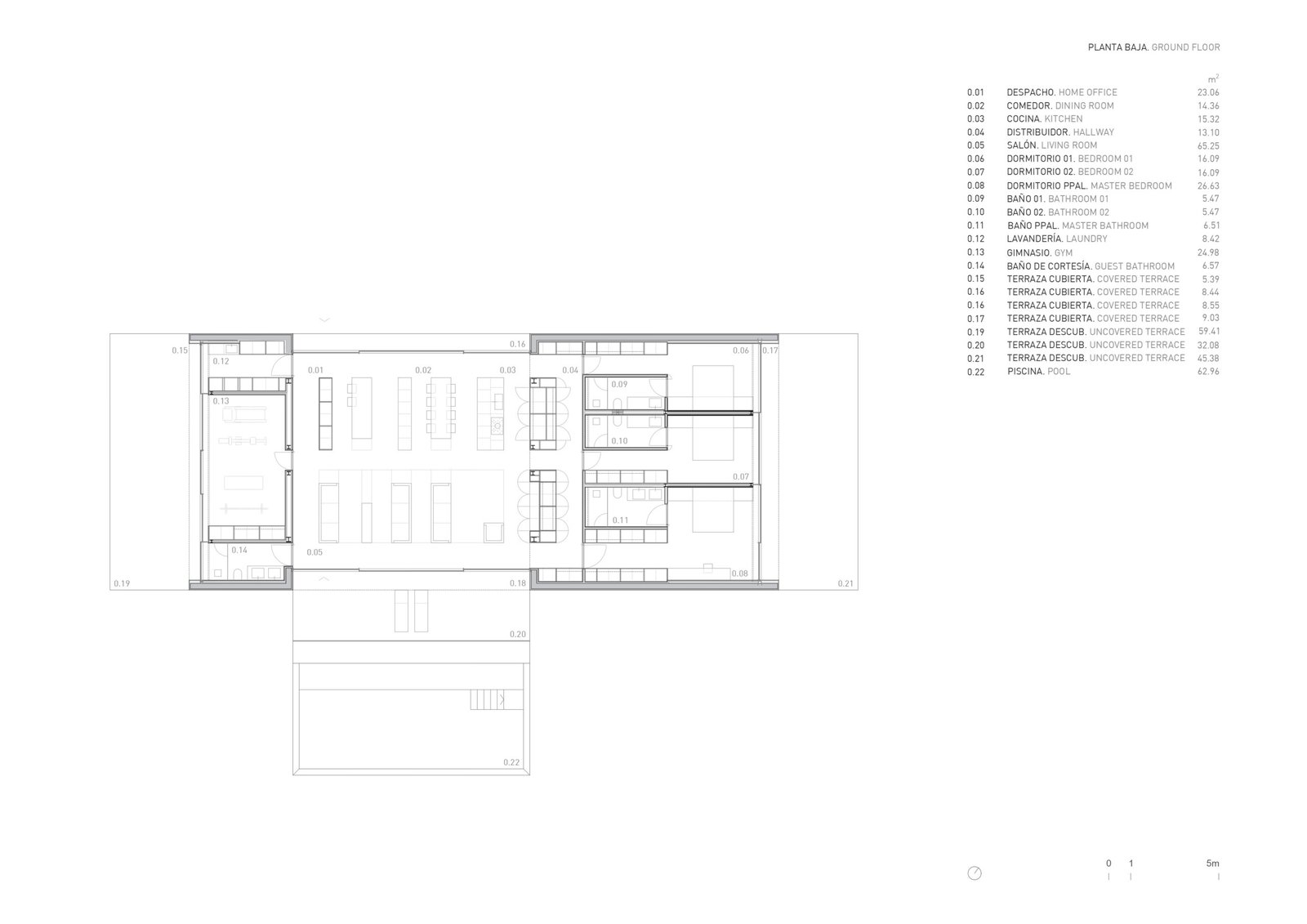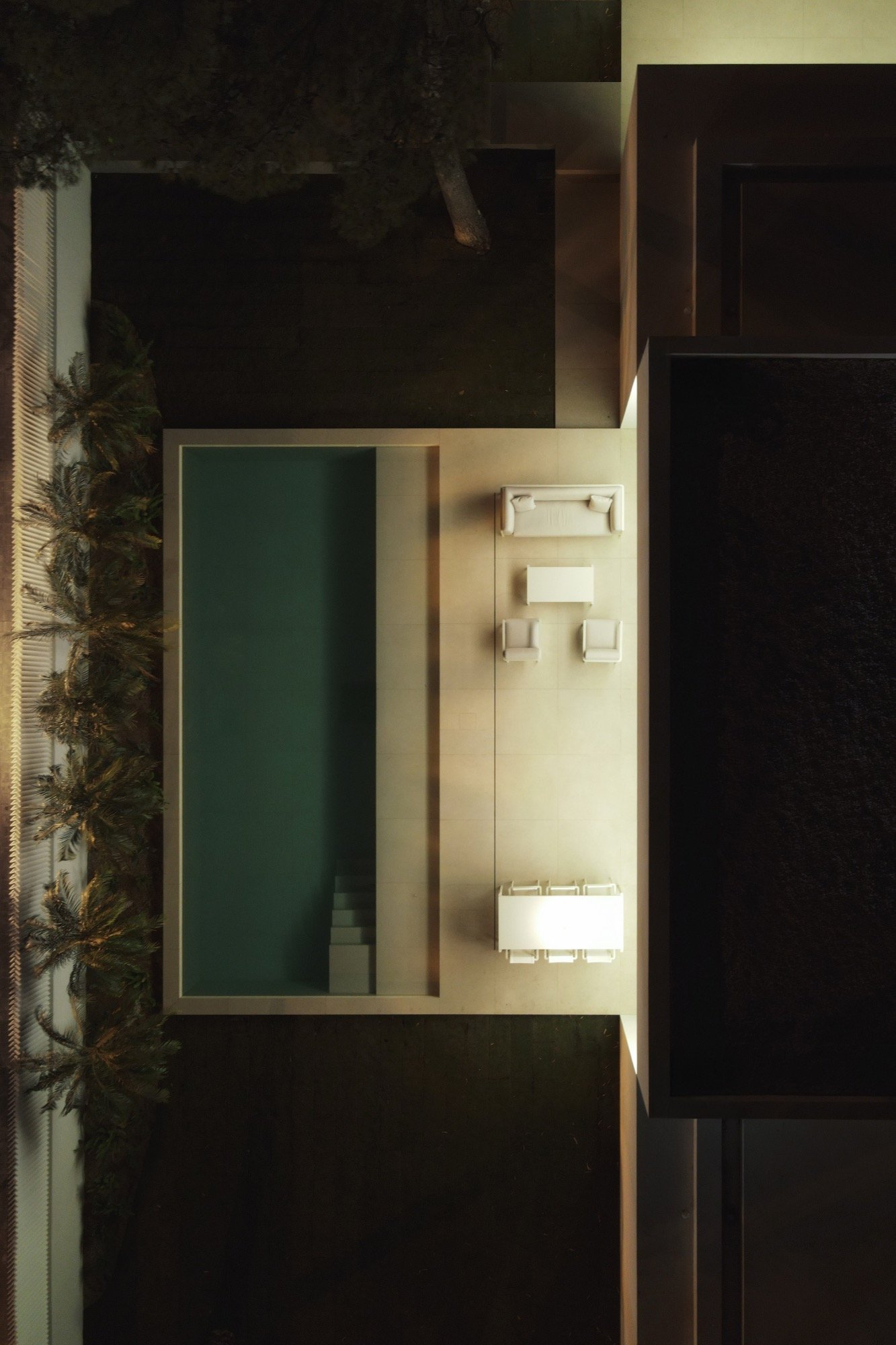 El espesor de este cuerpo permite alojar en su interior una estructura de gran canto, de modo que el espacio principal puede salvar toda su luz sin apoyos intermedios. La zona de día se concibe así como un ámbito continuo, en relación directa con el pavimento exterior y la lámina de agua, diluyendo el límite entre interior y exterior y reforzando el carácter abierto de la vivienda.