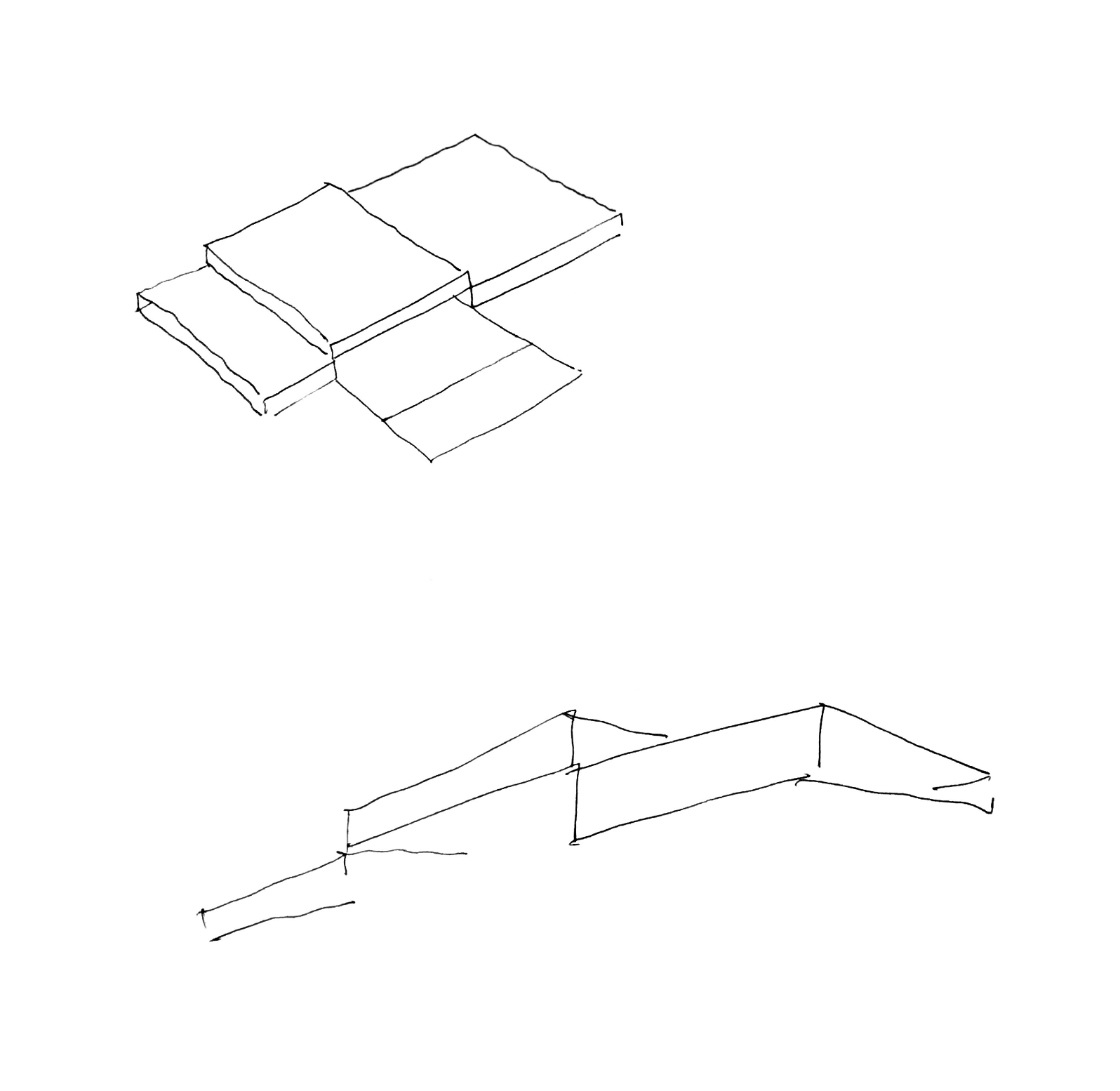 Se persigue, además, una mayor altura libre en el espacio principal. La volumetría se resuelve mediante dos cuerpos de menor altura entre los que se intercala un volumen de mayor dimensión. Este último, correspondiente a la zona de estar, parece elevarse ligeramente, subrayando su presencia y otorgando identidad a la propuesta; su canto ancho refuerza esa condición, de modo que el volumen parece levitar sobre el espacio que protege.