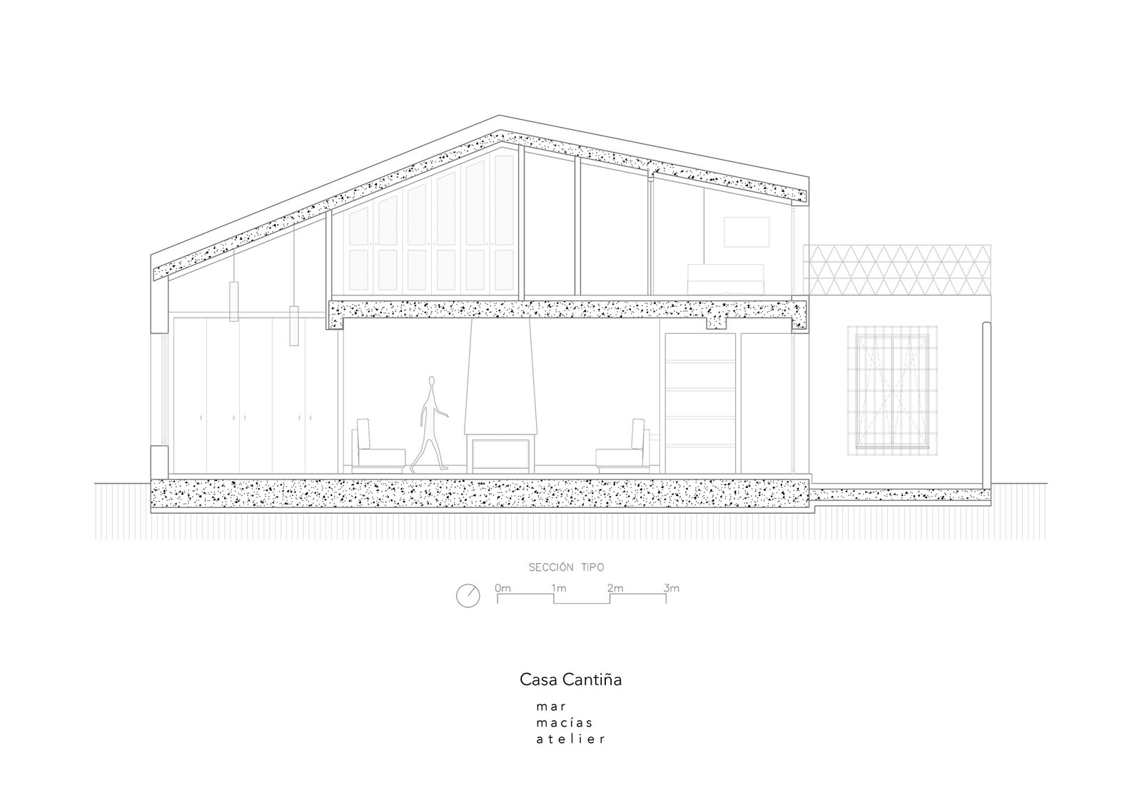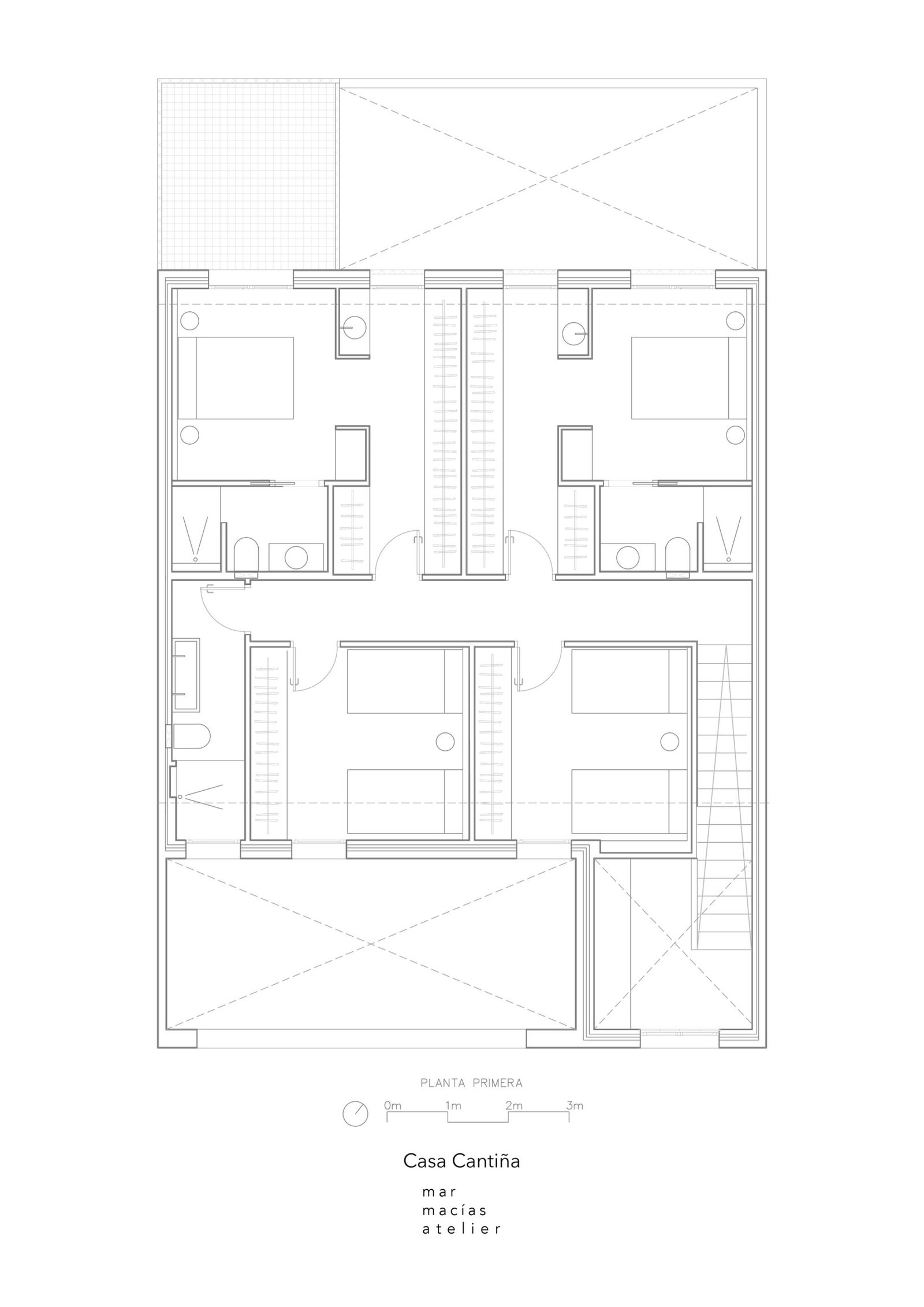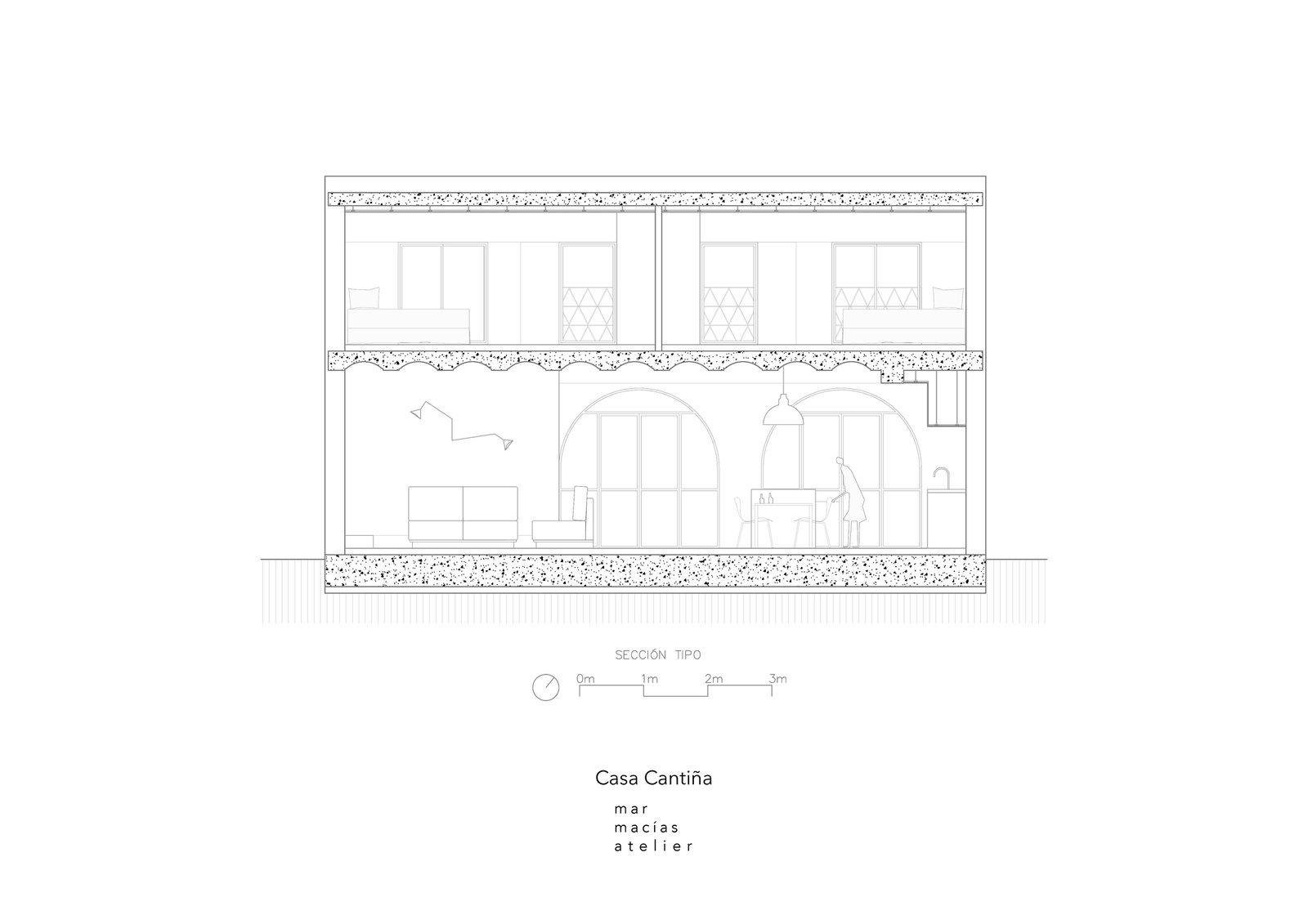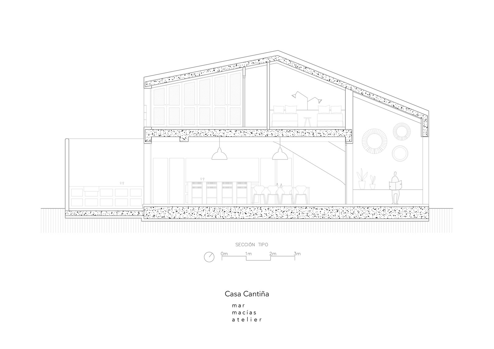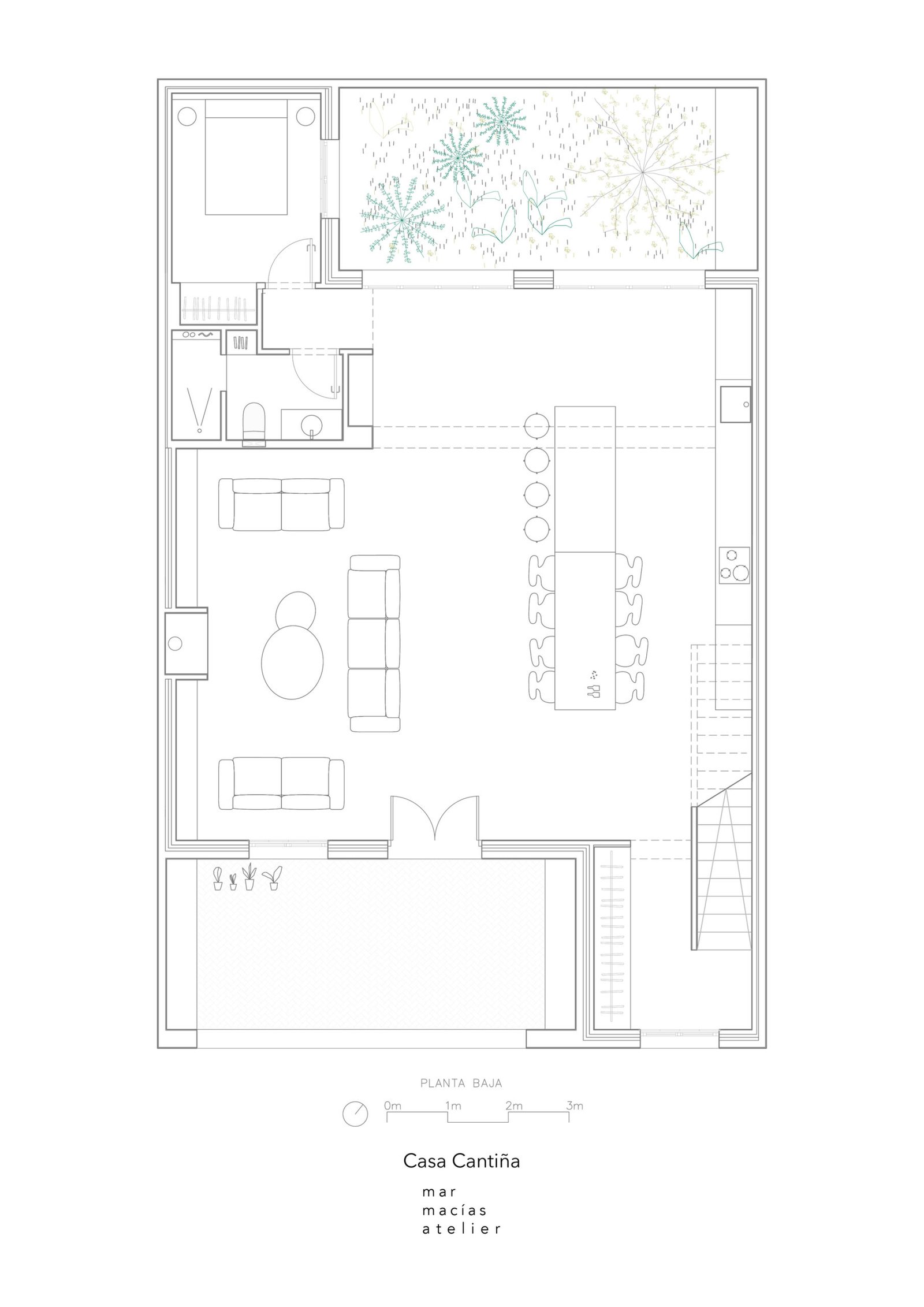 Siendo la planta primera donde se encuentran los dormitorios, es la planta baja donde se desarrolla todo el área social; un gran salón-comedor con chimenea y cocina de obra, y dos patios. El patio delantero, a la sombra del olivo, funciona como «espacio umbral», un espacio que nos acoge antes de entrar a la casa, donde se alargan las mañanas y las noches de verano.