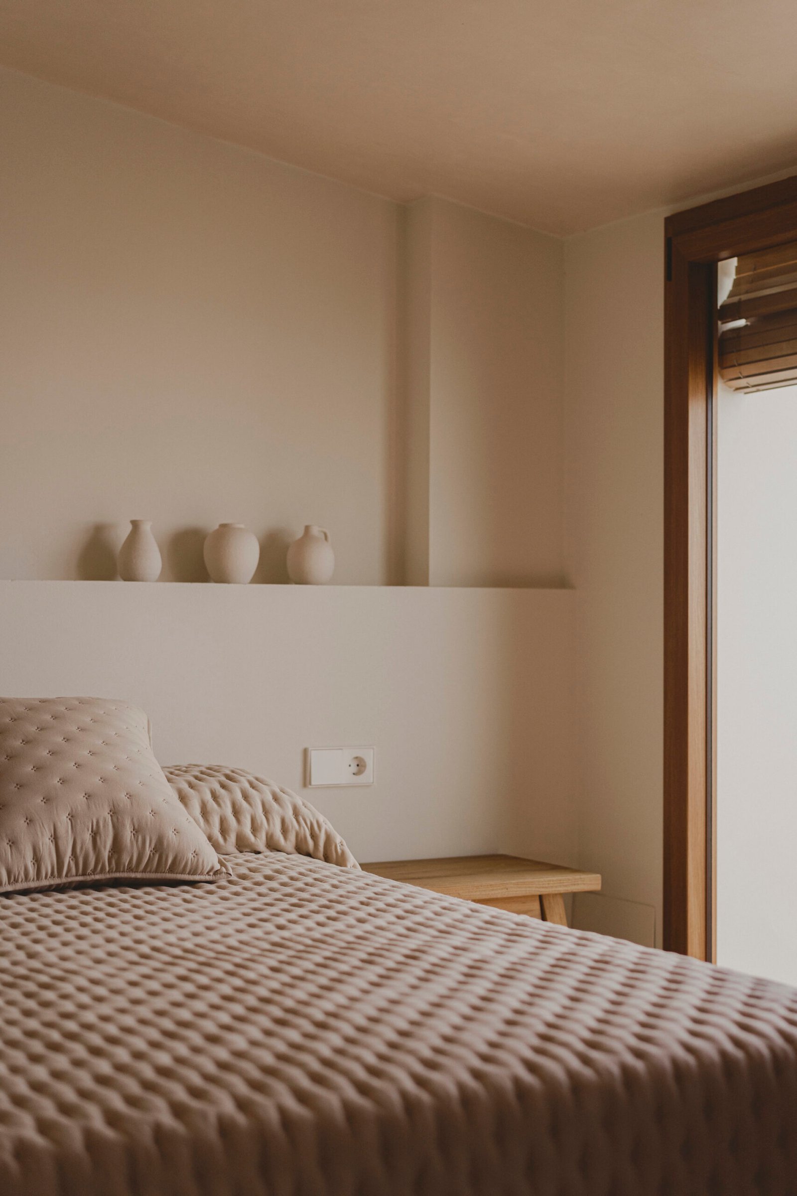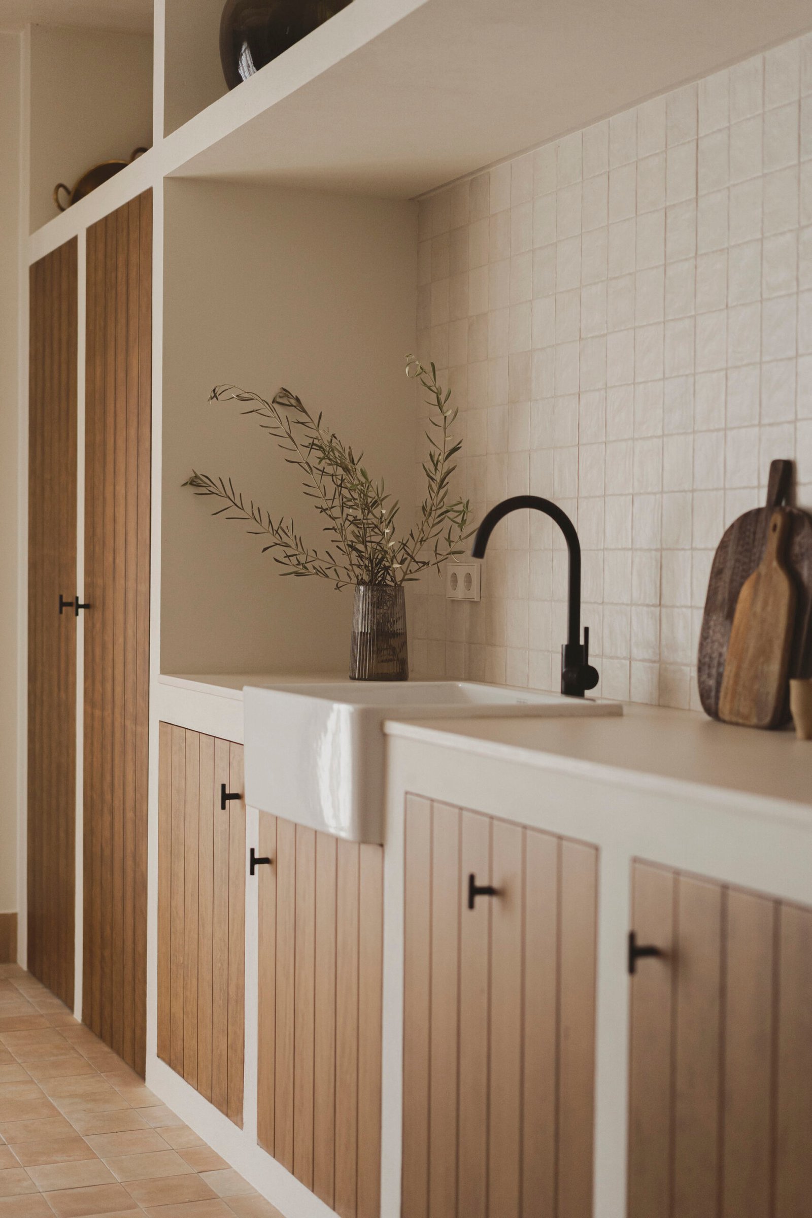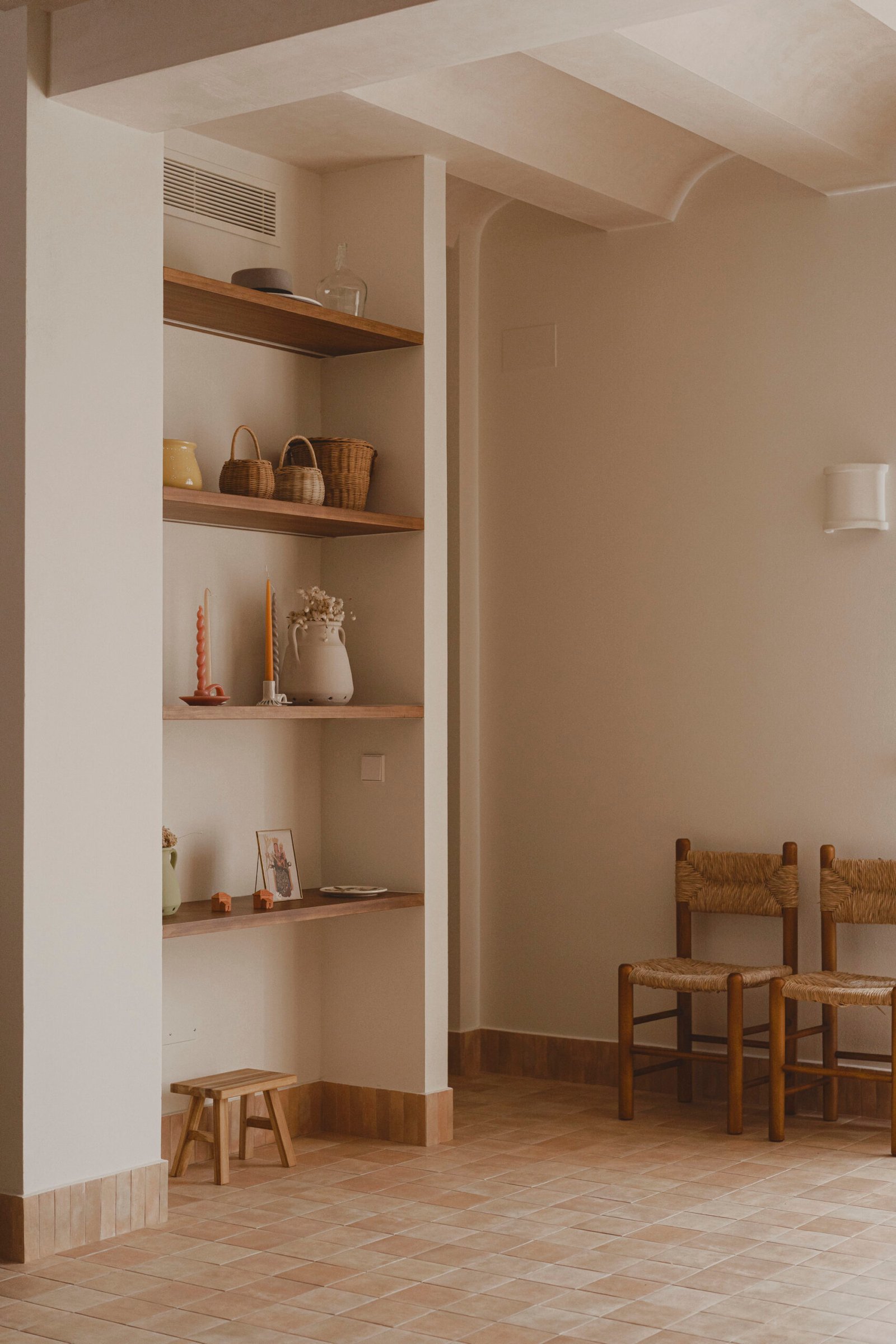El resto de espacios cuenta con un mobiliario prácticamente mínimo e inexistente, donde la propia arquitectura va encontrando hornacinas y huecos, que facilitan el día a día. Casa Cantiña es una casa concebida para alejarse de lo urbano, para detener el tiempo y adentrarse en la calidez de lo cotidiano, la pureza del campo, de la tierra, su verdadera expresión, su esencia.
