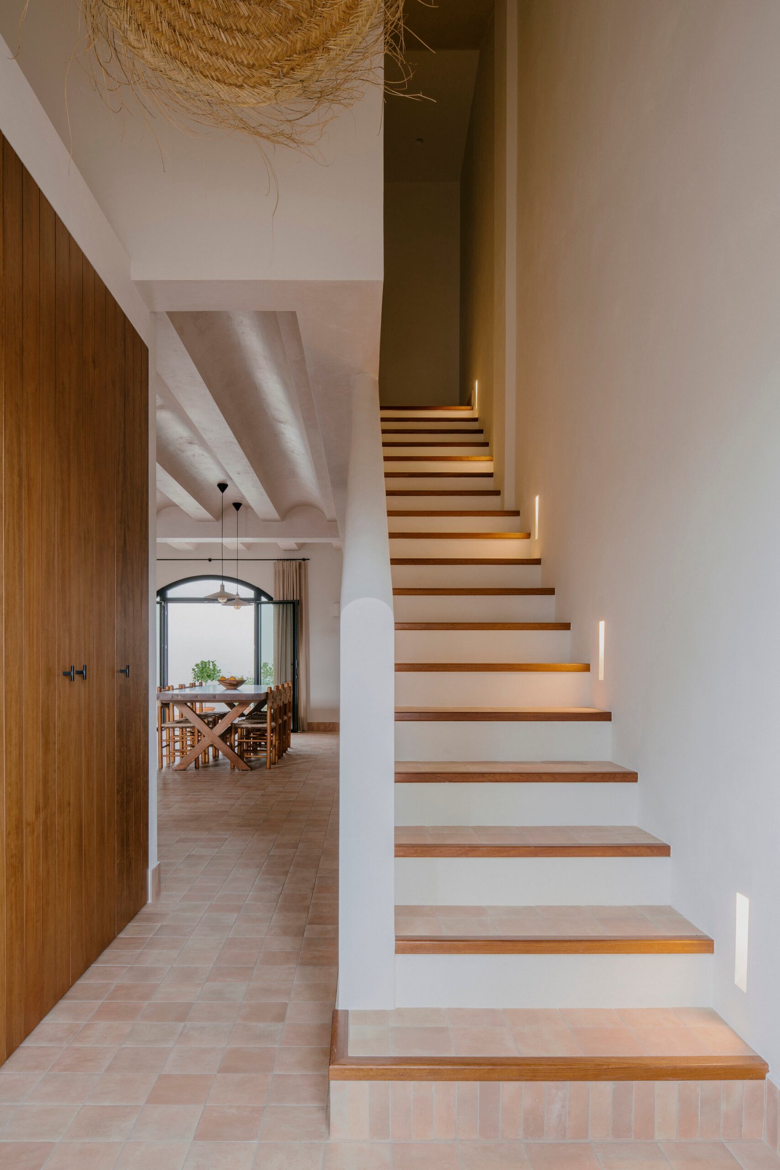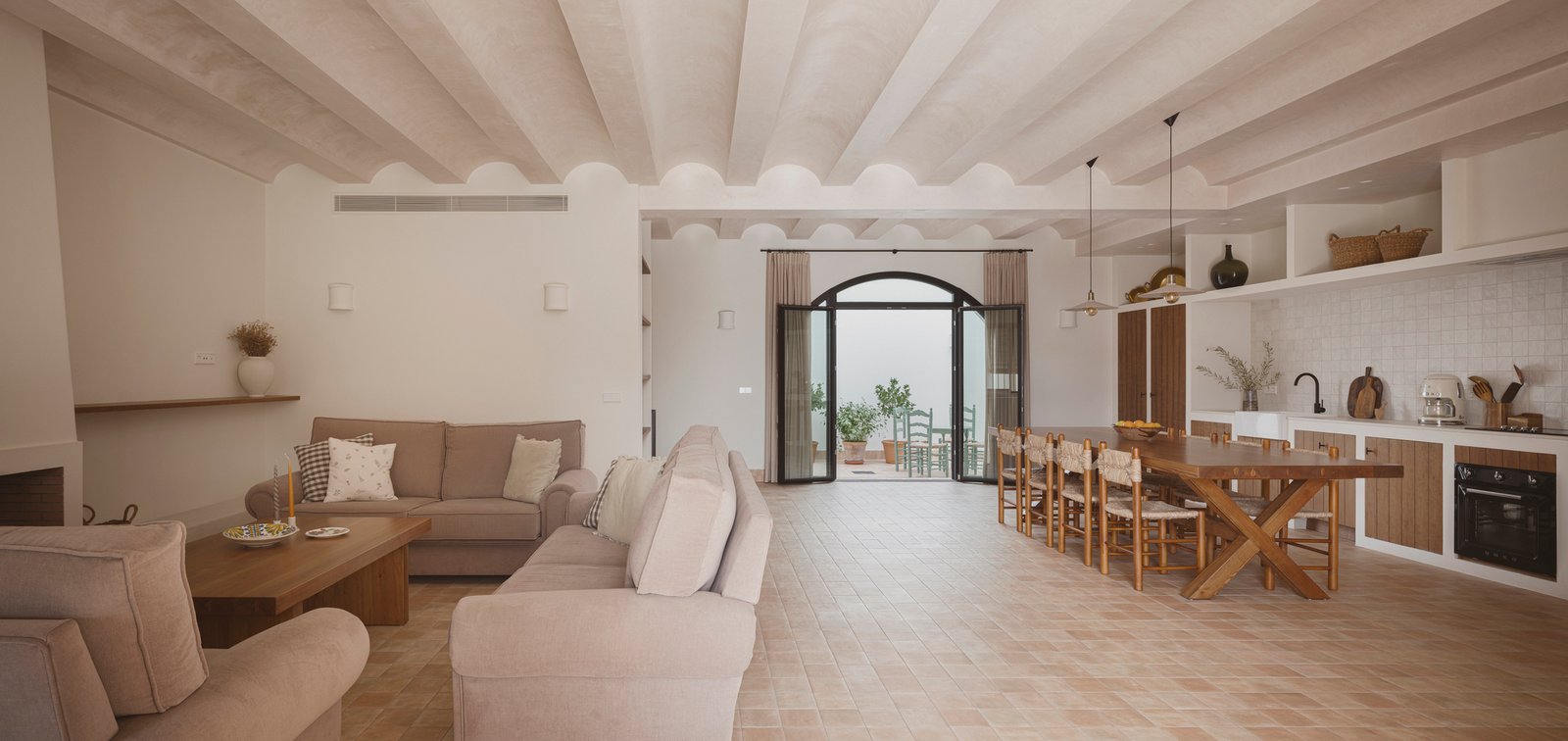 Techos abovedados, acabados con mortero de cal, suelos de barro, apliques cerámicos y carpinterías de madera cuidadosamente estudiadas y ejecutadas por artesanos del lugar. Una vivienda con una distribución sin muchas pretensiones que al igual que una casa de campo tradicional, se abre al exterior, cediendo a estos espacios todo el protagonismo.