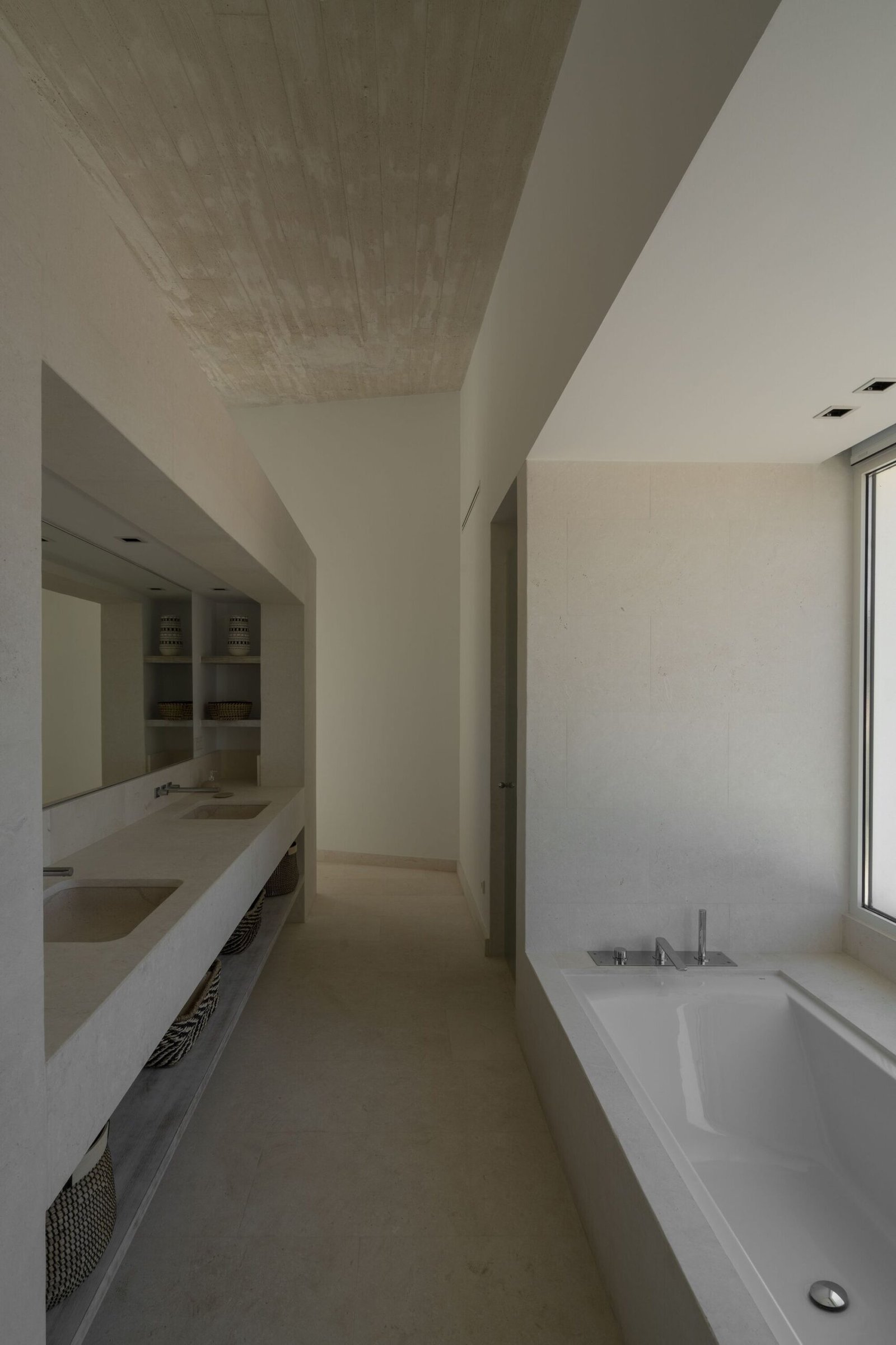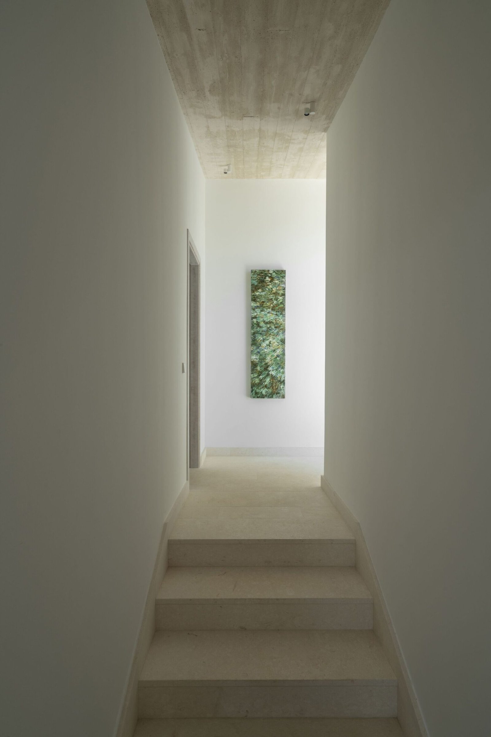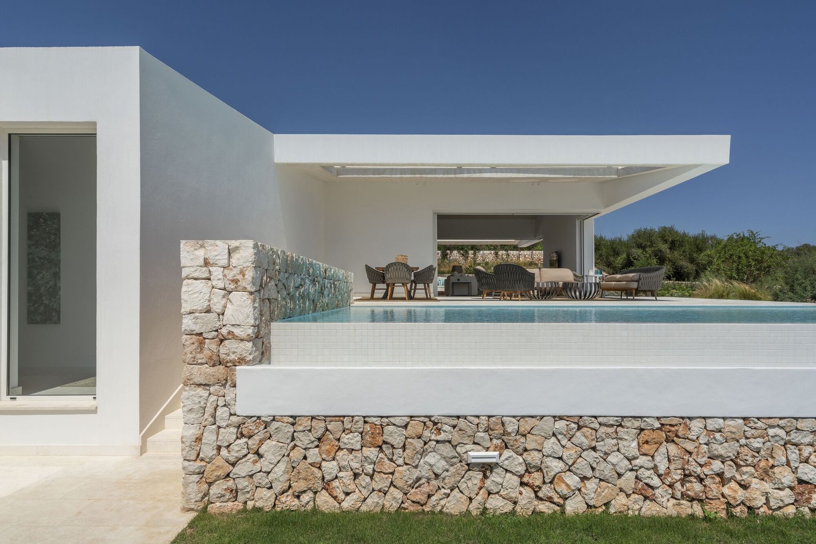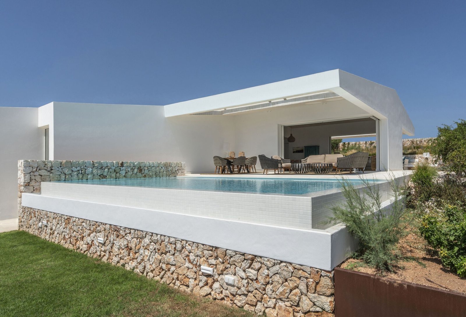 En cuanto a su materialidad, el proyecto alterna dos materiales muy característicos de la isla como son el mortero blanco y los muros de piedra seca, que junto con la cubierta de hormigón blanco visto y el suelo de piedra caliza tienen una clara vocación integradora con el entorno y la historia del lugar.