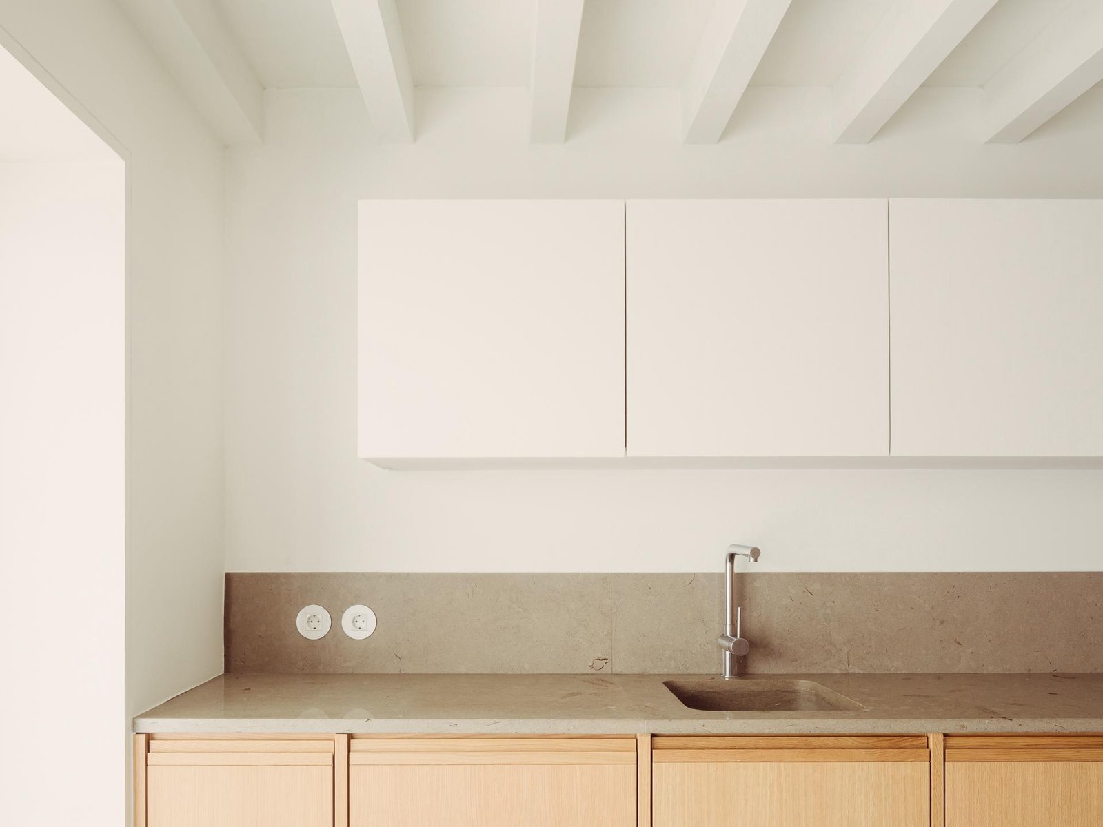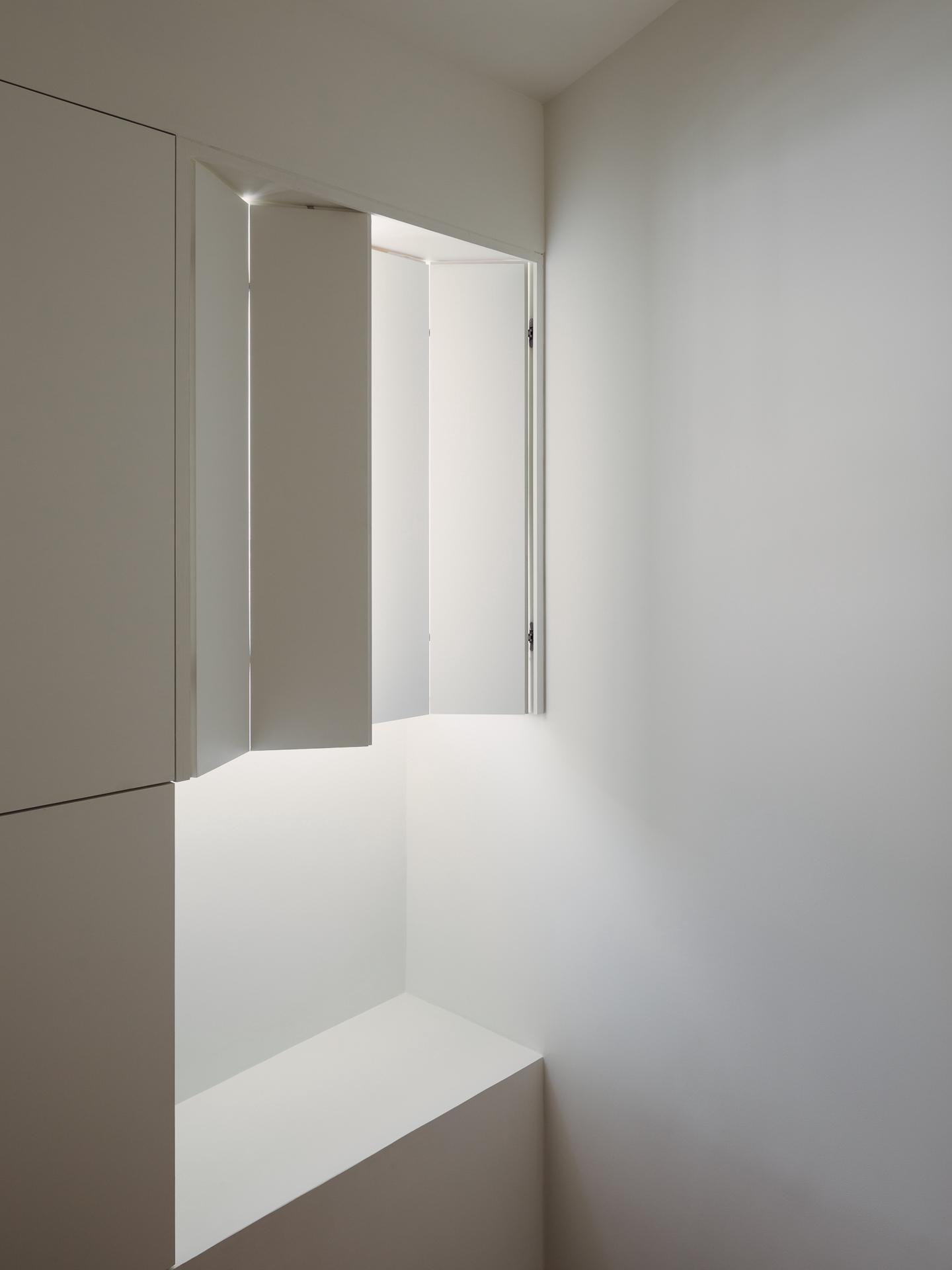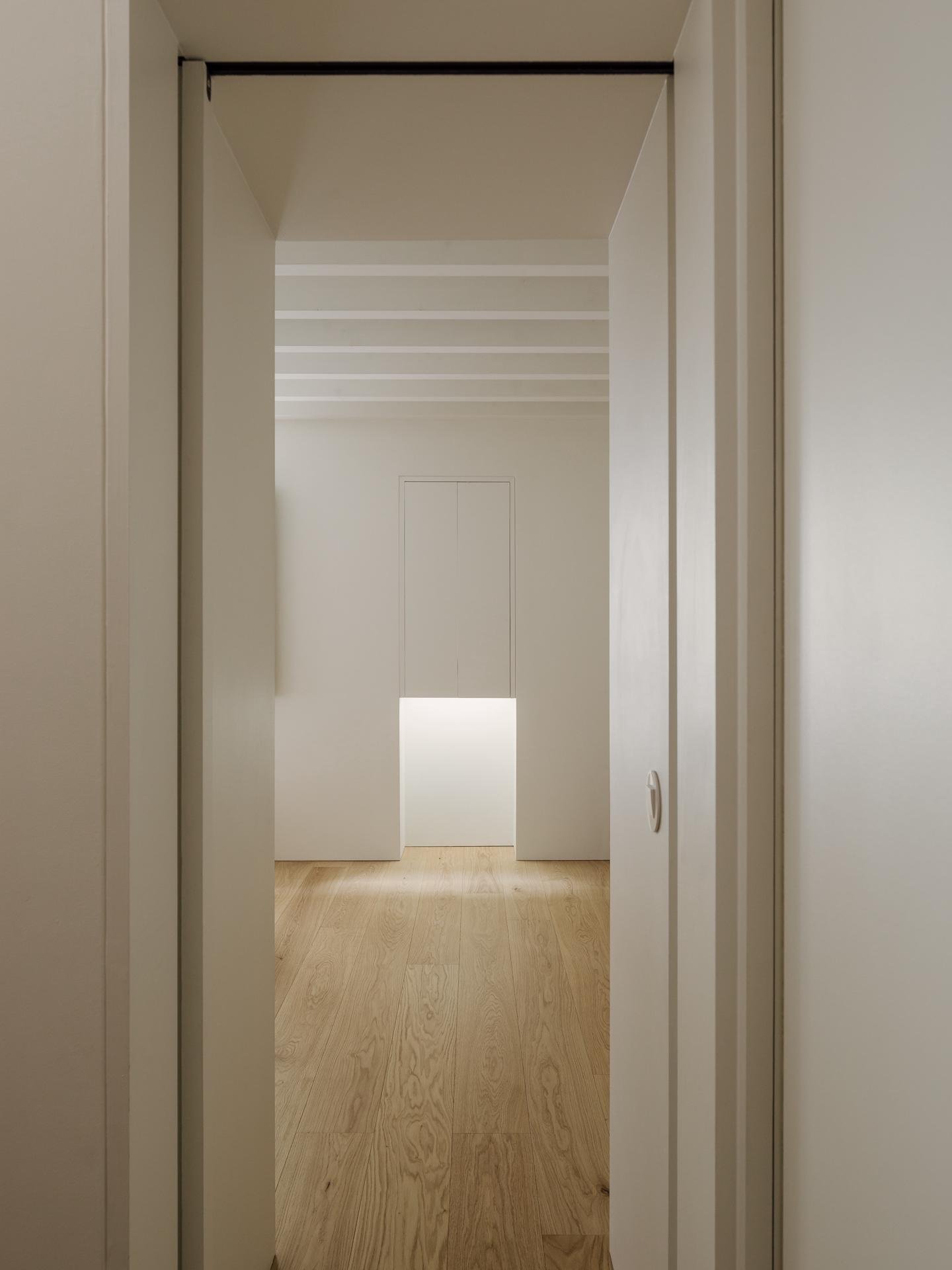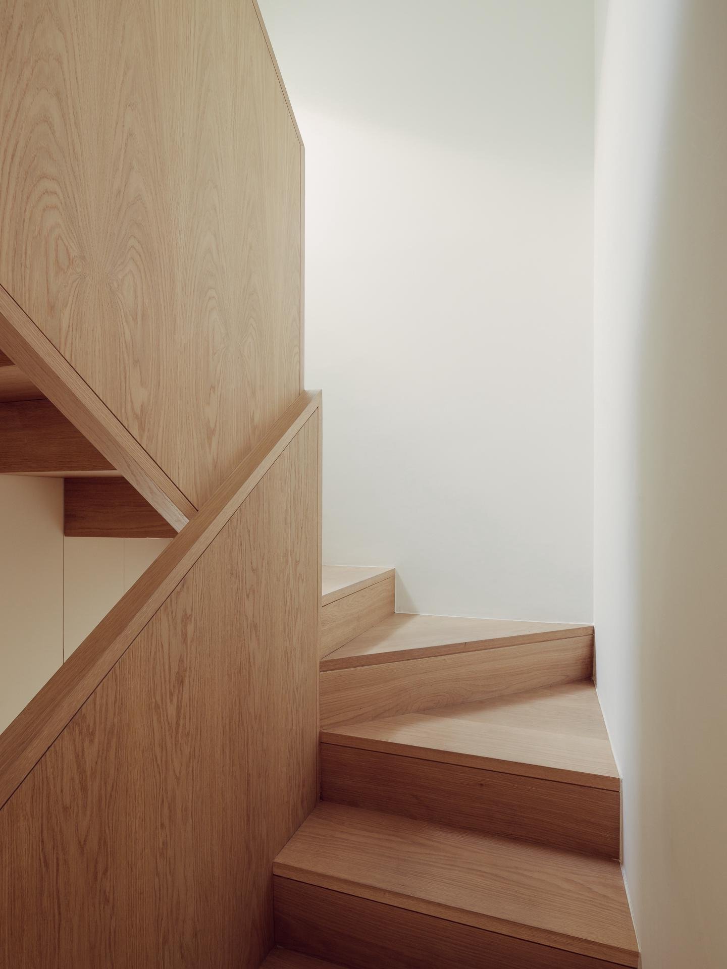 La escalera se sitúa a lo largo de la fachada principal, alineada con un hueco existente que se transformará en un patio de luz, reforzando la experiencia vertical del interior y potenciando la iluminación natural.