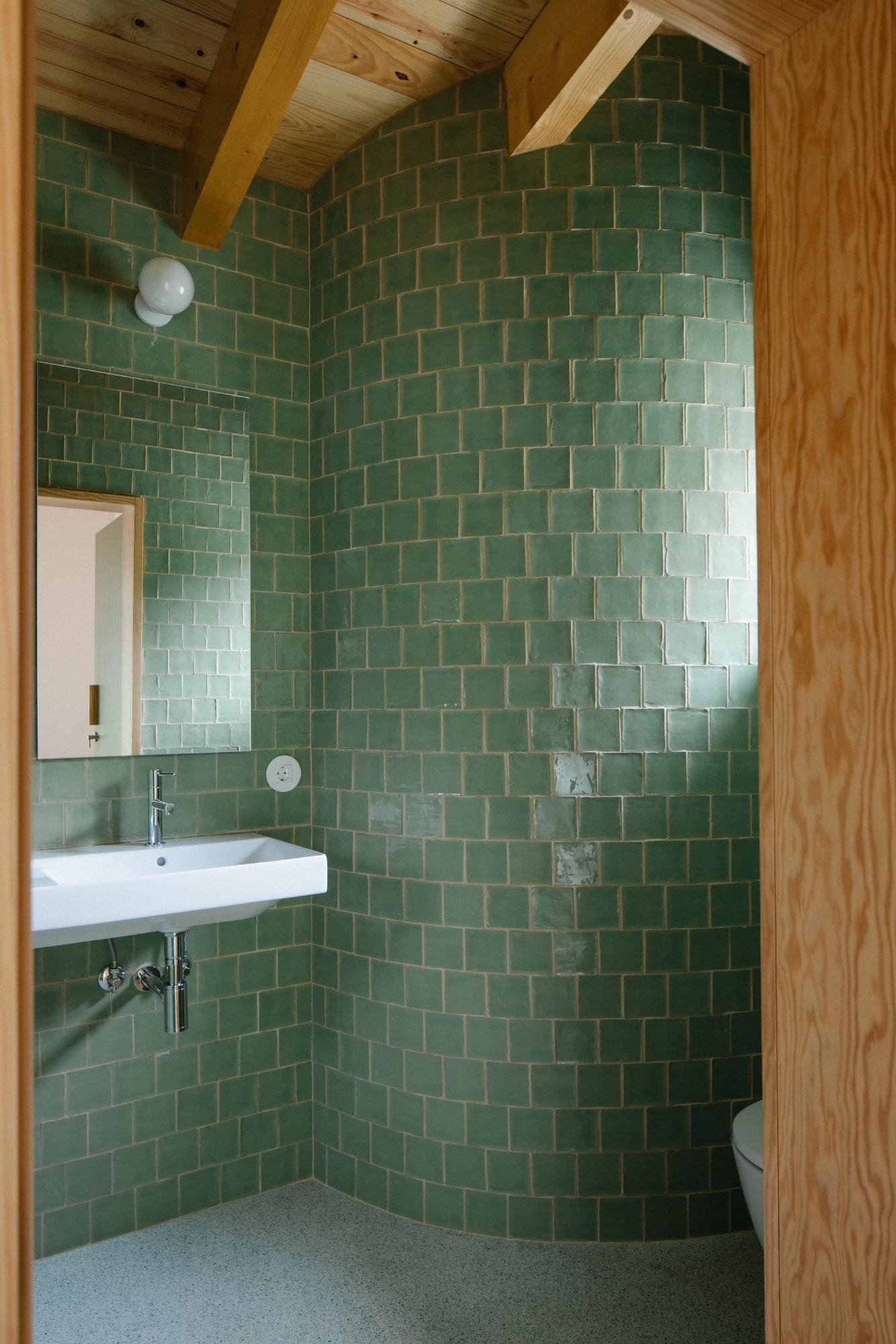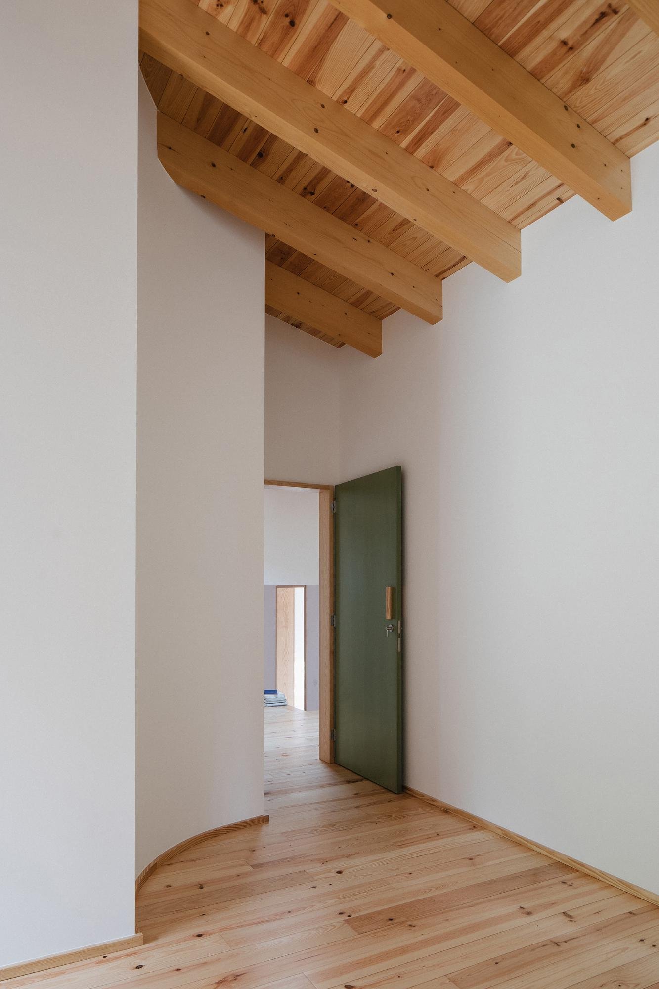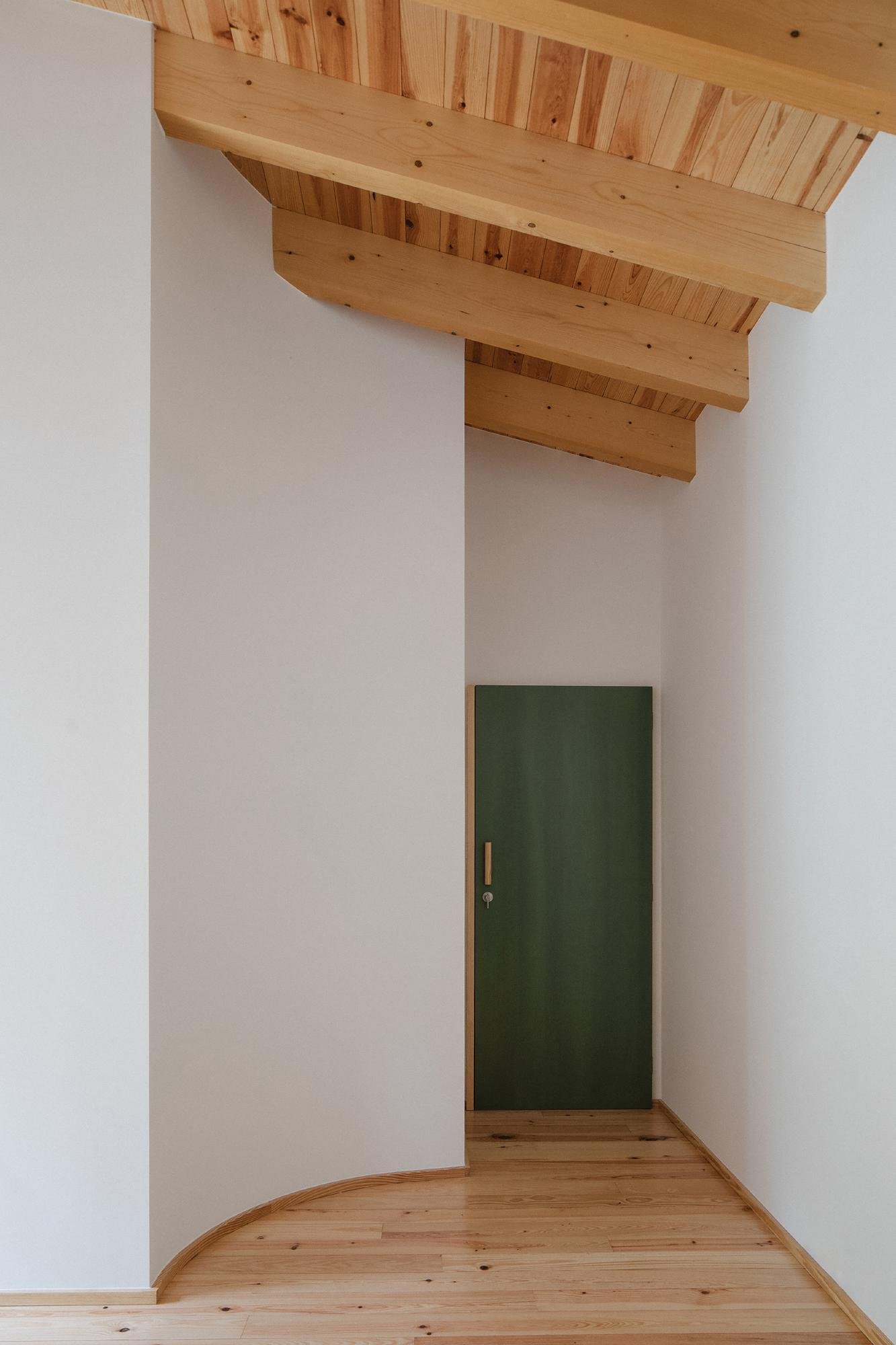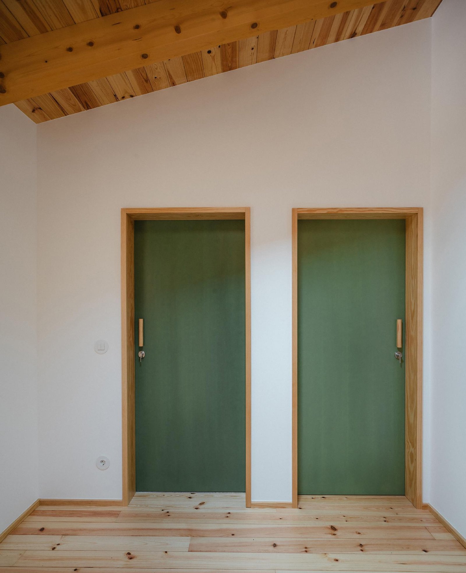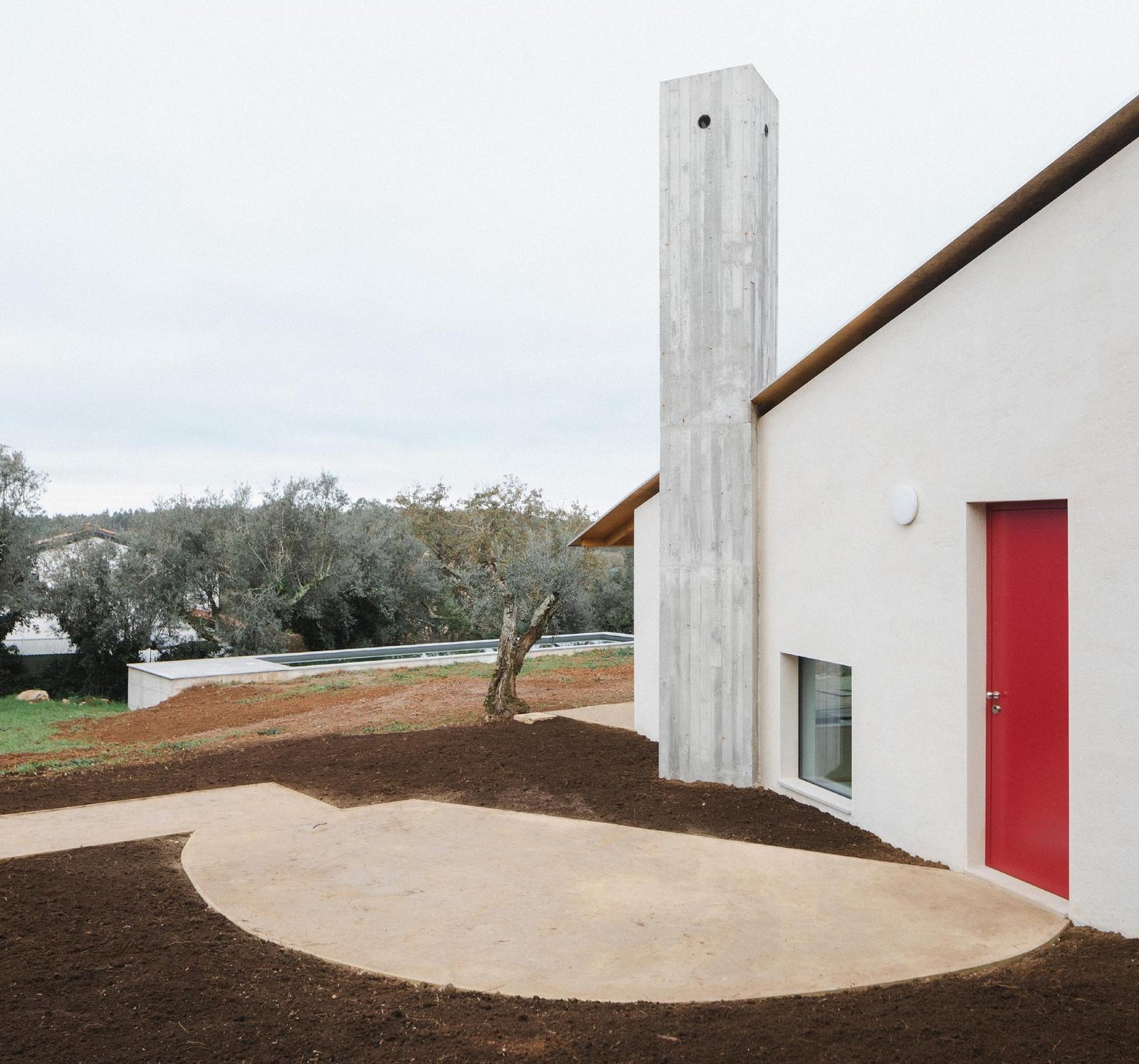 La materialidad establece un diálogo entre tradición e innovación. El revoco blanco, elaborado con cemento blanco y áridos seleccionados, aporta textura y luminosidad al volumen, garantizando protección y durabilidad. El tejado combina gránulos de pizarra con madera, proporcionando solidez e identidad estructural. La austera chimenea contrasta con la ligereza del volumen blanco, mientras que la puerta roja destaca como un llamativo punto de transición.