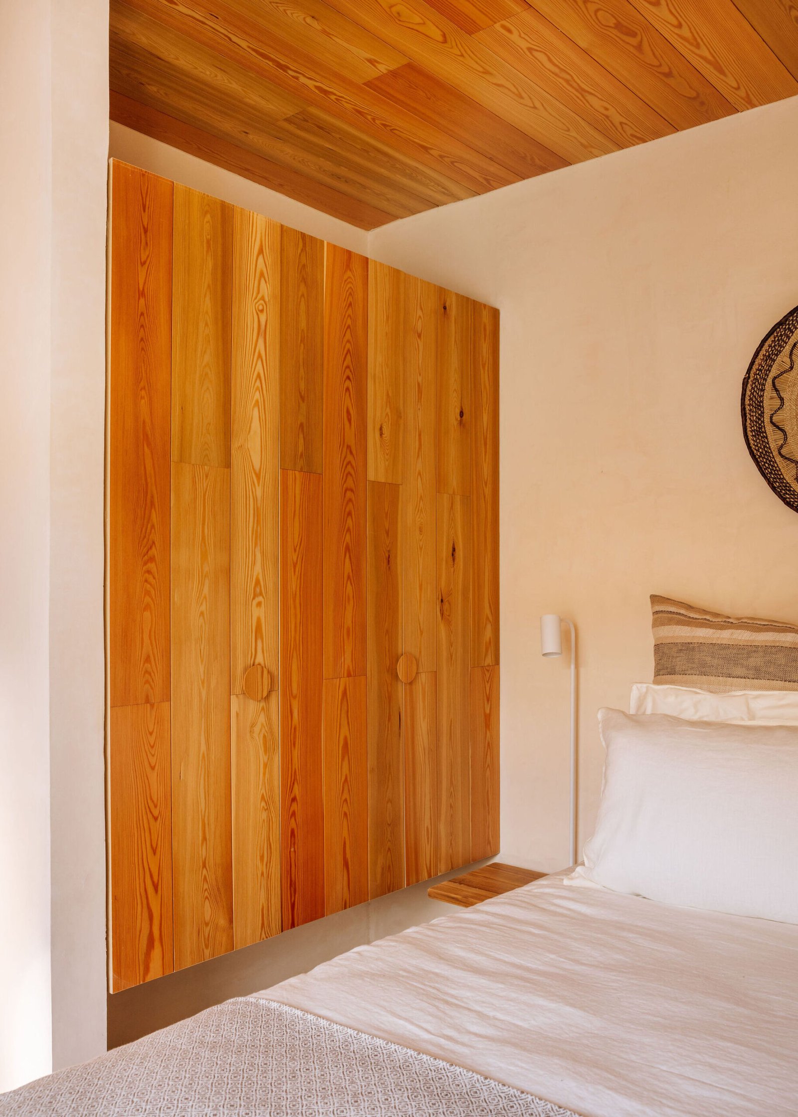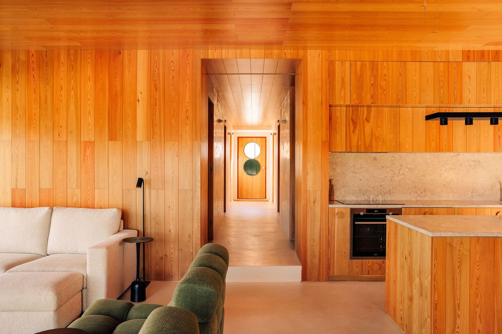 La zona social se amplió a un espacio previamente cubierto que servía de bodega, mientras que la planta baja actual ahora alberga exclusivamente los dormitorios. El antiguo ático, antes utilizado como almacén, se transformó en una suite con acceso a una terraza exterior con vistas a la playa. La antigua cocina se reconvirtió en un nuevo baño y la chimenea original se reinventó como fuente de luz cenital.