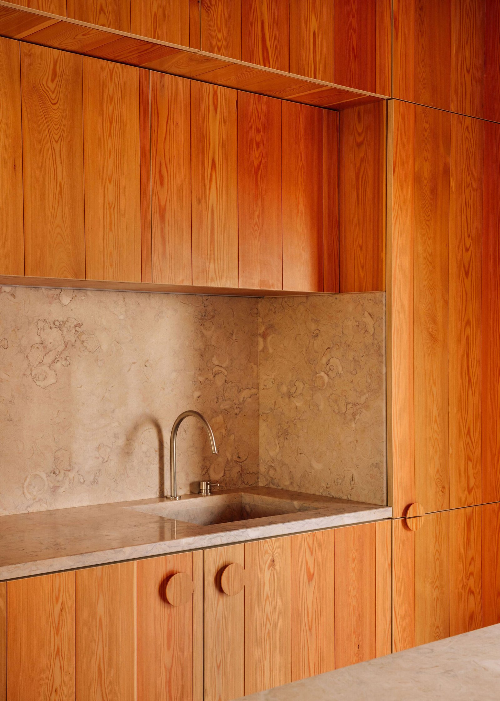 Se conservaron las fachadas y los muros interiores originales, mientras que las áreas recientemente ampliadas se revistieron con tablas de madera, creando un diálogo con la mampostería de piedra existente, ahora revestida con yeso veneciano. Este contraste resalta los distintos períodos de intervención y aporta profundidad a la narrativa espacial.