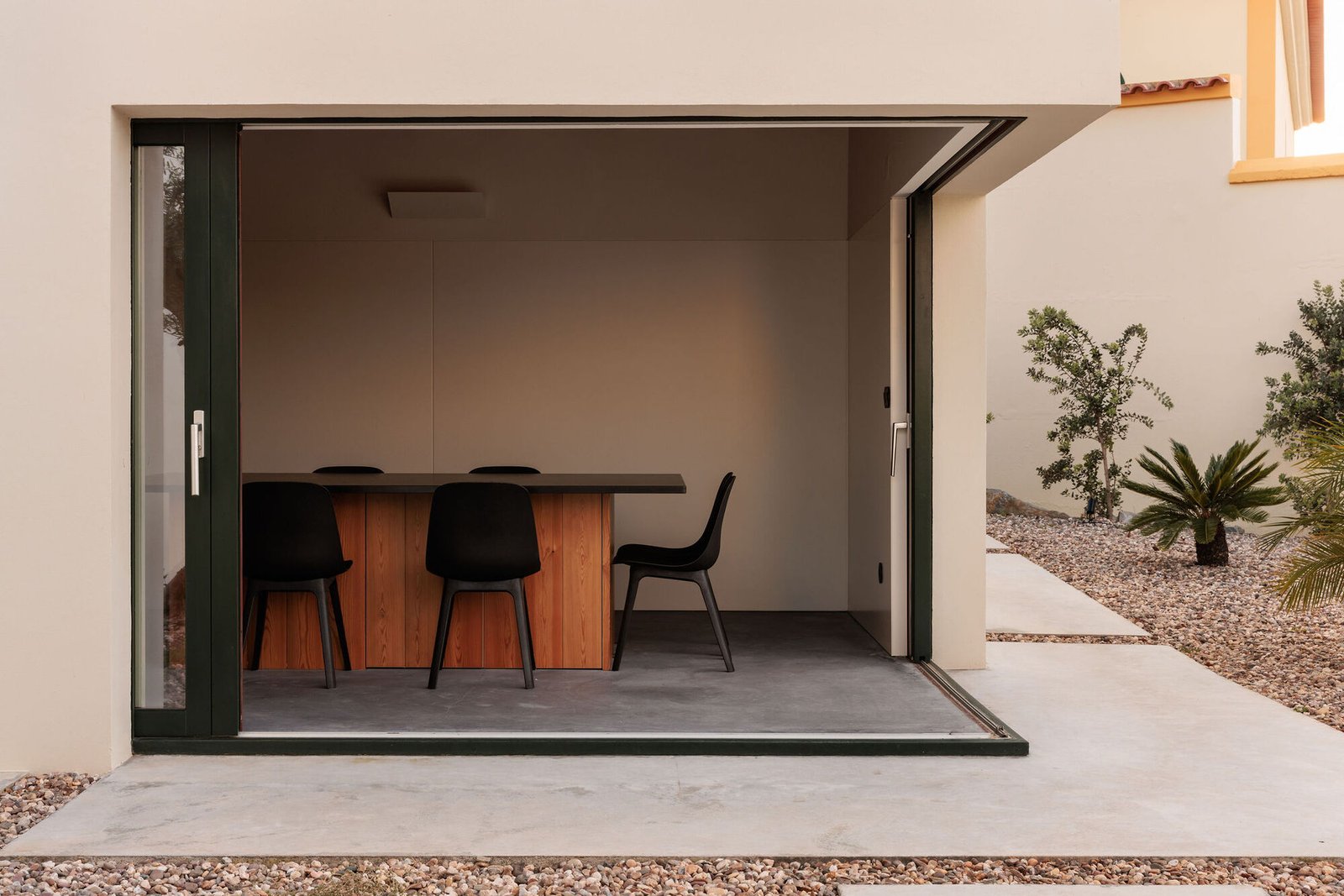 El antiguo horno de leña se abrió al jardín, estableciendo una nueva relación con el exterior e integrando una pequeña piscina y losas de hormigón que definen los usos exteriores.