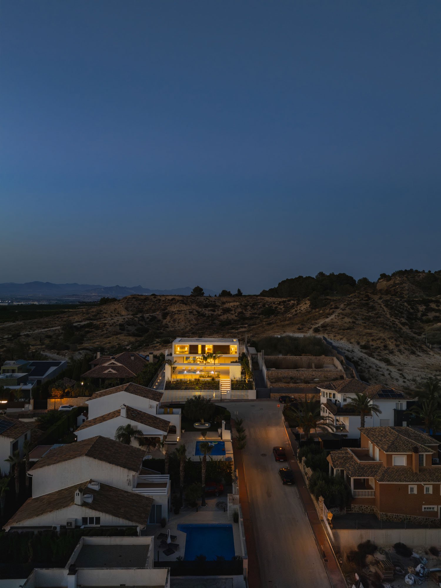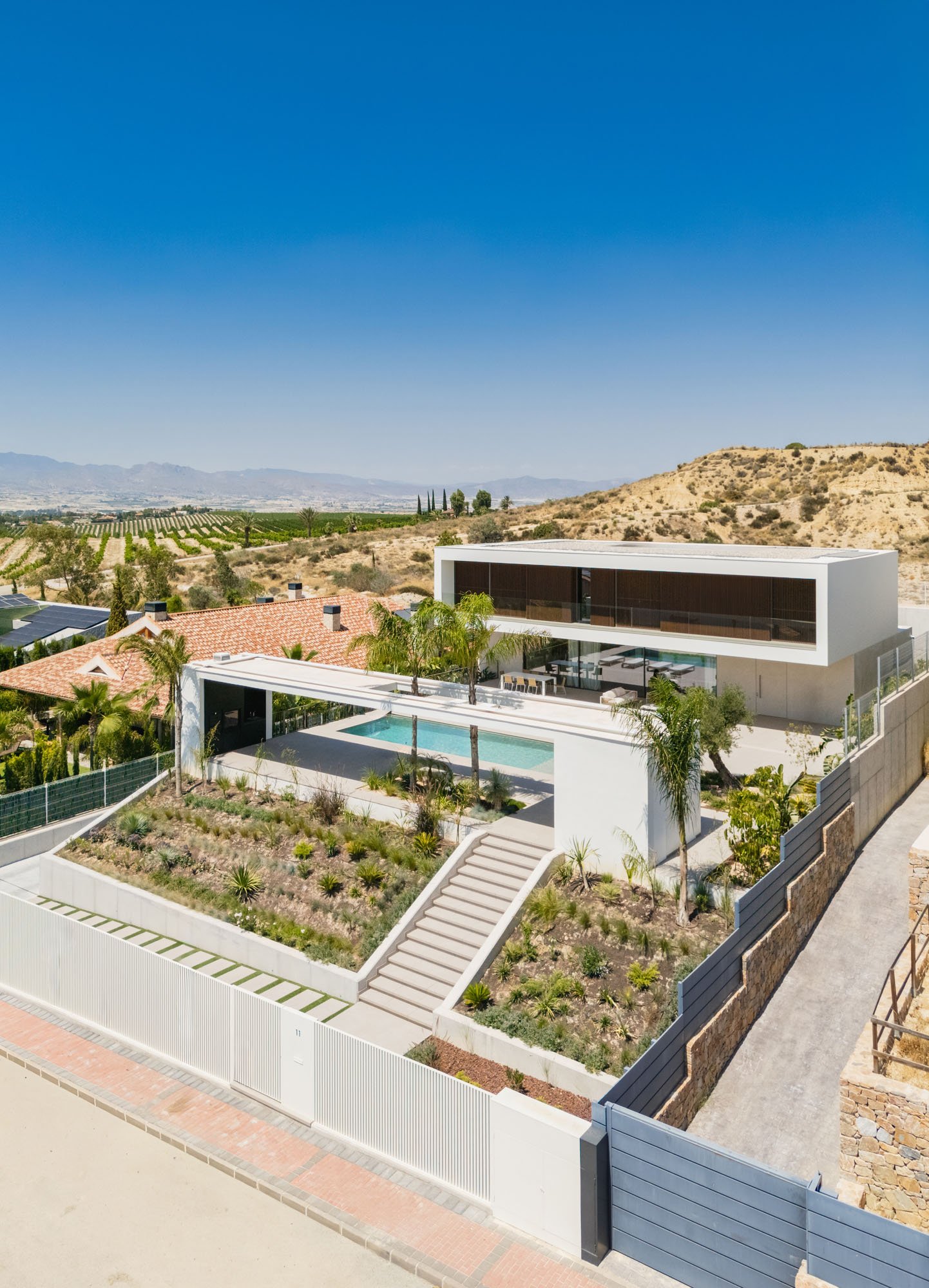 Ubicada en un terreno elevado, el diseño de volúmenes desplazados y direccionalidad de las aperturas de la vivienda responde a la necesidad básica de privacidad con respecto a las parcelas adyacentes.