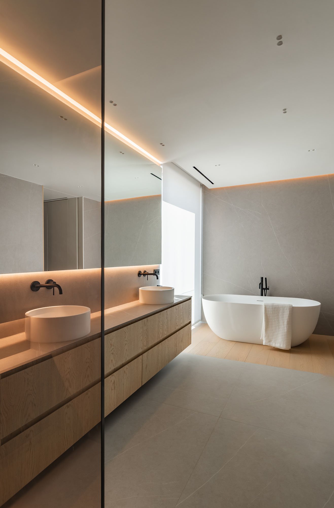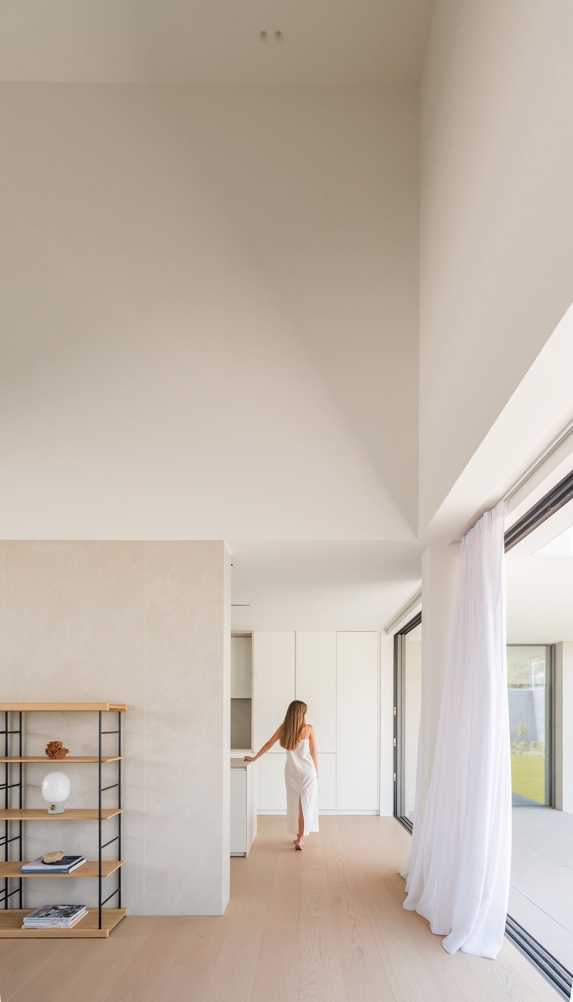 Los interiores rompen con los colores neutros del exterior presentando un ambiente cálido y diáfano. Los espacios se resuelven con materiales naturales como la madera o la piedra que invitan al cambio de ritmo y el descanso.