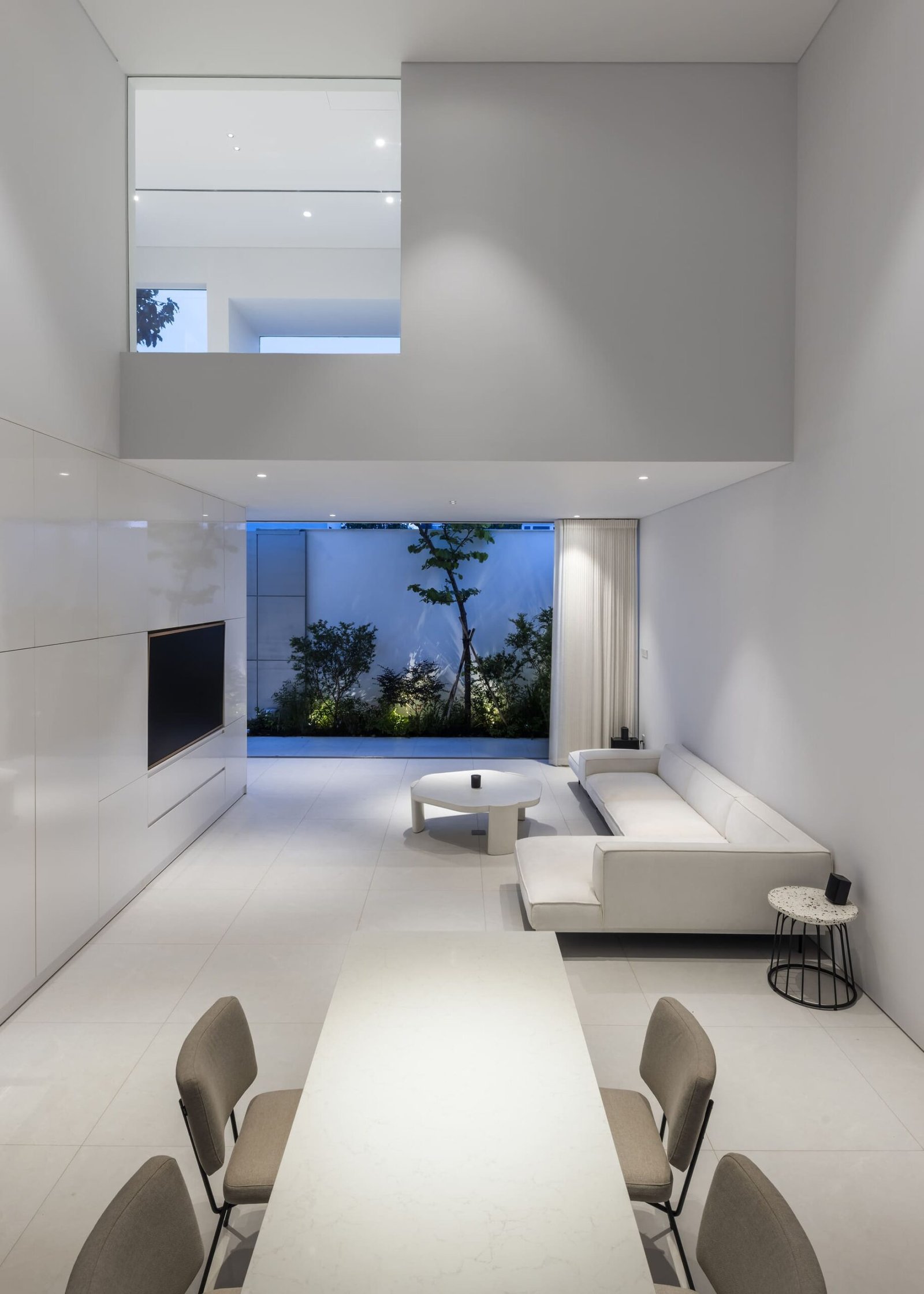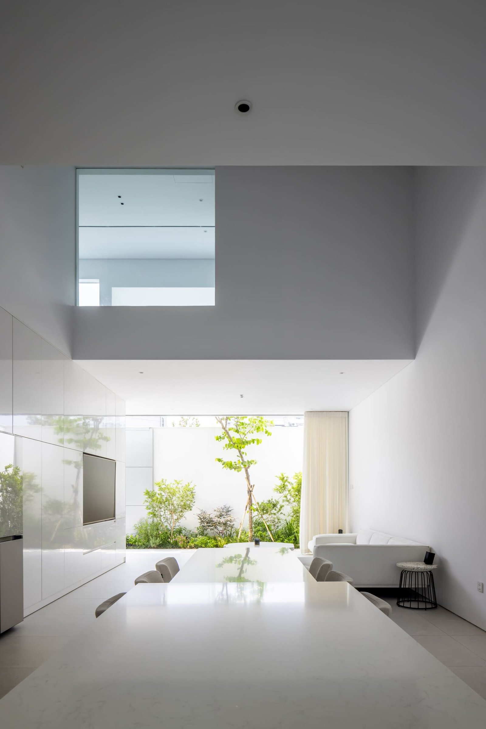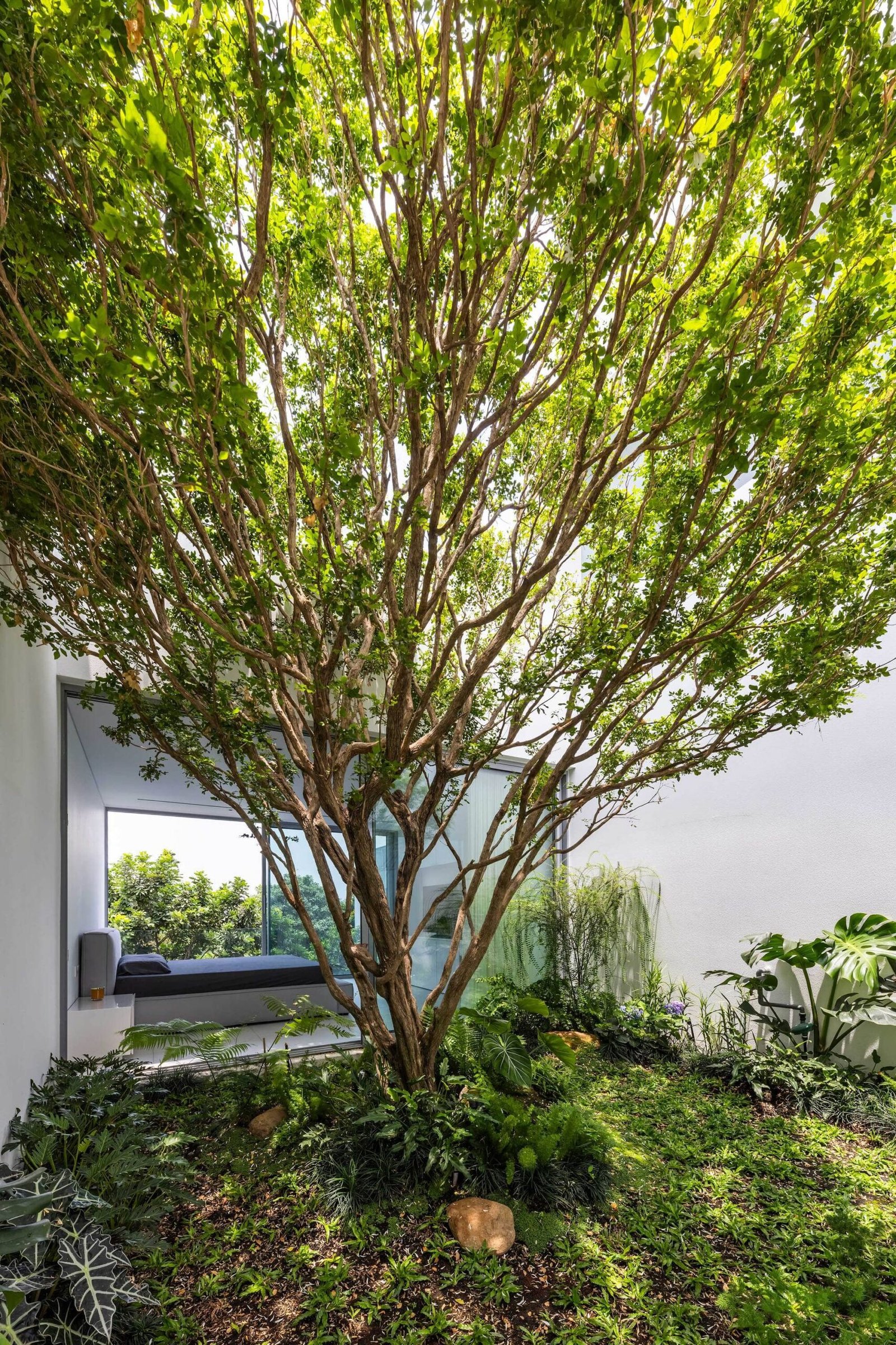 • Tercera planta: dedicada a la pareja propietaria, centrada en un patio ajardinado central que conecta los espacios de estar, meditación y trabajo. Los volúmenes tipo veranda disuelven los límites interior-exterior, impregnando la vivienda con la naturaleza para generar una atmósfera siempre fresca y reparadora.