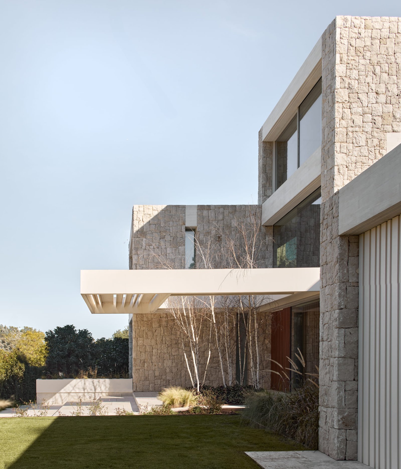 La casa se concibe como un contenedor robusto, sólido y macizo que envuelve un interior fluido, luminoso y brillante. Se propone un juego de contrastes complementarios, generando una volumetría similar a la de una fortaleza y un refugio. Los volúmenes de piedra se alargan y estilizan mediante voladizos extendidos que sirven de contrapunto a las diferentes alturas de la villa.
