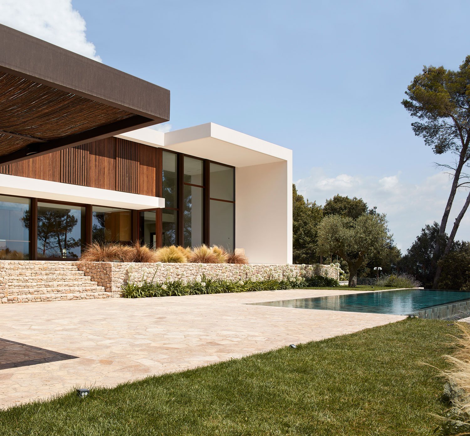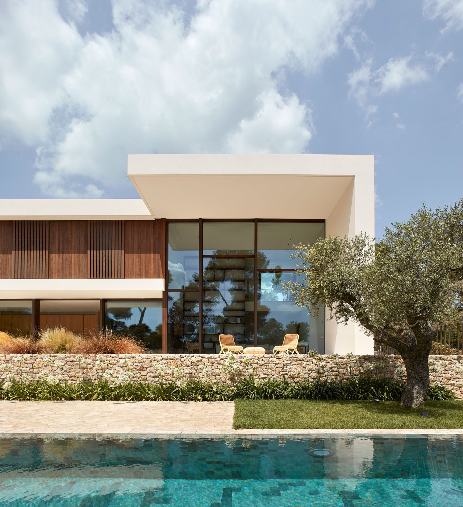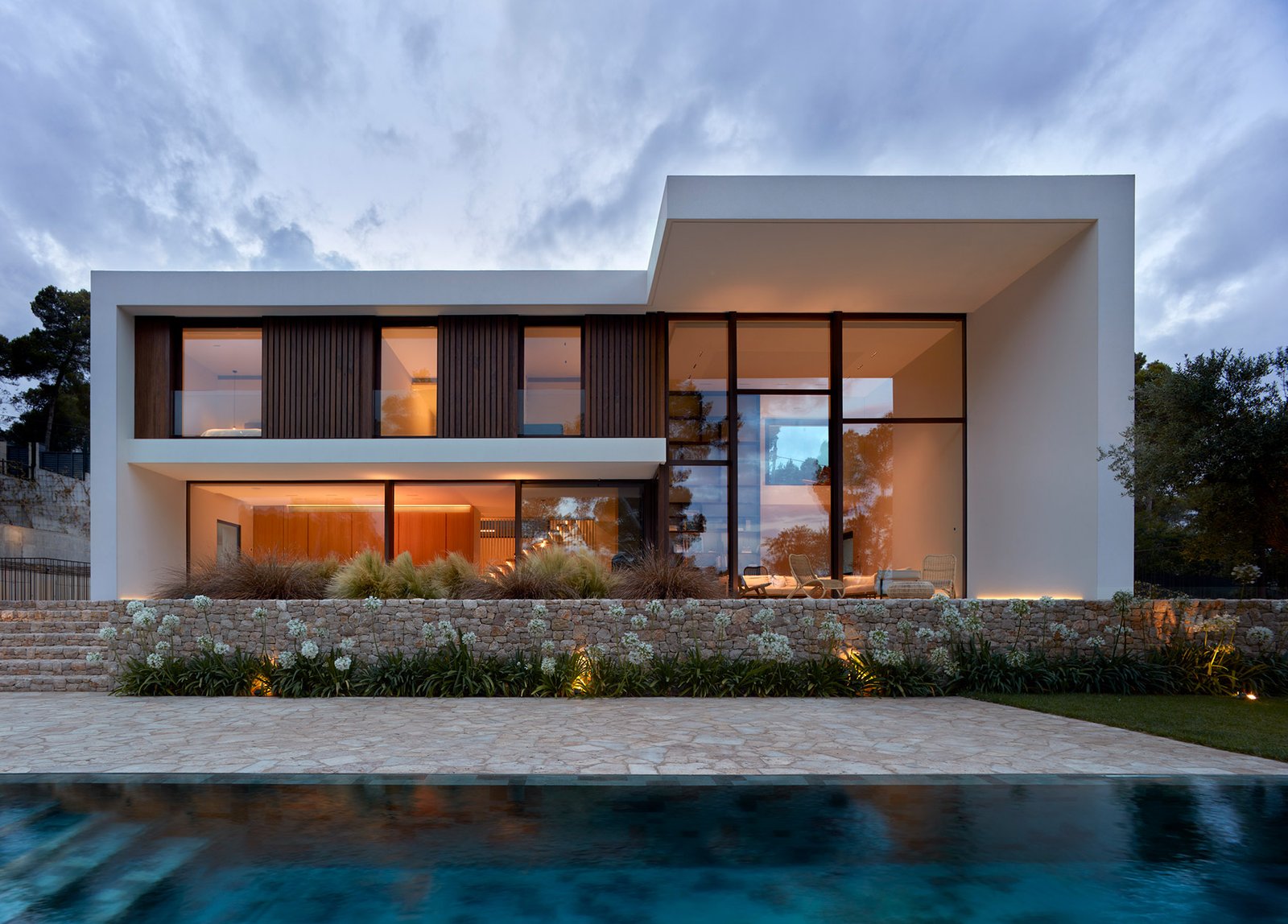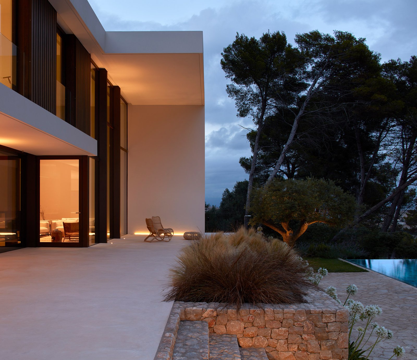 Debido a la pendiente tan pronunciada y a los condicionantes de la normativa se decide compactar la vivienda para liberar el máximo espacio de la parcela y cedérselo al jardín. El volumen se quiebra para adaptarse mejor a la pendiente. Con el mismo objetivo se diseñan diferentes terrazas con las estancias exteriores como la piscina, la barbacoa, una zona de juegos y varias zonas de jardín. Mediante la materialidad se busca la máxima integración en el paisaje. Para el hormigón de la envolvente se utiliza una tonalidad blanco roto, como la piedra del lugar. Las maderas utilizadas en el exterior y el acero corten recuerdan a los troncos de los árboles. En el interior se utiliza una madera más clara, para darle luminosidad y calidez a la vivienda.