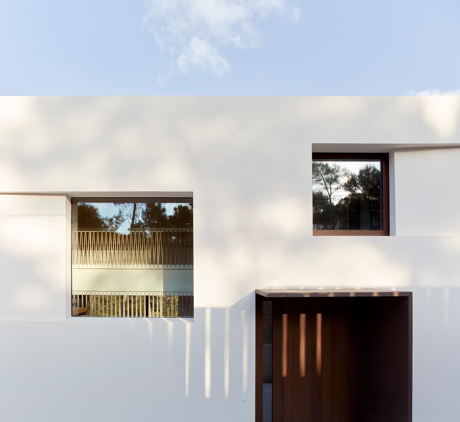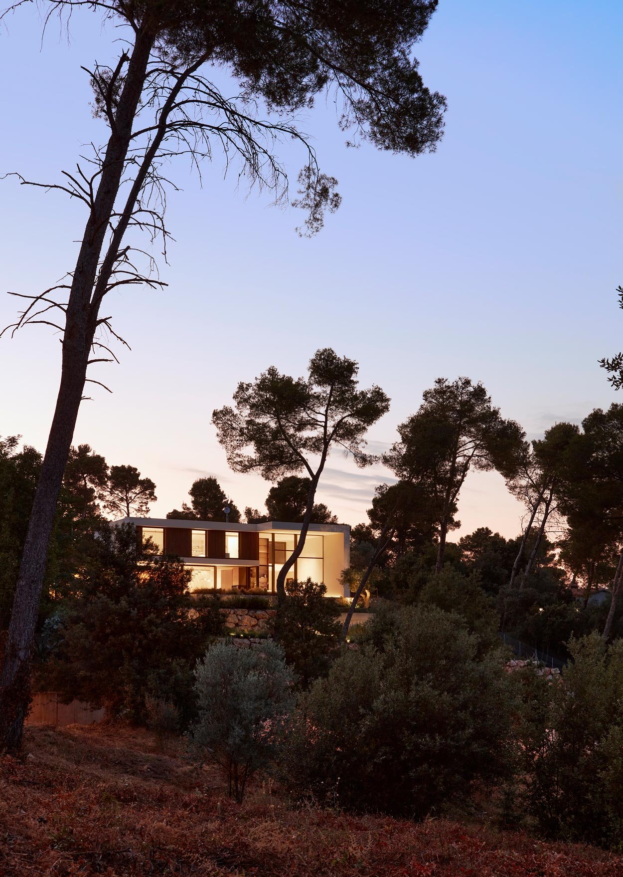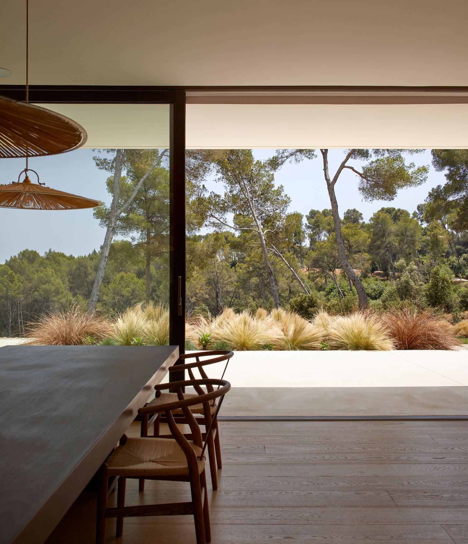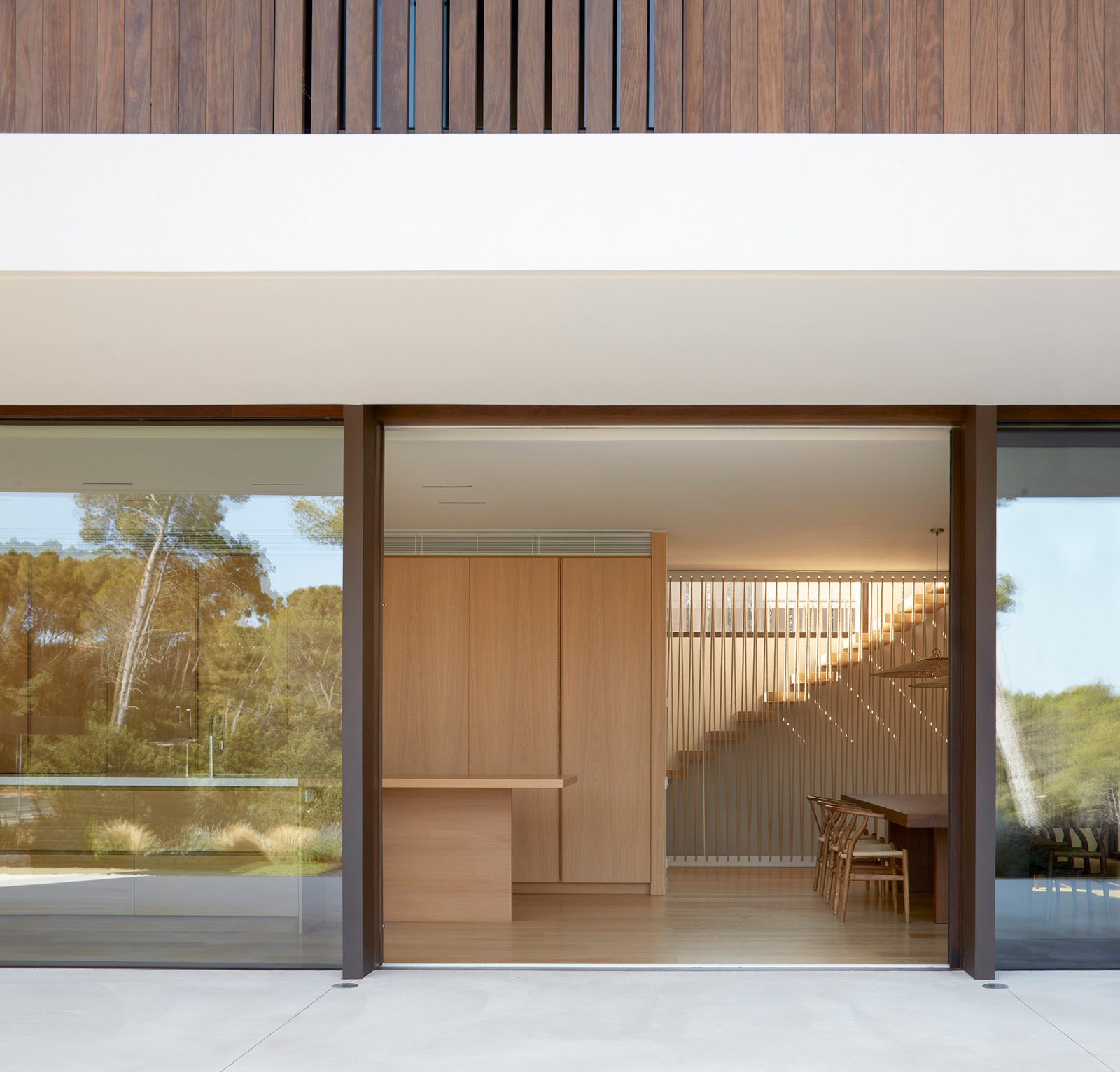 Se estudia cada apertura de la envolvente de hormigón con el objetivo de enmarcar las vistas controladas de la parcela desde las diferentes estancias. En cambio, en la fachada que se abre a la pendiente la naturaleza irrumpe en el centro de la vivienda y adquiere todo el protagonismo.