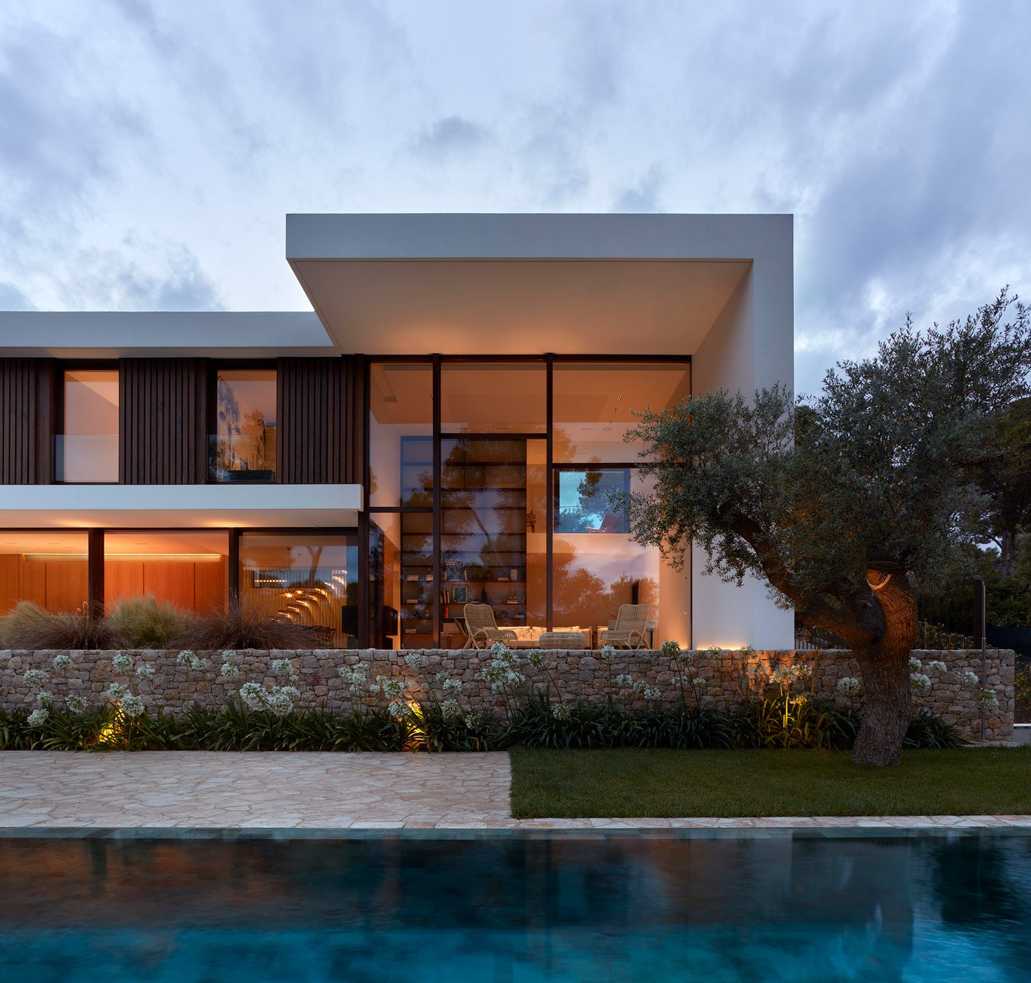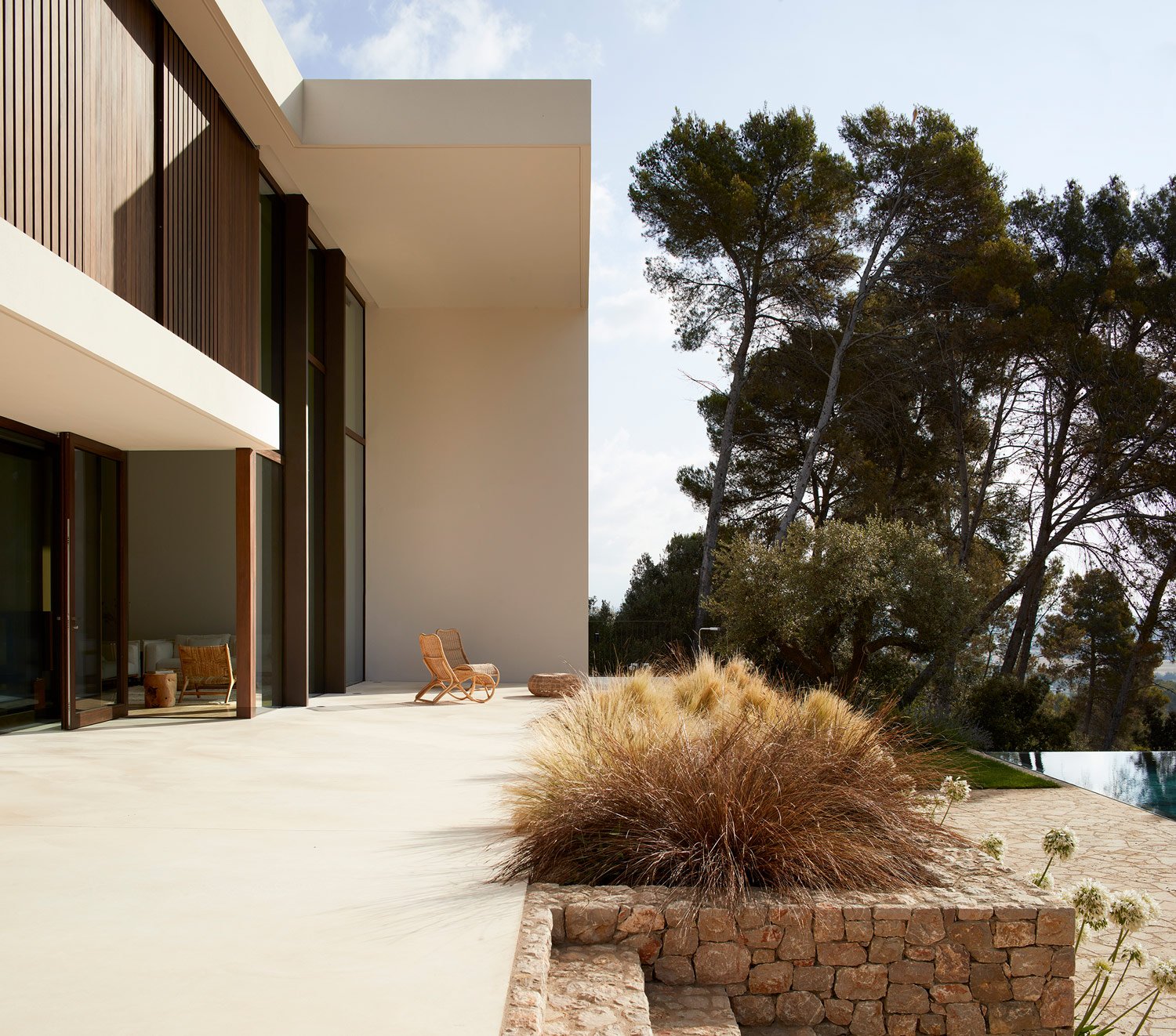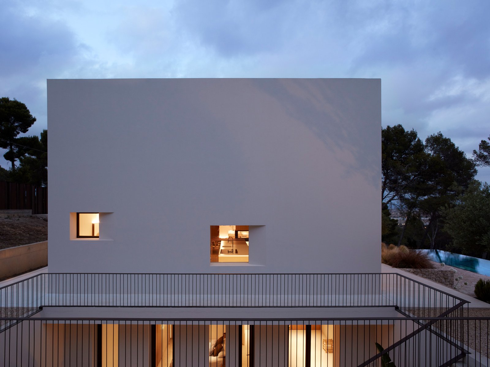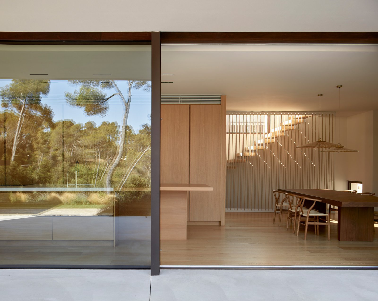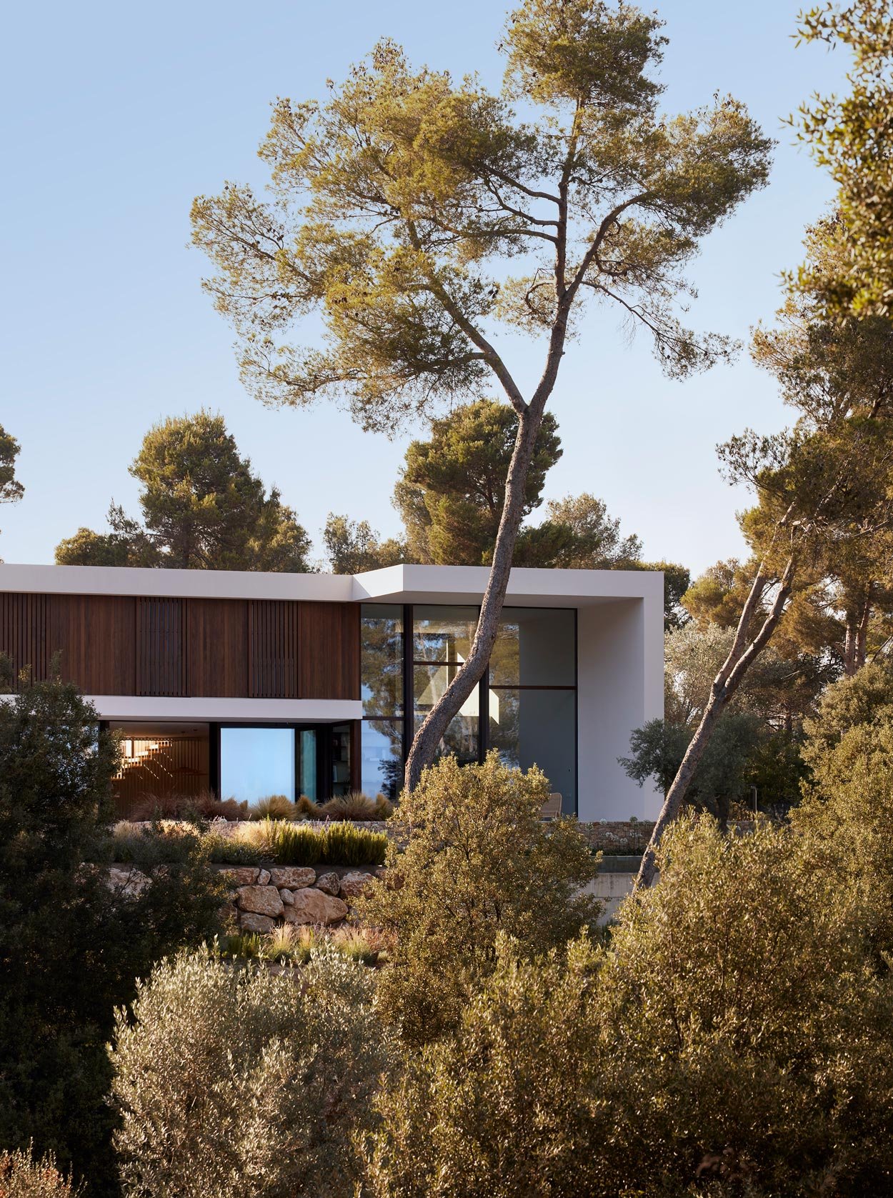 Se estudia cada apertura de la envolvente de hormigón con el objetivo de enmarcar las vistas controladas de la parcela desde las diferentes estancias. En cambio, en la fachada que se abre a la pendiente la naturaleza irrumpe en el centro de la vivienda y adquiere todo el protagonismo.
