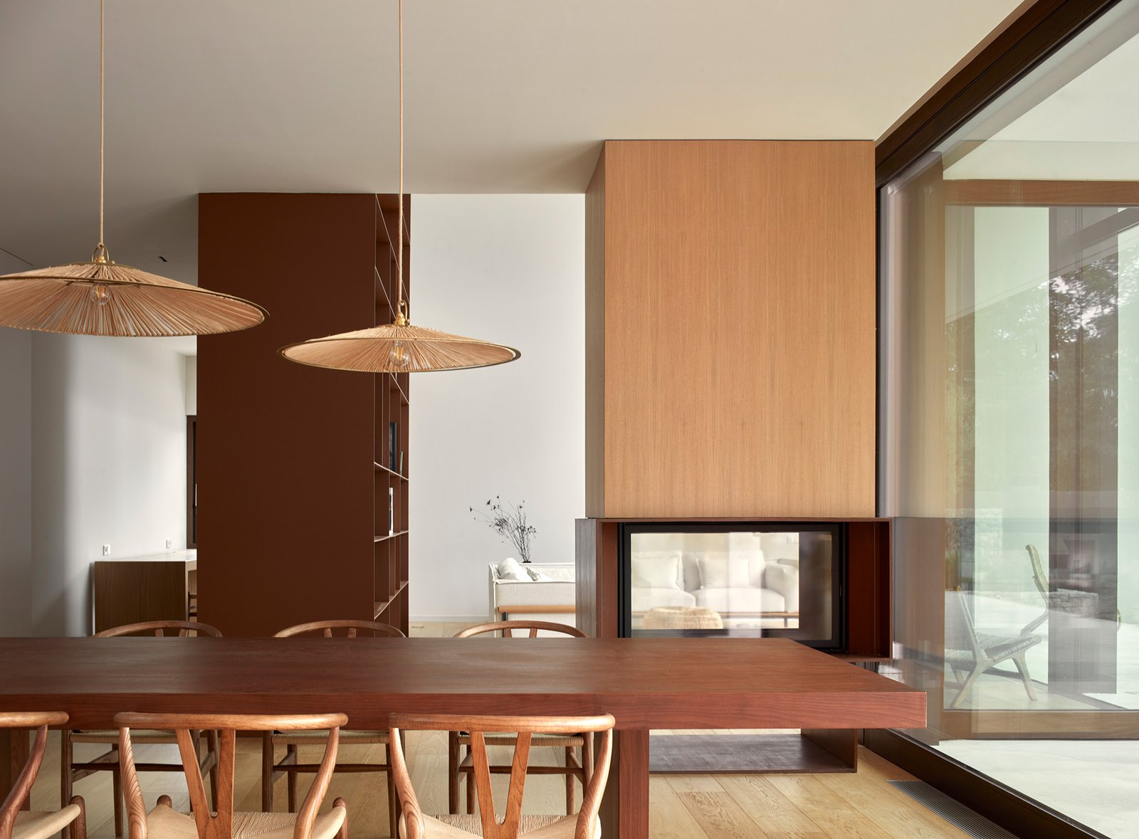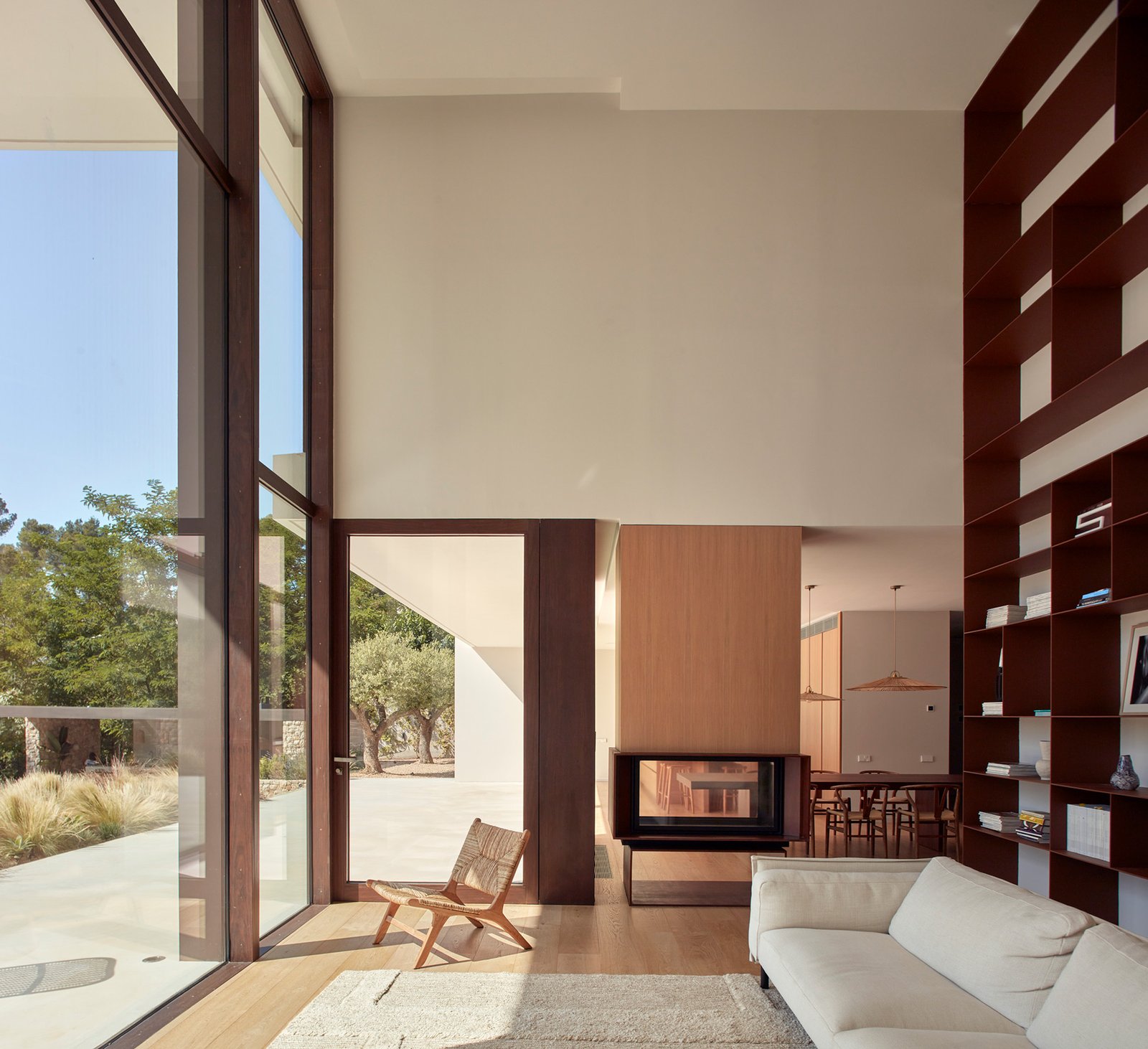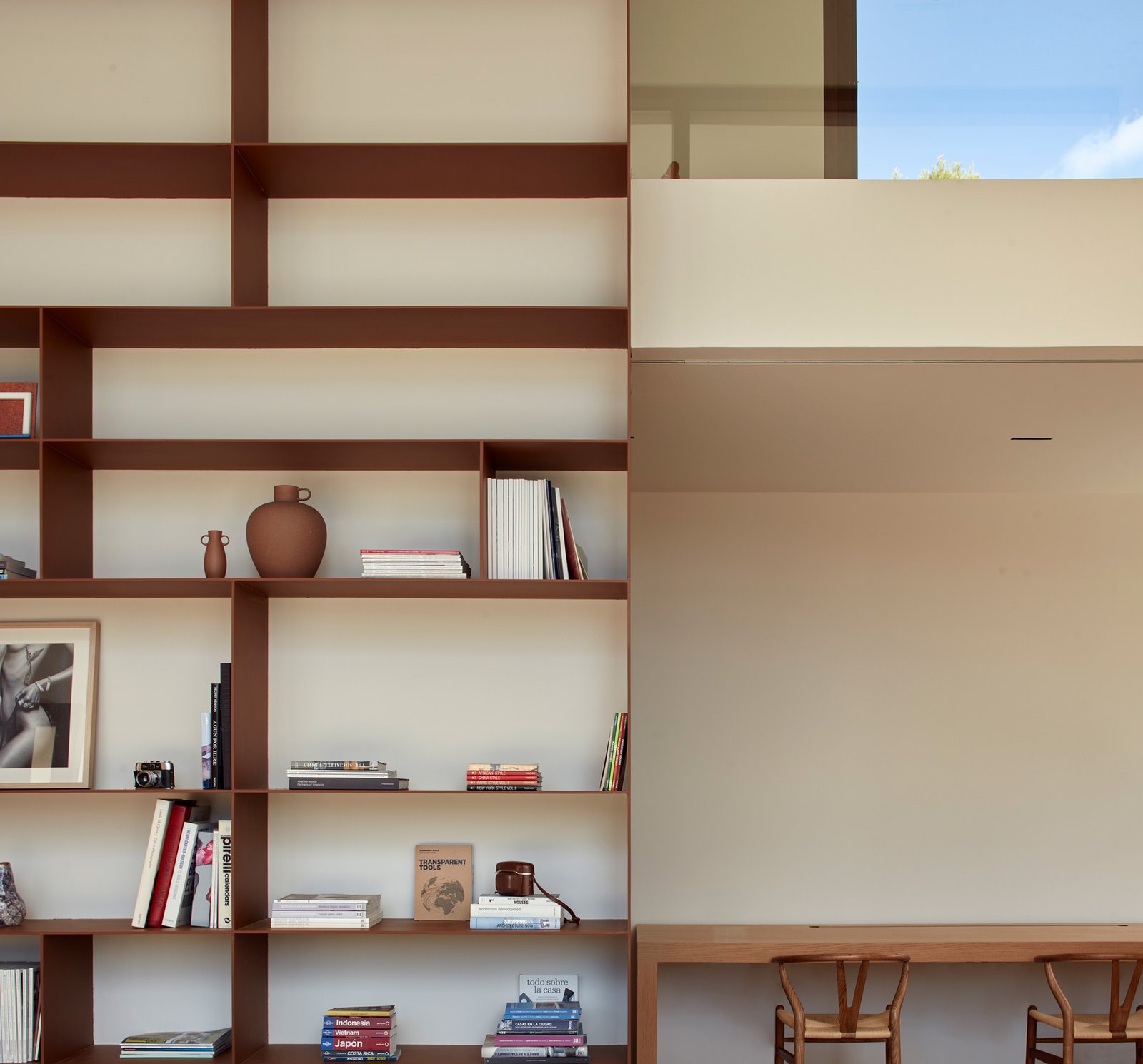 La casa La Calma se desarrolla en dos plantas. En la baja se ubican las estancias de día y se organizan de manera fluida, conectadas visualmente pero con posibilidad de independizarse. La doble altura del salón queda presidida por una gran estantería y se separa del comedor por una chimenea abierta a ambas caras. En la planta primera se ubican los dormitorios y el soleamiento y las vistas quedan controladas mediante unas correderas de lamas.