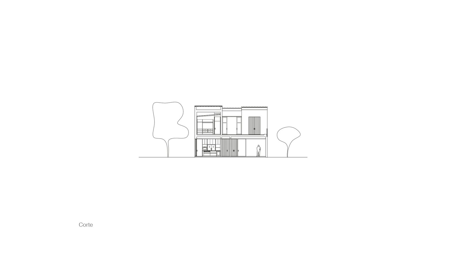 La fachada frontal es discreta: casi ciega hacia la calle, alberga solo una ventana de la oficina y una puerta camuflada detrás de la vegetación. La apertura de la casa ocurre a partir de sus ejes internos, hacia el patio central, donde destaca un olivo, y hacia el fondo del sitio, donde las habitaciones se orientan al canal. El patio actúa como regulador de luz y privacidad, permitiendo una vivencia introspectiva y aireada, protegida de los lotes vecinos.