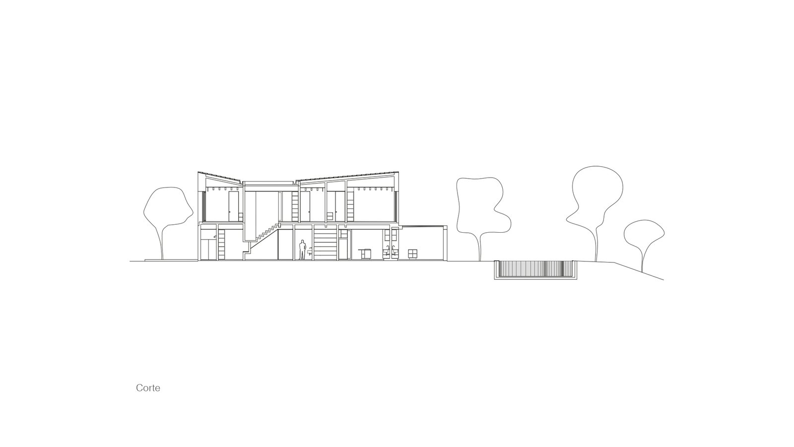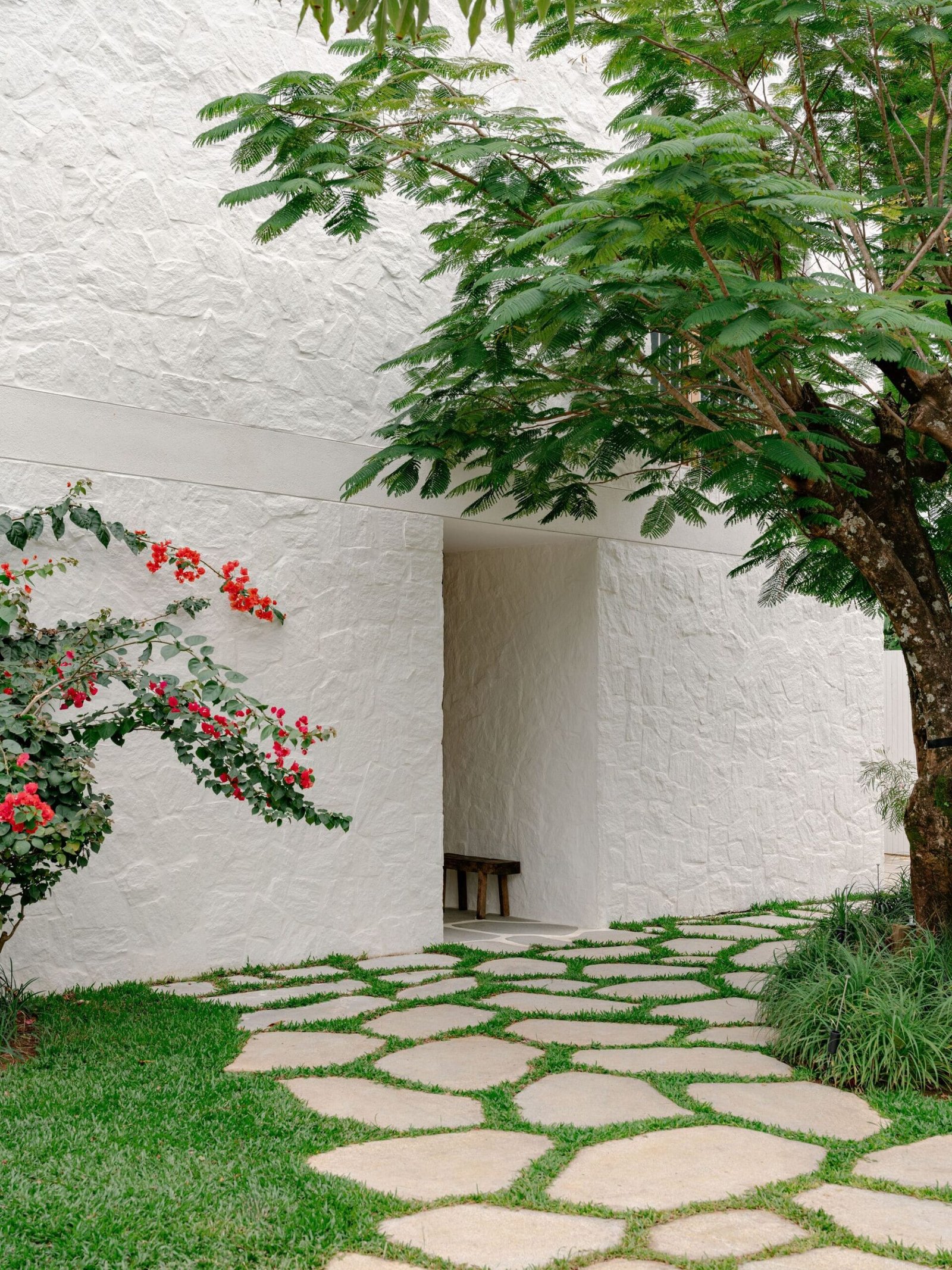 Esta superficie, al mismo tiempo sólida y luminosa, define el lenguaje de la casa. Un cinturón de hormigón blanco marca horizontalmente los dos niveles, en la losa intermedia y en la coronación de la cubierta, reforzando el rigor del diseño. El tejado a dos aguas cumple con los requisitos del condominio, regulado por el patrimonio histórico de Paraty, y se integra a la volumetría con naturalidad.