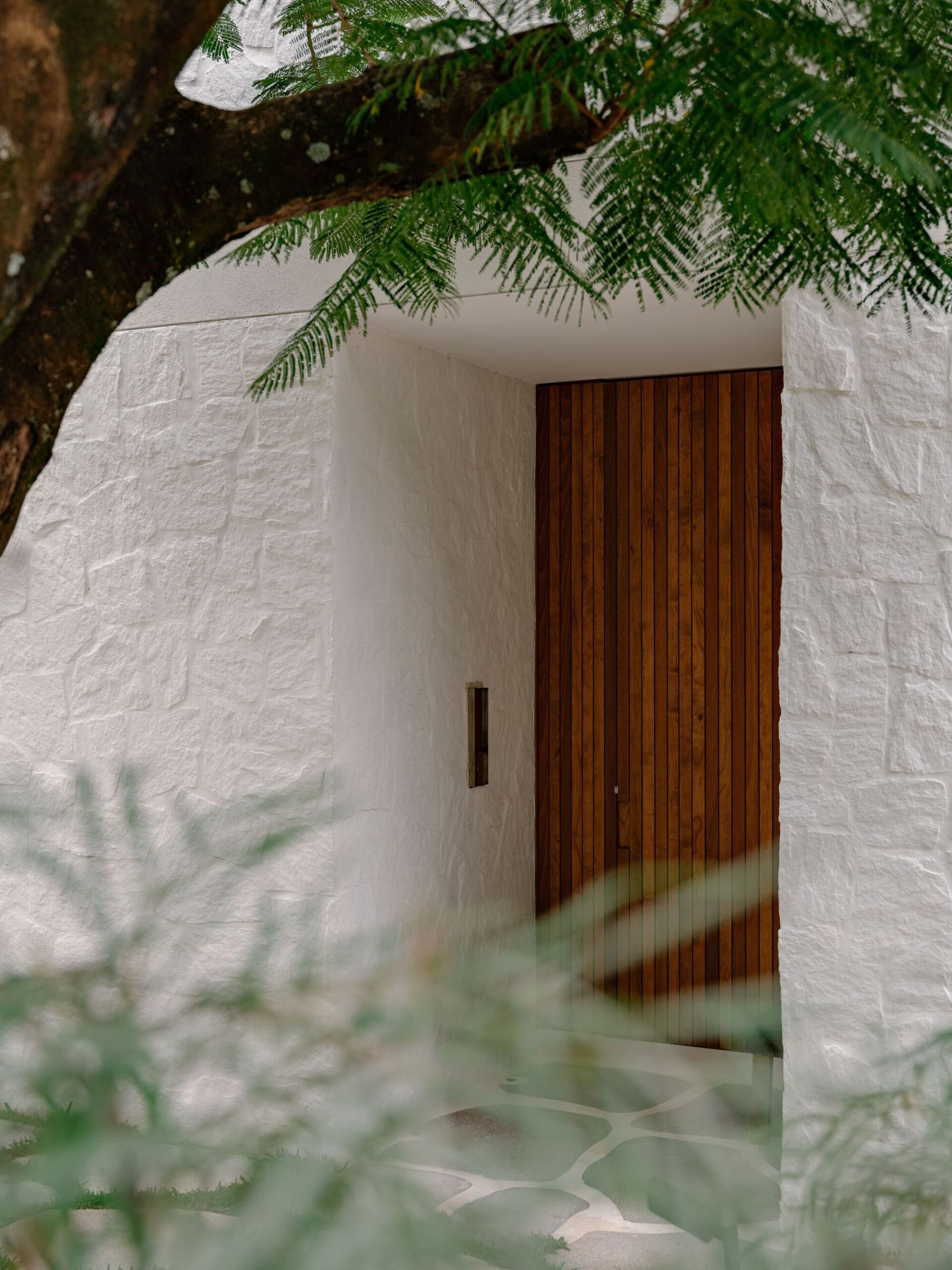 La materialidad es uno de los puntos centrales del proyecto. La albañilería de piedra con pintura blanca crea una textura singular, inspirada en referencias mediterráneas traídas por el cliente.