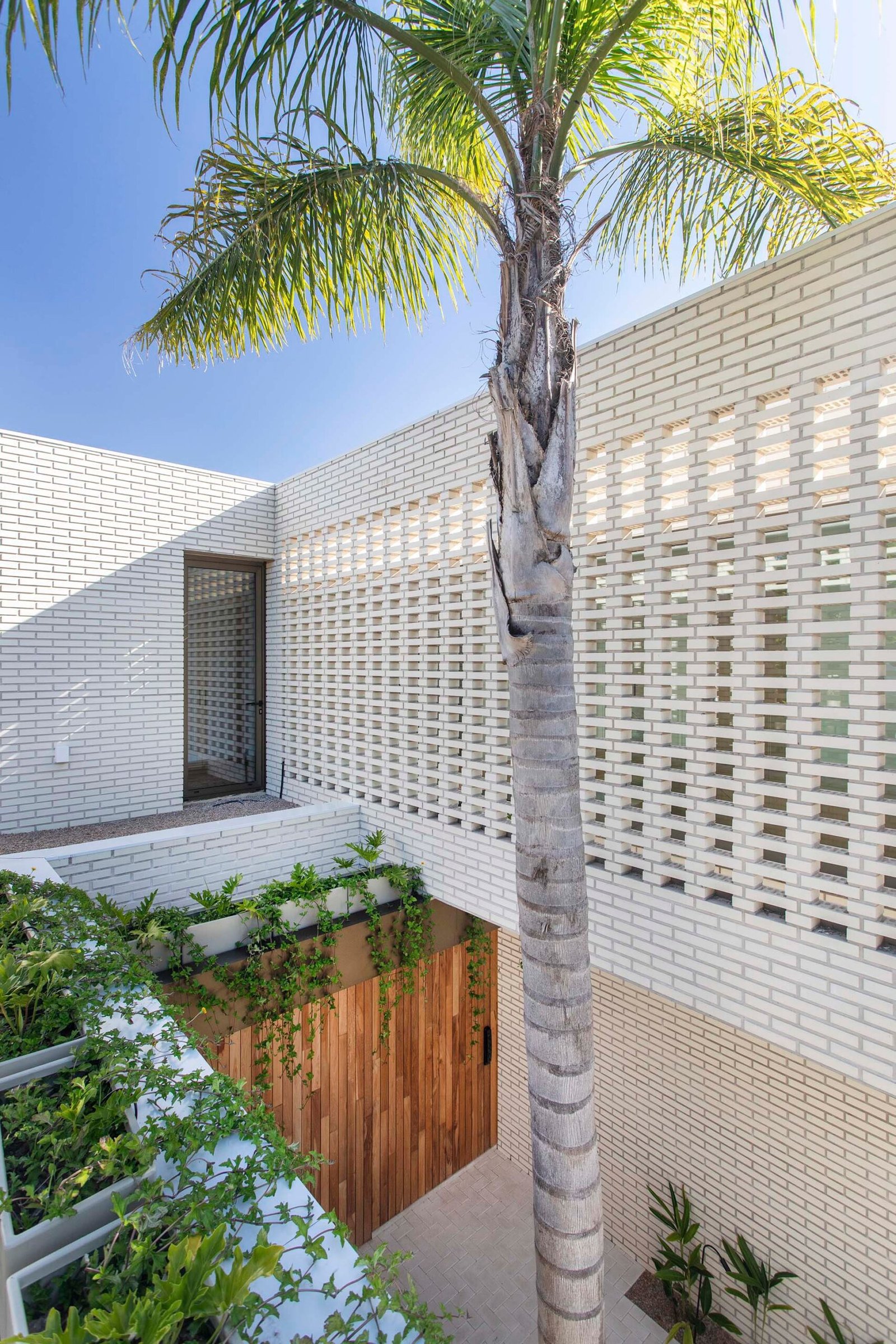 La constitución estructural de la vivienda está basada en materiales nobles, pero, ante todo, se optó por trabajar con un perfil moderno con ladrillos blancos, carpinterías de aluminio y terminaciones en madera y piedra natural. Se priorizaron las formas puras y la continuación material dentro y fuera del proyecto. La constante interacción con la vegetación por medio de patios y grandes maceteros desdibuja los límites entre el interior y exterior, promoviendo la integración de la naturaleza en la rutina.