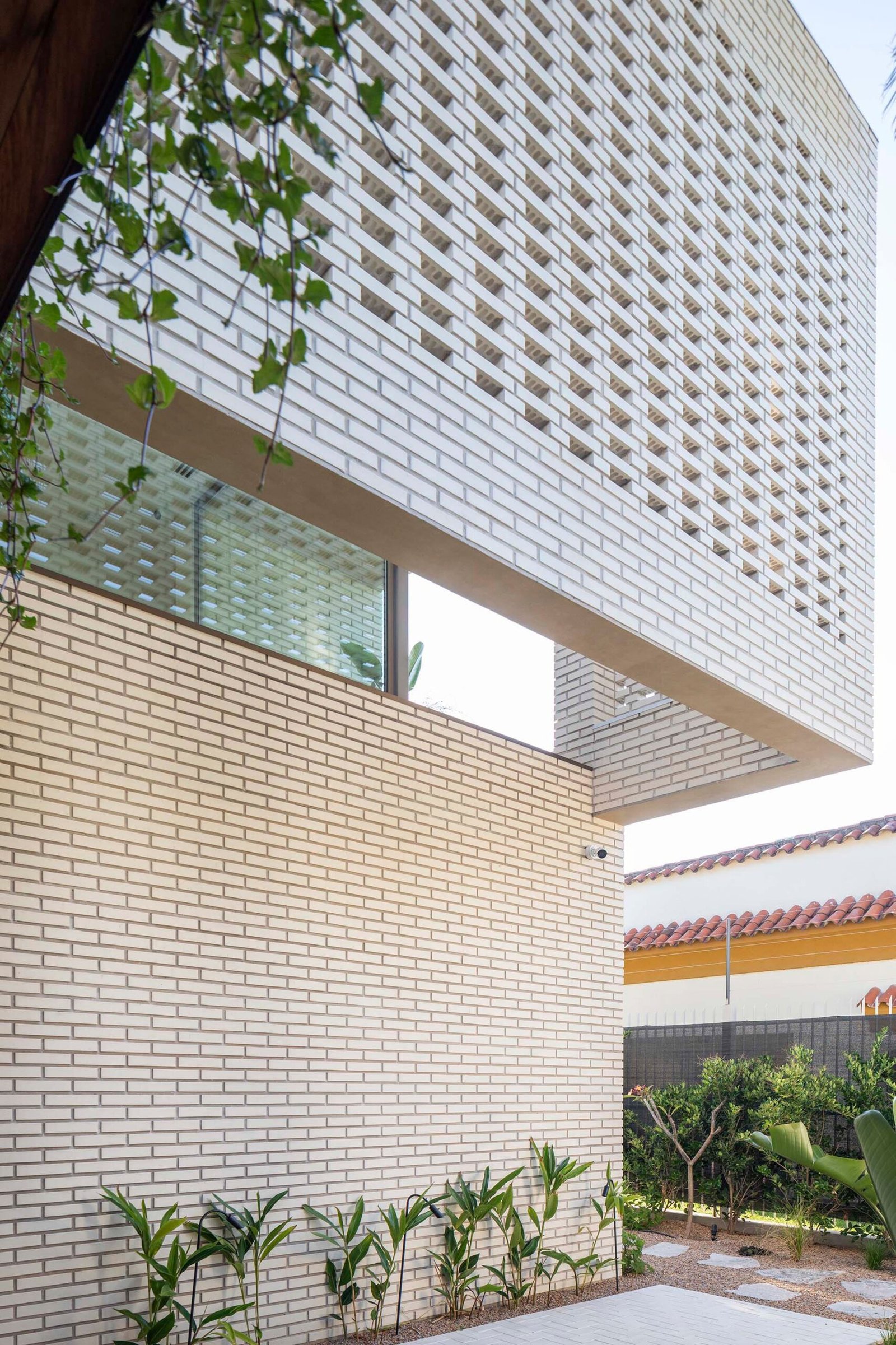 Ubicada en un terreno que posee una casona antigua de estilo colonial en el lote lindero, se destaca el tratamiento de la envolvente exterior realizada en ladrillo blanco, que va adaptándose a los diferentes modos de habitar de la casa con el juego de la trama: gracias a estos llenos y vacíos, por momentos la resolución de este cerramiento actúa a modo de parasol, para controlar la luz de la mañana en el núcleo de escalera, y por otros, la trama genera privacidad en el área de servicios, permitiendo la entrada de luz y ventilación.