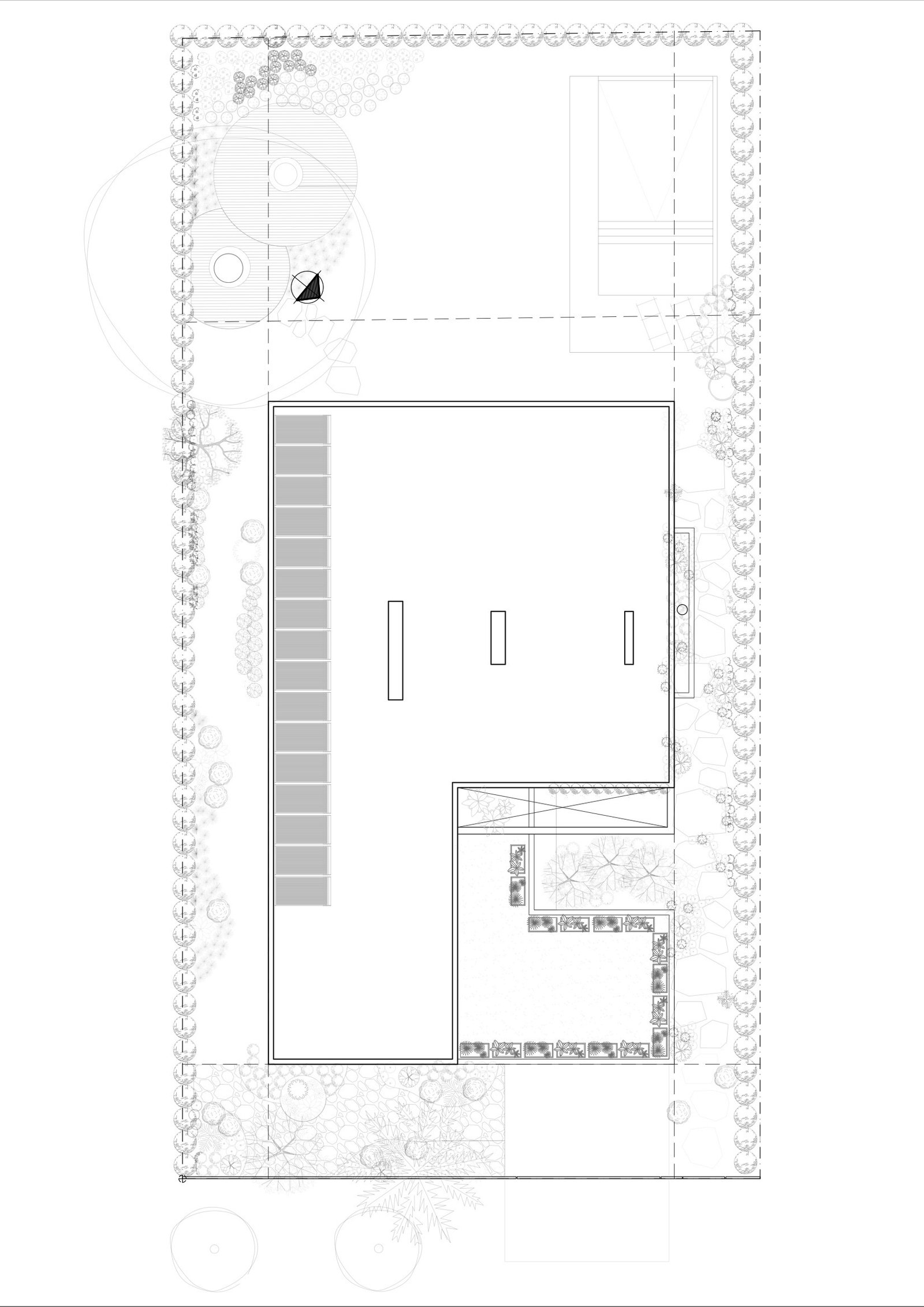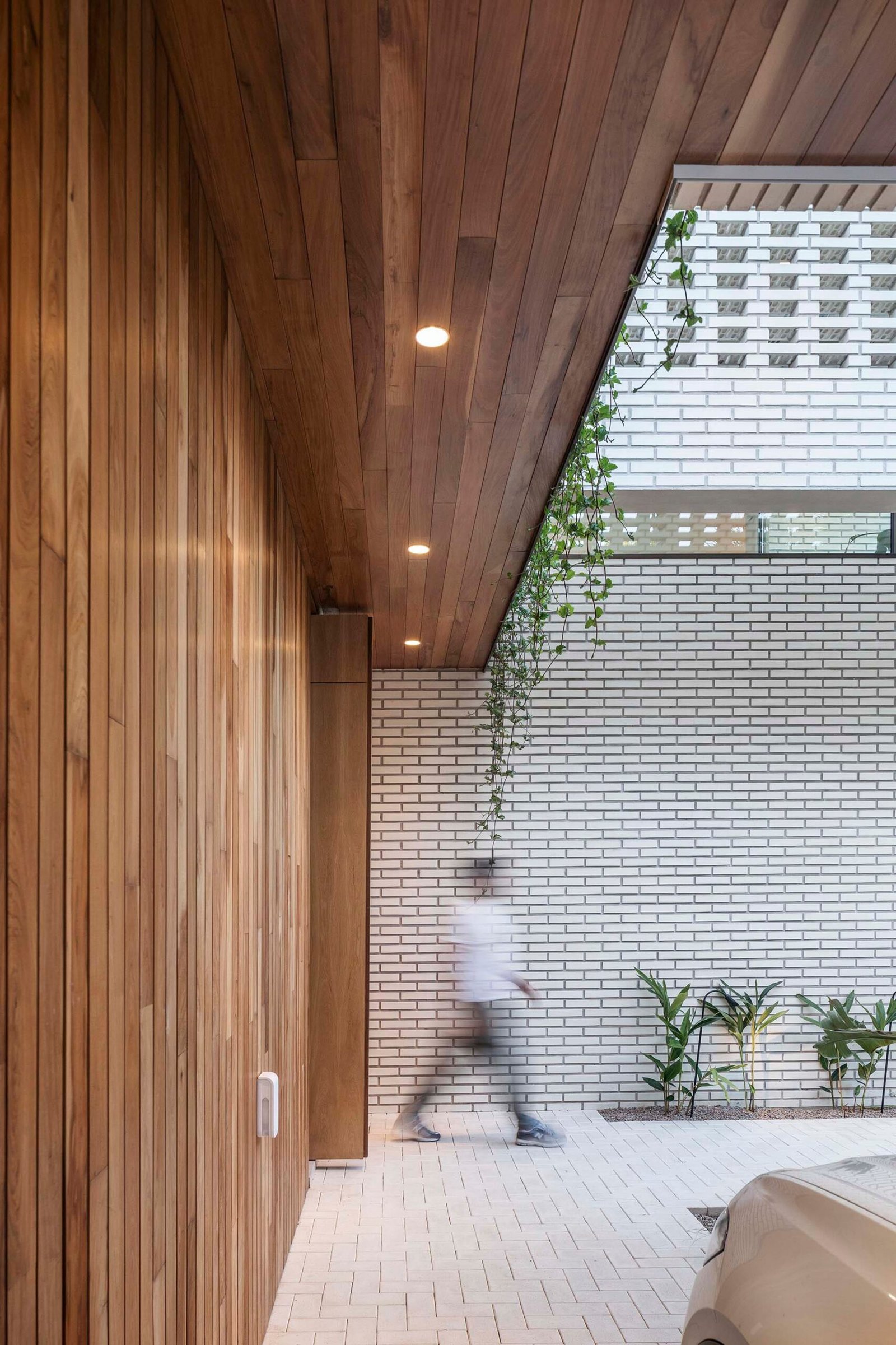 Hacia el espacio urbano, se visualiza una vivienda bastante compacta y cerrada, controlando la privacidad y seguridad. Atravesando el cerramiento metálico, se ingresa peatonalmente a la casa a través de un recorrido lateral, el cual está acompañado por vegetación y desemboca en un patio de acceso, con orientación norte, que aporta iluminación natural todo el día a la vivienda. Este vacío se encuentra jerarquizado por un muro-parasol de primer piso, que levita en el espacio.