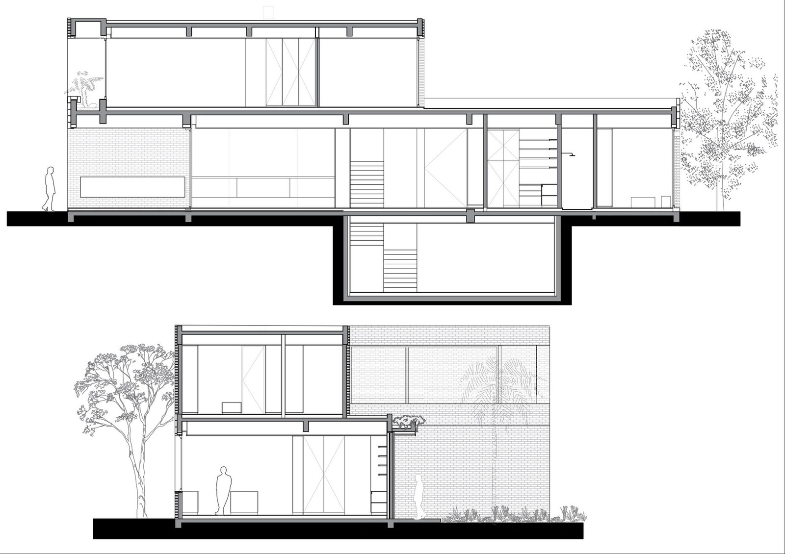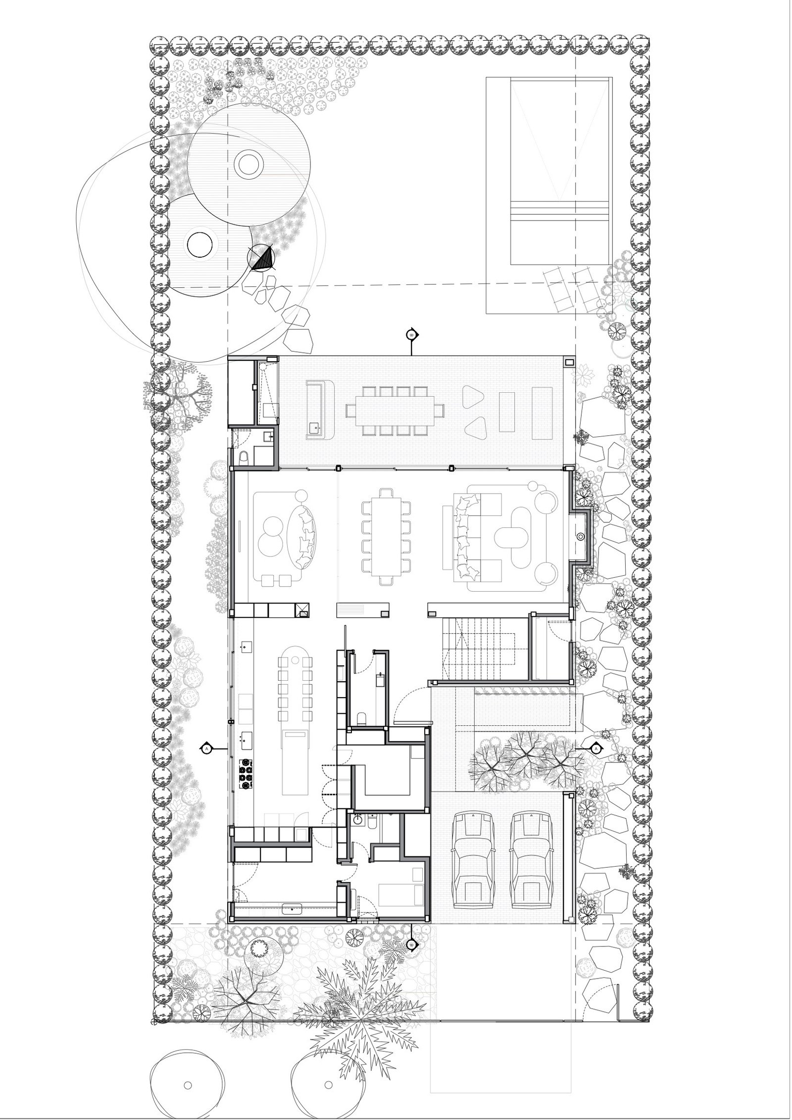 Se desarrolla en planta baja el sector público que abre sus visuales ininterrumpidas, gracias a los aventanamientos corridos, al jardín, el cual posee un longevo árbol de Magnolia, que tiene gran protagonismo en el diseño del paisajismo. La galería conforma un gran espacio de reuniones, y transición entre el interior y el exterior. El área de servicios se ubica hacia el lado sur del terreno. Debajo de este nivel se encuentra el subsuelo que cuenta con un micro cine y una vinoteca.