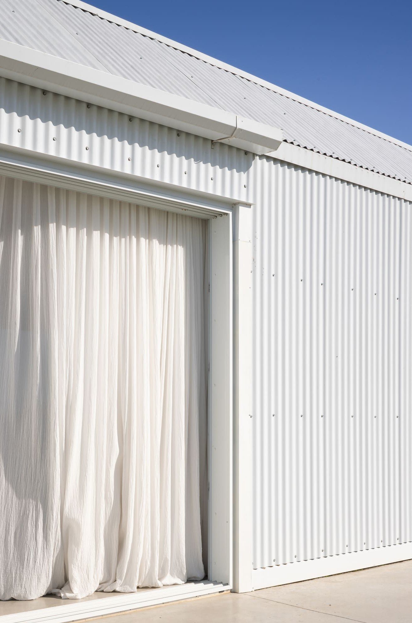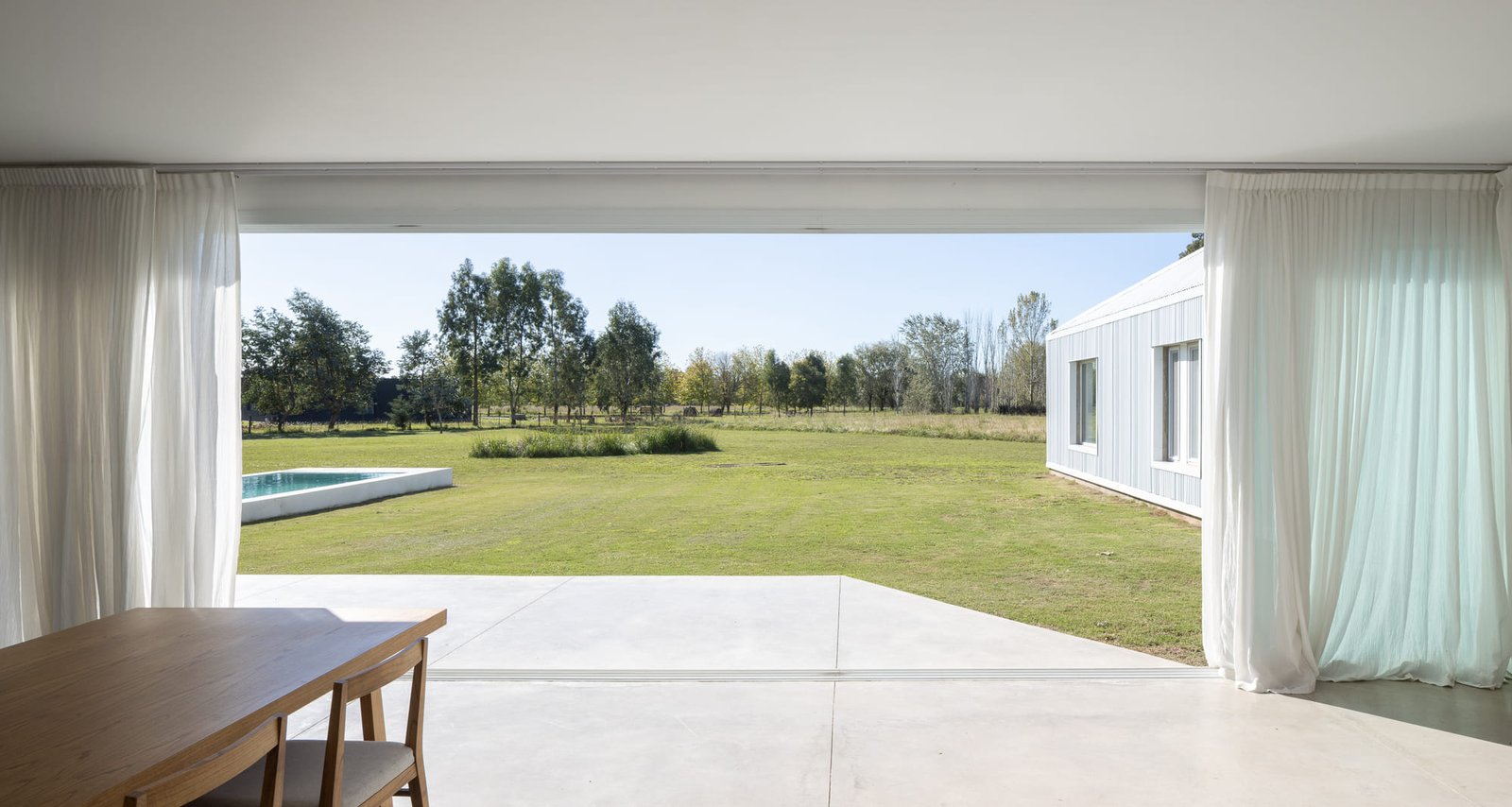 La estrategia fue deliberada: construir una casa con un solo material, envolvente y continuo, que pudiera reflejar y dialogar con el entorno. La chapa acanalada, presente en galpones y silos del lugar, se convierte aquí en materia principal: revisitada y reconfigurada como recurso estético y tectónico para habitar la llanura. Su carácter cambiante frente a la luz, su capacidad de reflejo y su coloración plateada permiten que la casa se mimetice con los cielos y la escarcha sobre el verde propios de la llanura del campo.