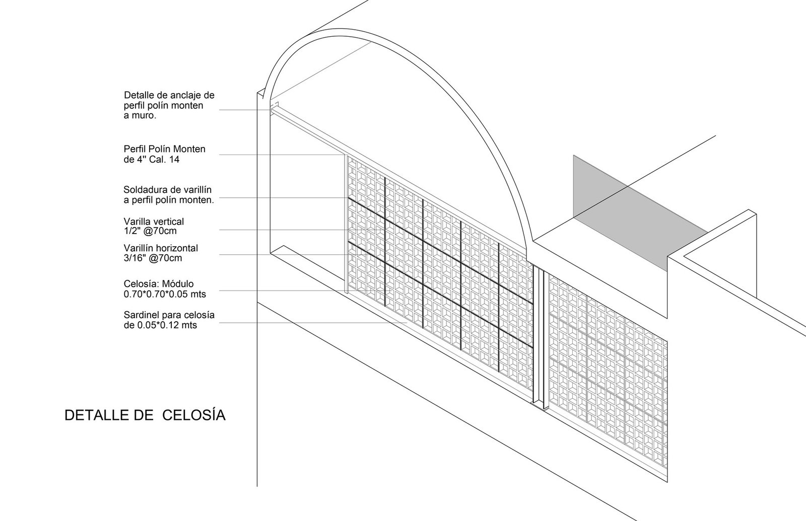 Para proporcionar una mayor privacidad y matizar la iluminación del exterior se instalaron celosías prefabricadas de concreto en la fachada frontal.