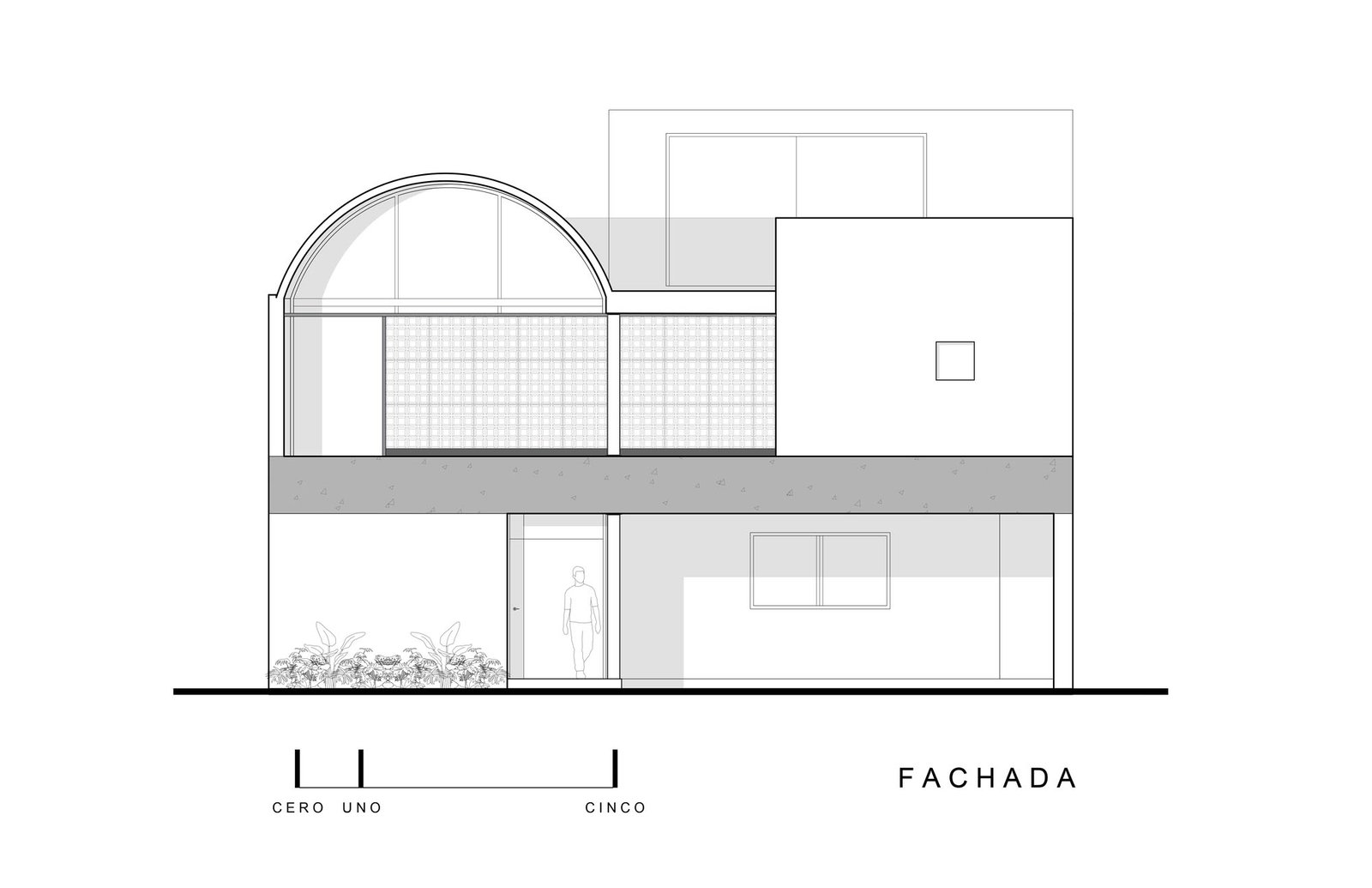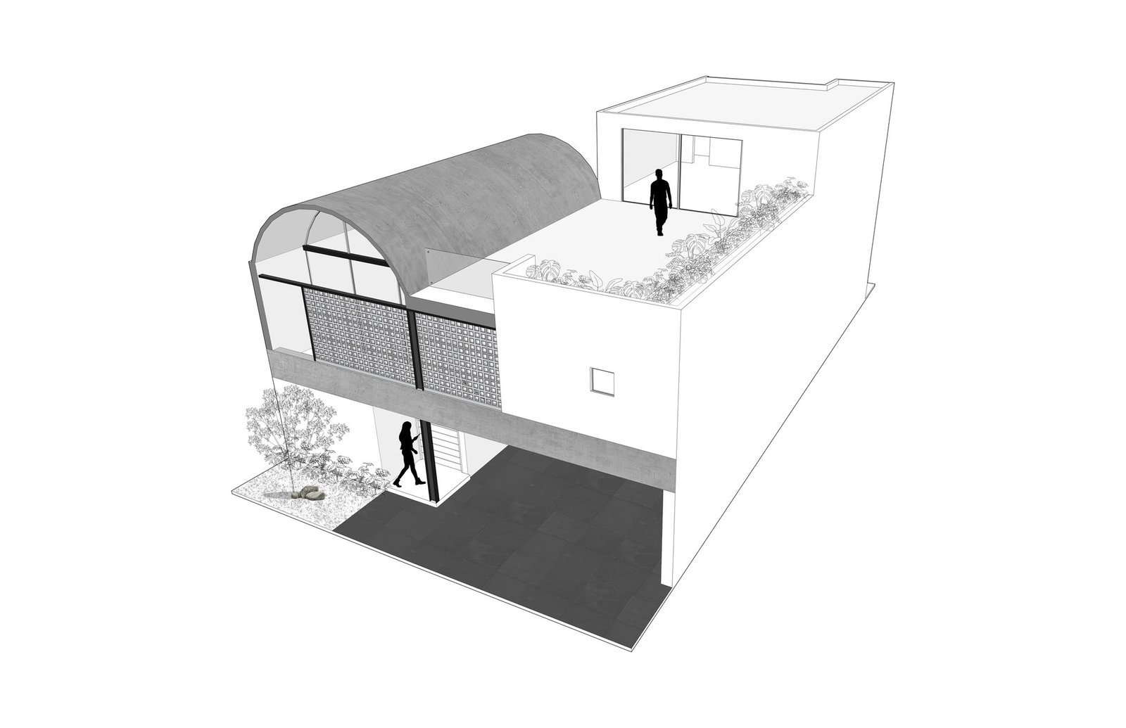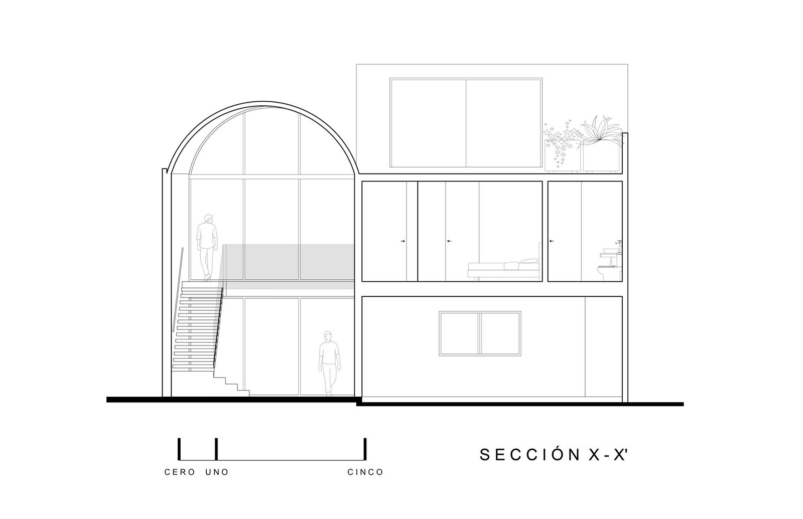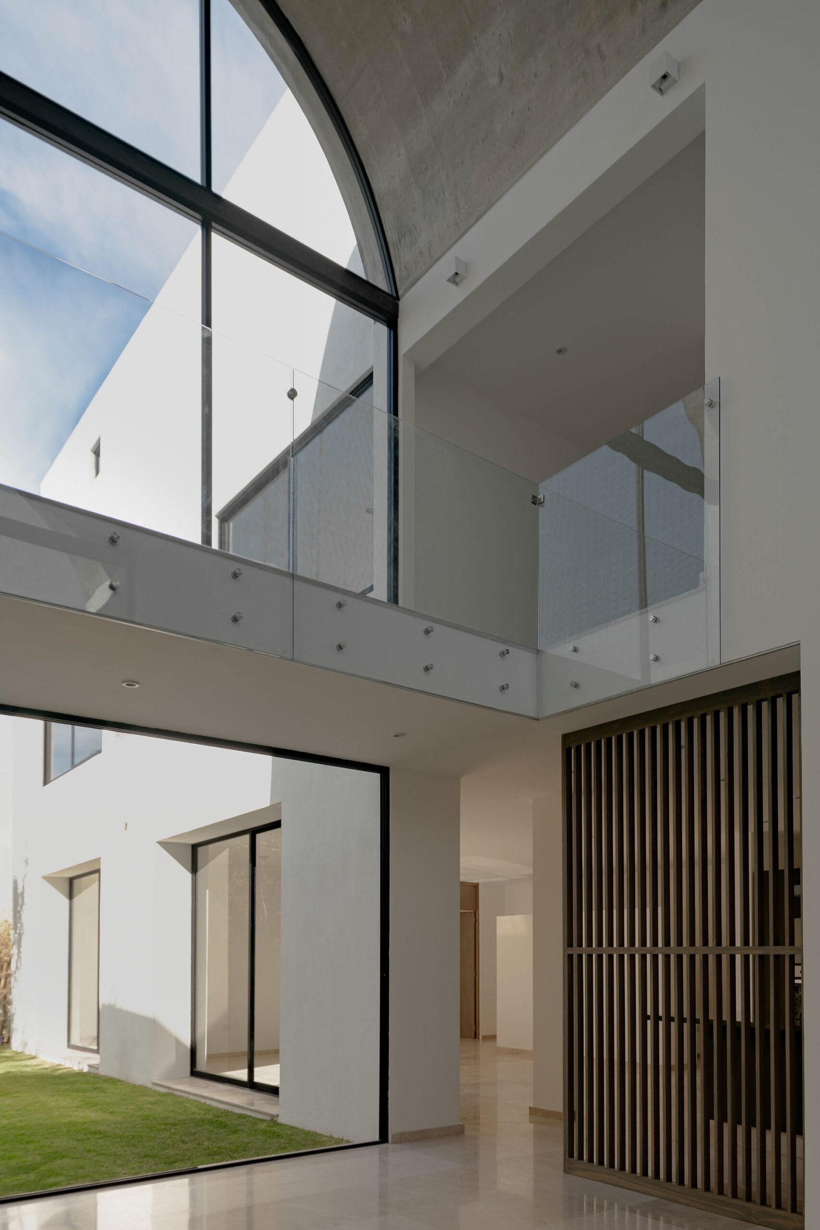 En contraste con la contención del medio construido, al entrar a la vivienda el espacio se abre a una doble altura cubierta por una bóveda de concreto de medio cañón, la cual remata con un ventanal para crear una fusión entre el vestíbulo y la sala con el jardín.