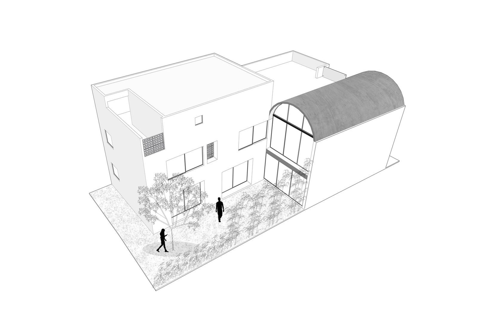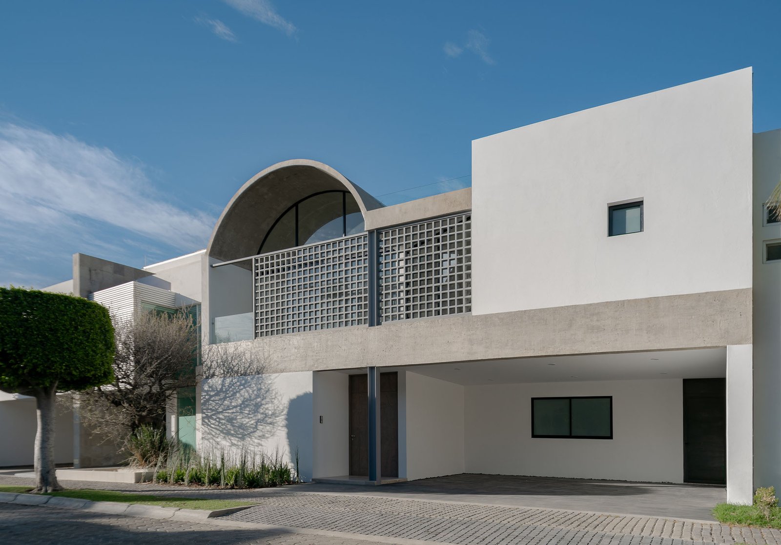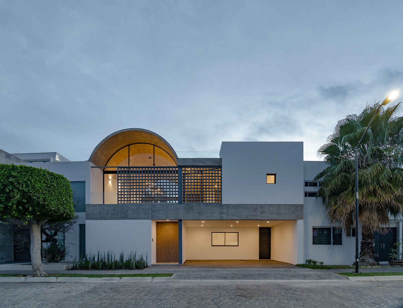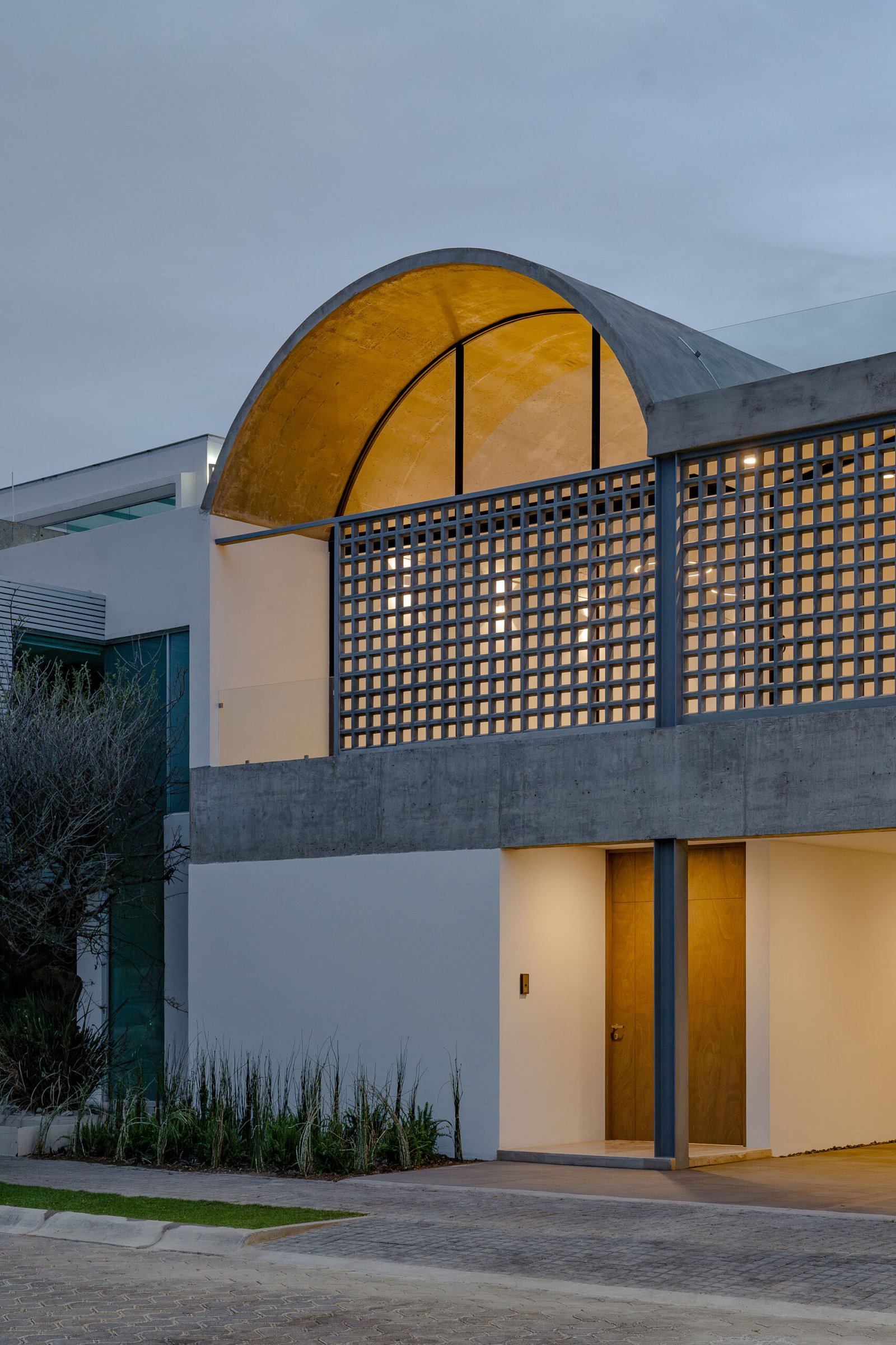 En contraste con la contención del medio construido, al entrar a la vivienda el espacio se abre a una doble altura cubierta por una bóveda de concreto de medio cañón, la cual remata con un ventanal para crear una fusión entre el vestíbulo y la sala con el jardín.