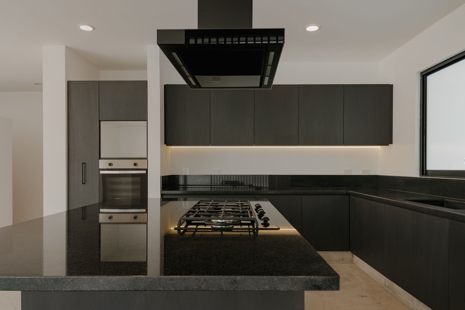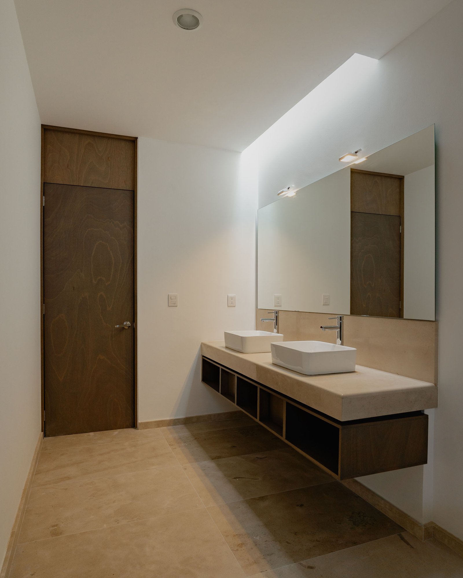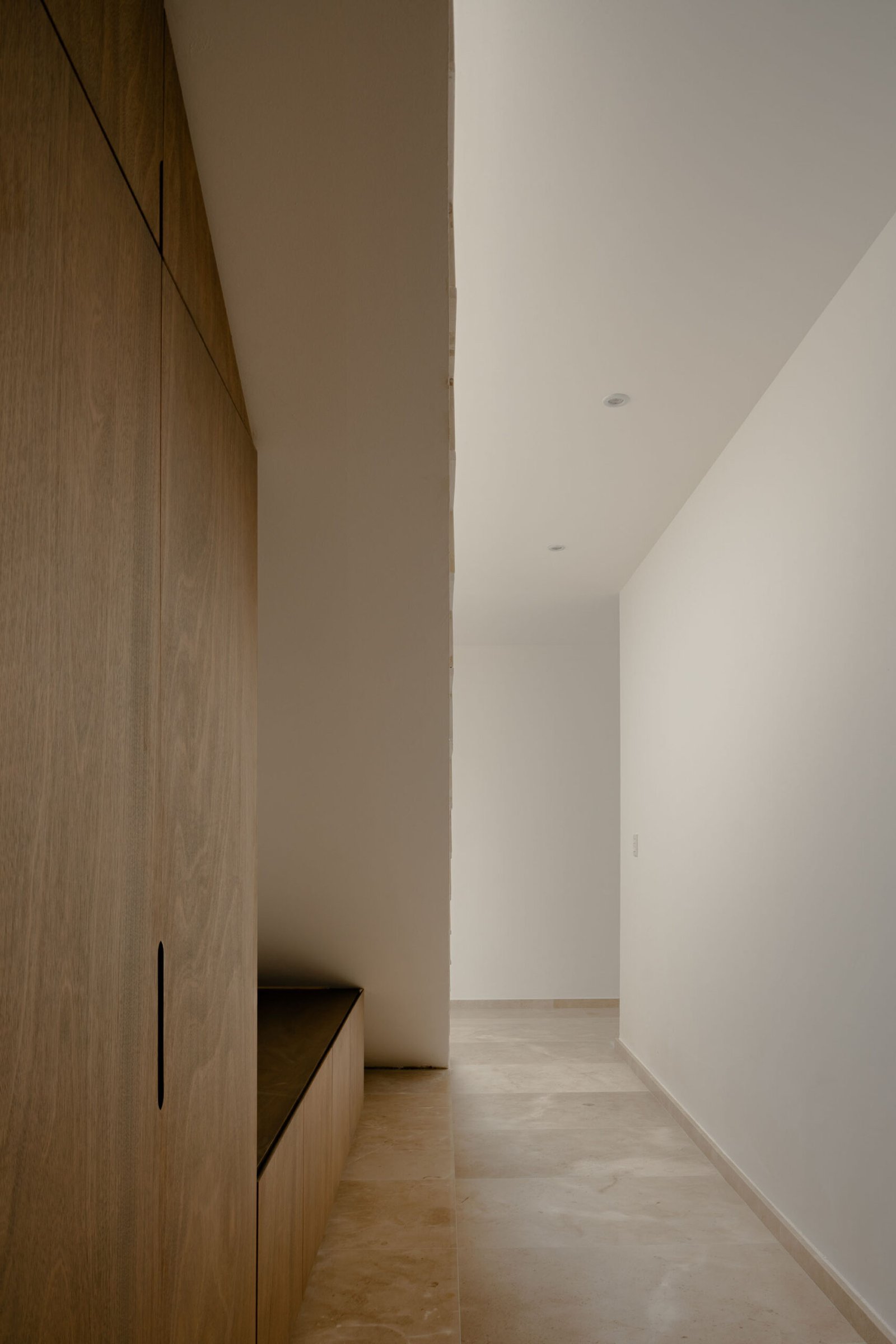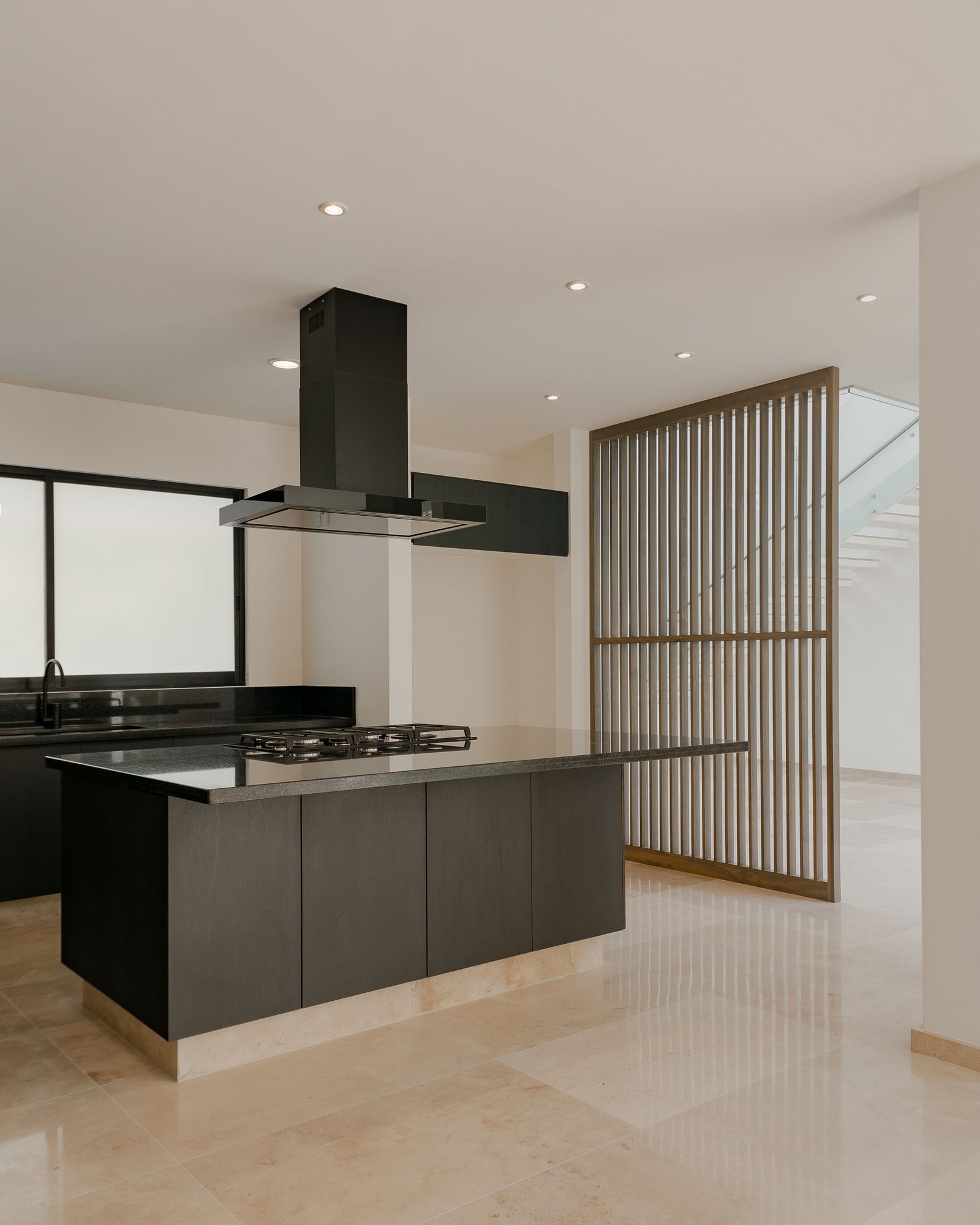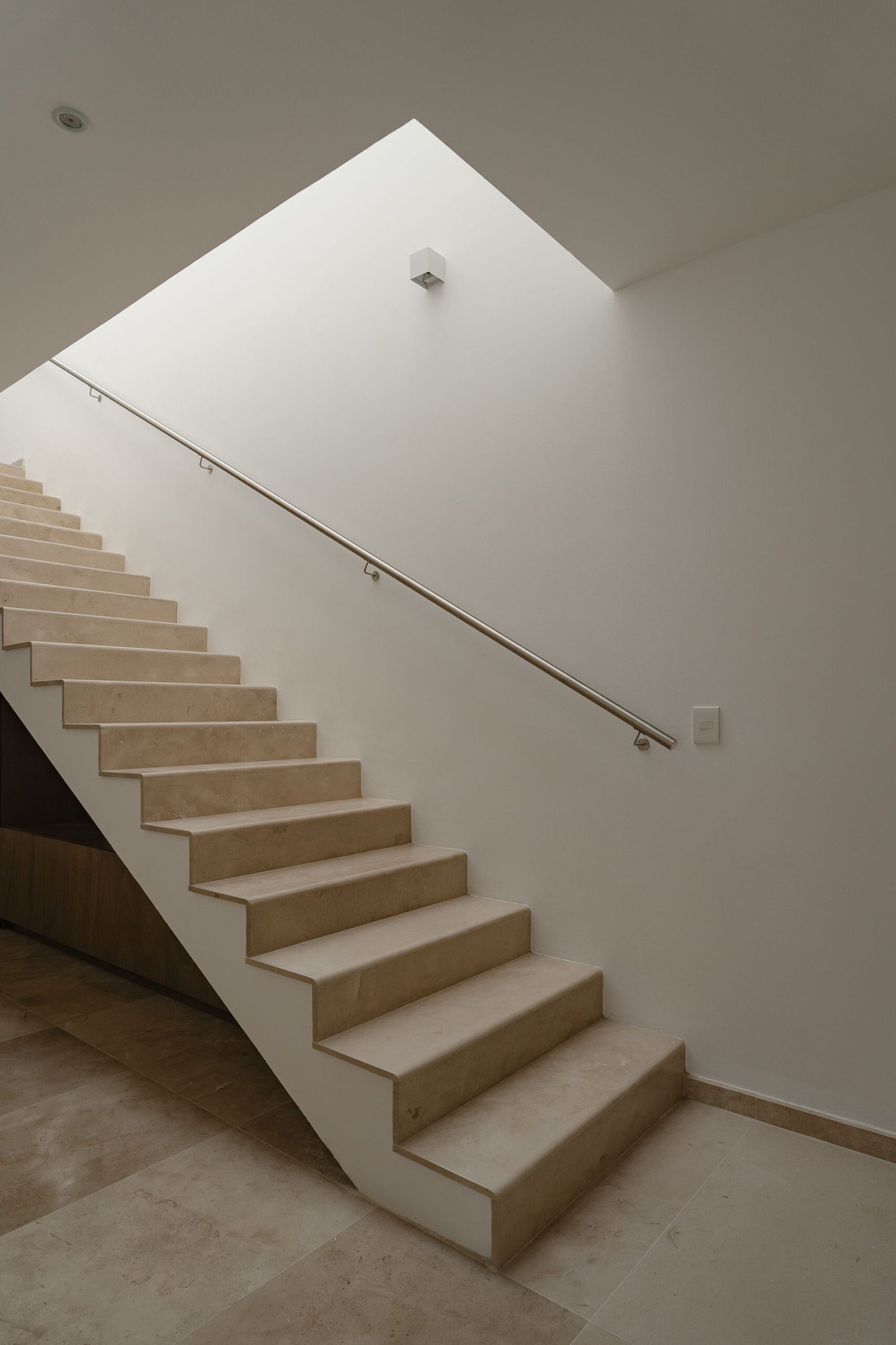 El vestíbulo-sala se vincula por medio de una celosía de madera con el área preparación y consumo de alimentos, y a través de una escalera lineal, se conecta con la zona íntima de planta alta donde se encuentran las recámaras.