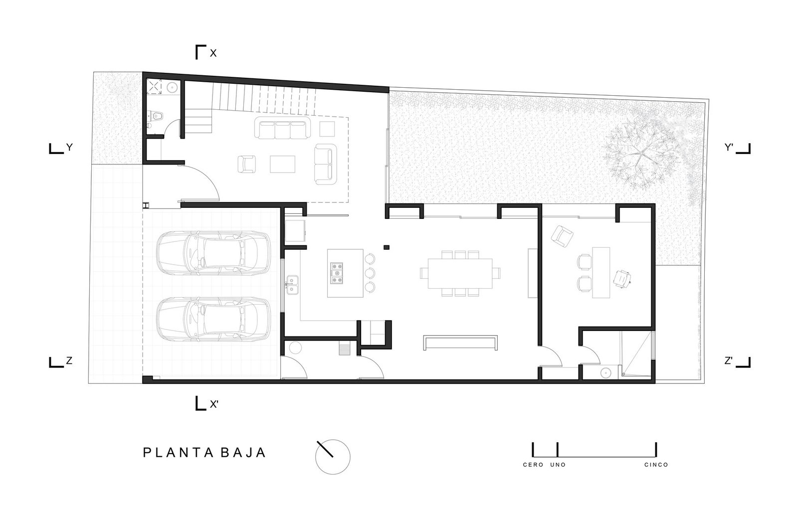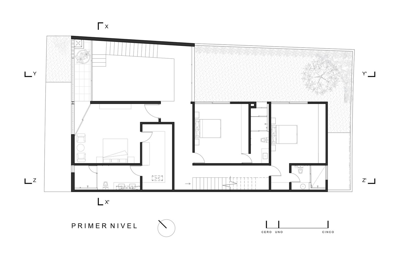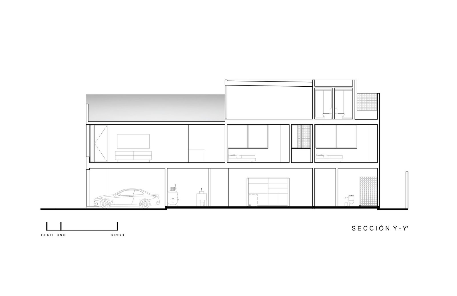 La primera necesidad del proyecto es integrarse y adaptarse al lugar, que se encuentra en su máxima densidad de construcción con los predios colindantes ocupados por viviendas de dos y tres niveles por lo que la volumetría de la casa guarda proporción con respecto a las construcciones vecinas. A nivel contextual, se plantea un partido arquitectónico con un jardín al interior del predio que en combinación con los jardines vecinos forman un espacio verde más amplio, de esta manera varias viviendas se benefician de una mejor orientación, iluminación, ventilación y vegetación.