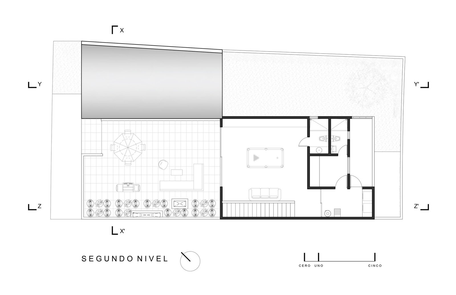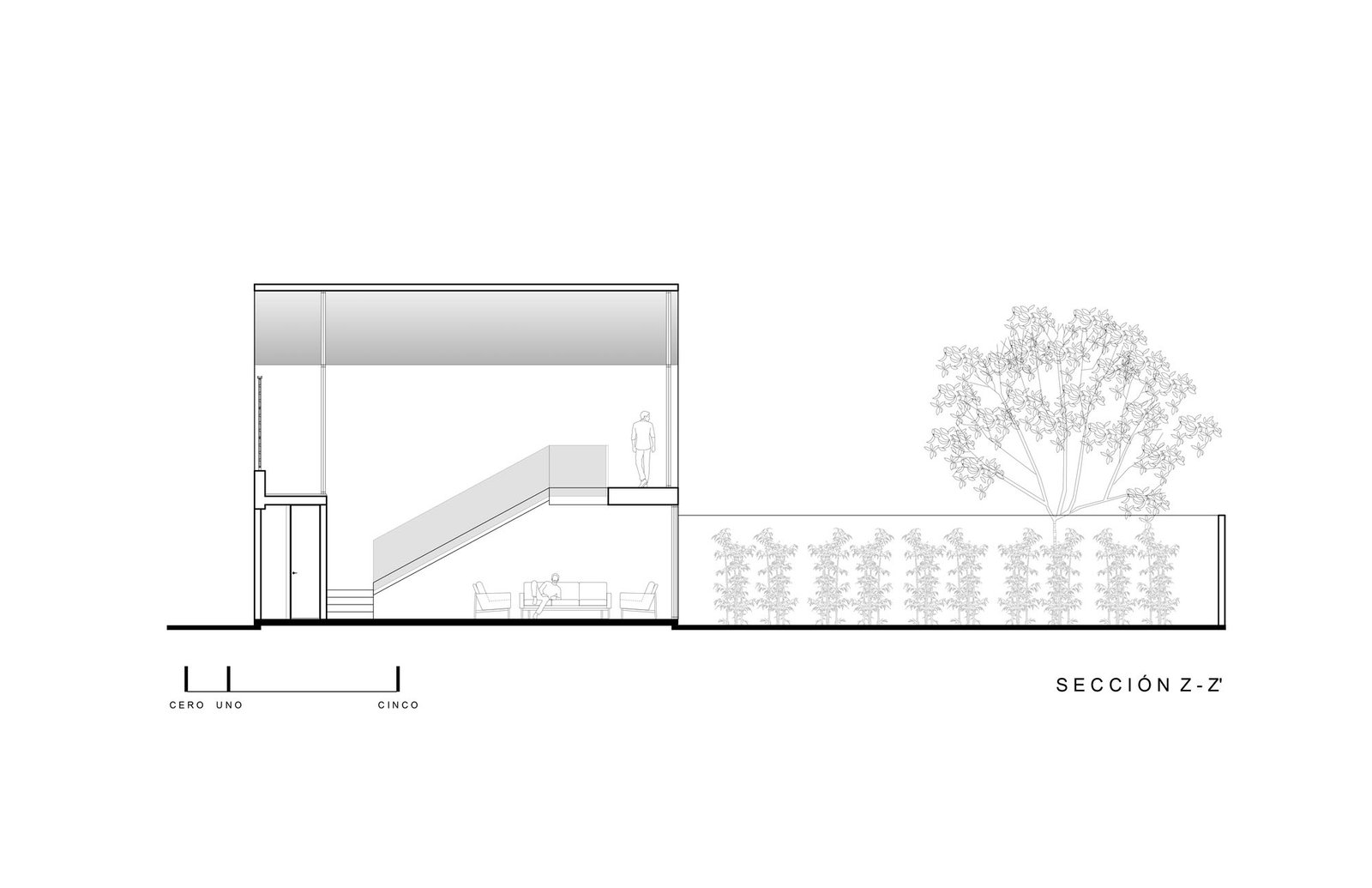Los recorridos abiertos entre los niveles permiten apreciar la sala, el jardín y la bóveda desde diferentes perspectivas. Otra escalera lineal con iluminación cenital conduce al último piso, donde se encuentra un salón multifuncional que se abre hacia una amplia terraza que ofrece vistas del perfil urbano, el volcán Malintzi y en la cual emerge el volumen exterior de la bóveda.