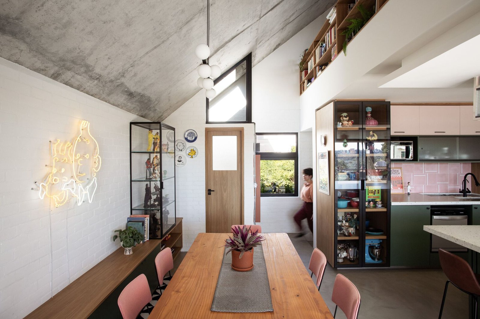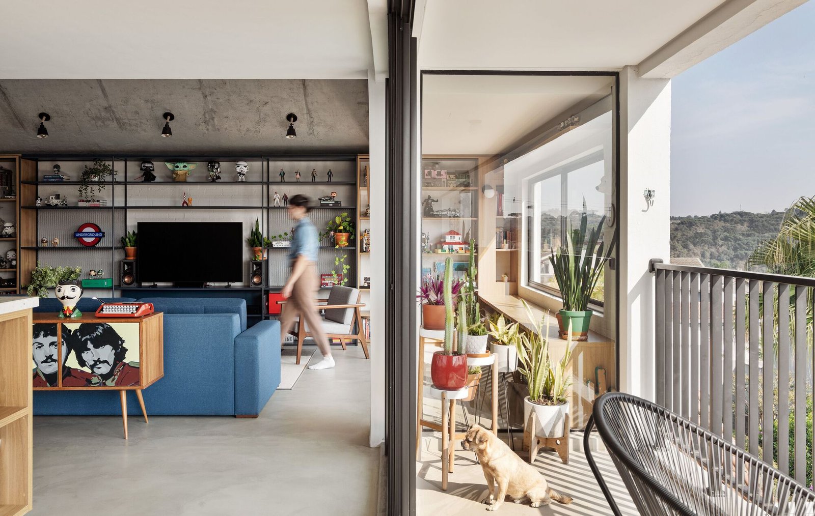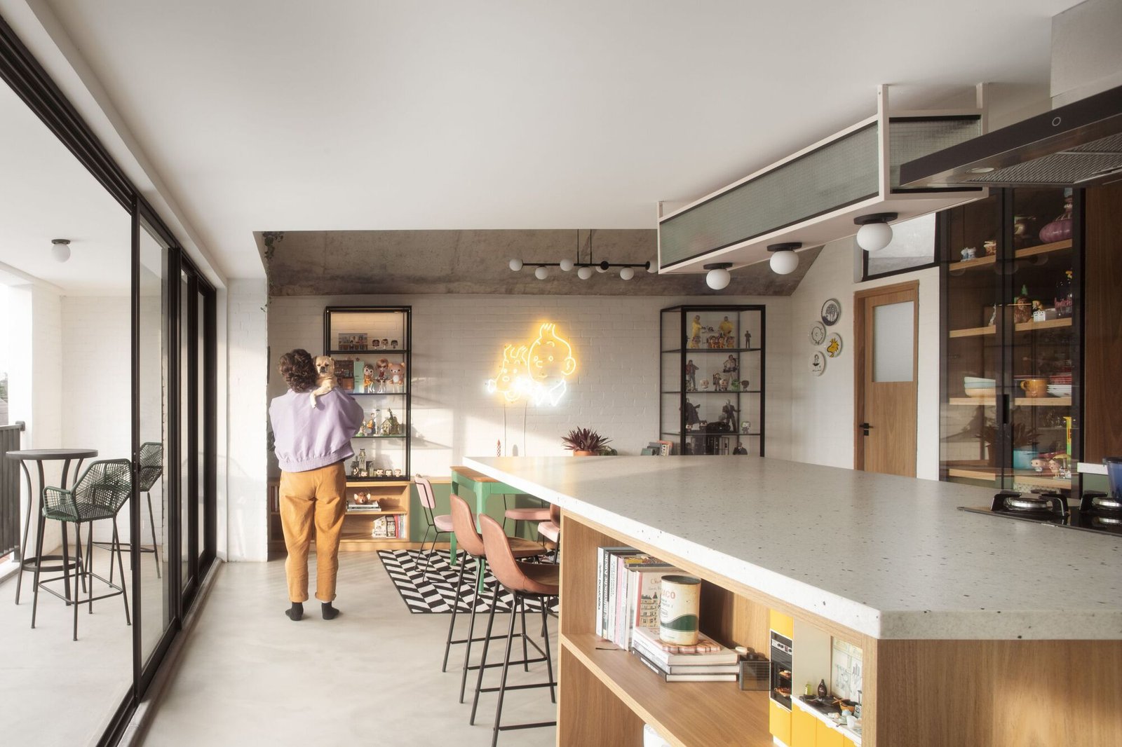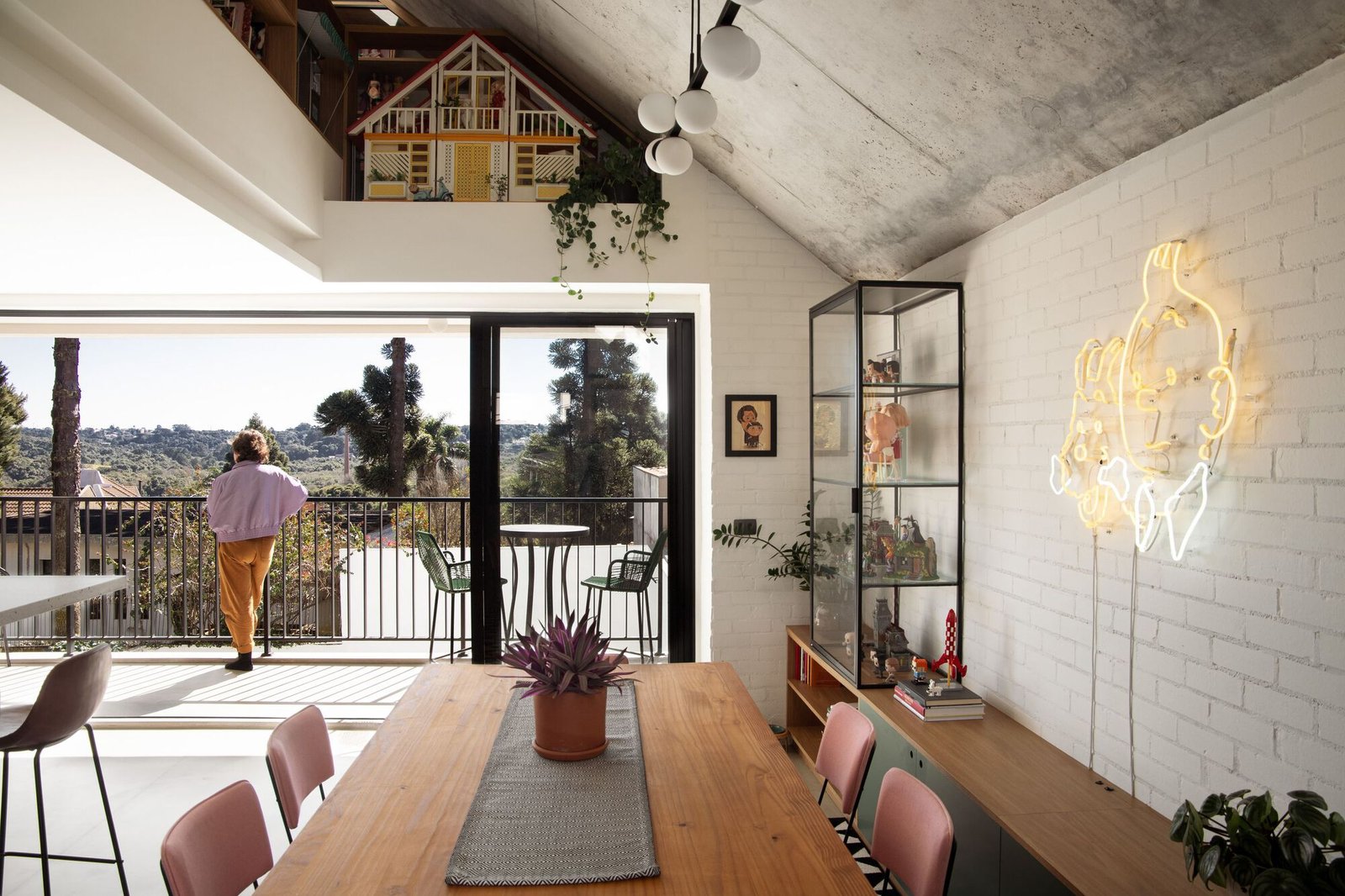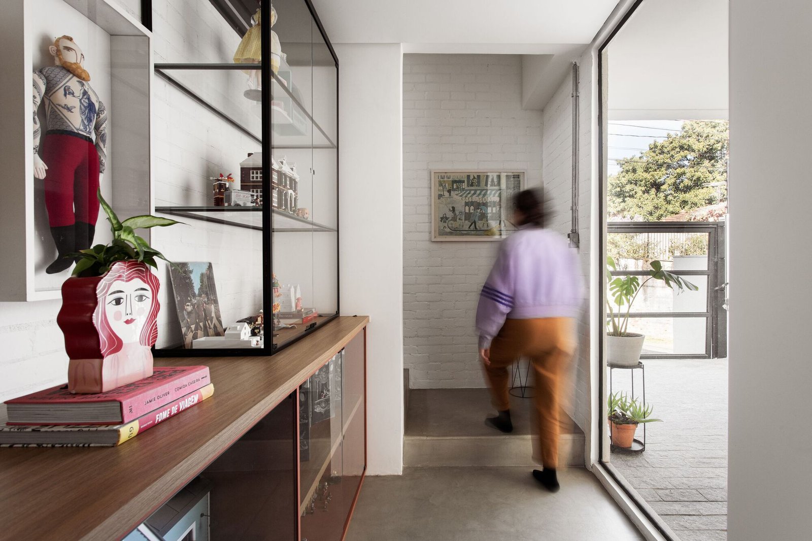 Por otro lado, sus habitantes anhelaban privacidad, una oficina bien iluminada integrada a la sala de estar, una cancha de tenis y muros a dos aguas para albergar sus colecciones, ya sea en estantes o en espacios para elementos decorativos adosados a las paredes. Estas incluían muñecas, miniaturas, grabados, fotografías, coches de juguete, casas de muñecas, pósteres, platos y más juguetes. Los objetos coleccionados, junto con las profesiones de la pareja —él fotógrafo y ella ilustradora reconocida por su trabajo en libros infantiles—, nos invitaron a explorar su aguda imaginación en el proyecto.