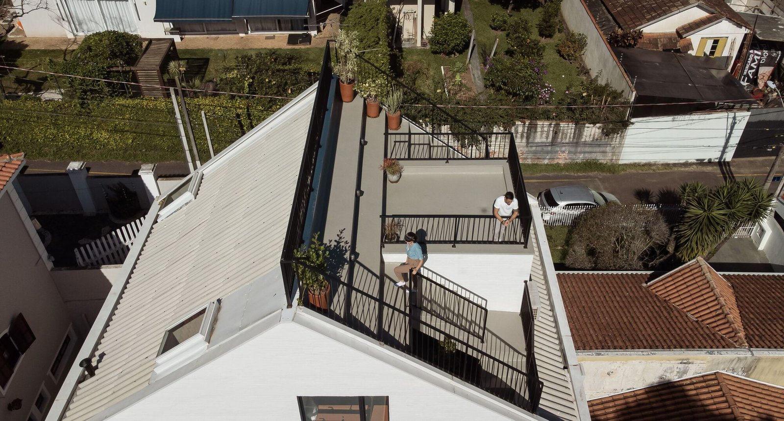 Gracias a la pendiente de las losas, el espacio superior ganó altura, permitiendo la inserción de una buhardilla flotante que alberga el despacho, integrada espacialmente con las demás zonas sociales. Las perforaciones en el bloque constructivo se dispusieron a modo de marcos, enmarcando las vistas, armonizando con la decoración de la pareja y captando la luz solar de la fachada norte. En la fachada sur, que da a la calle, se proponen pocas aberturas organizadas, además de jardineras que garantizan la ventilación cruzada y la comunicación con la calle.