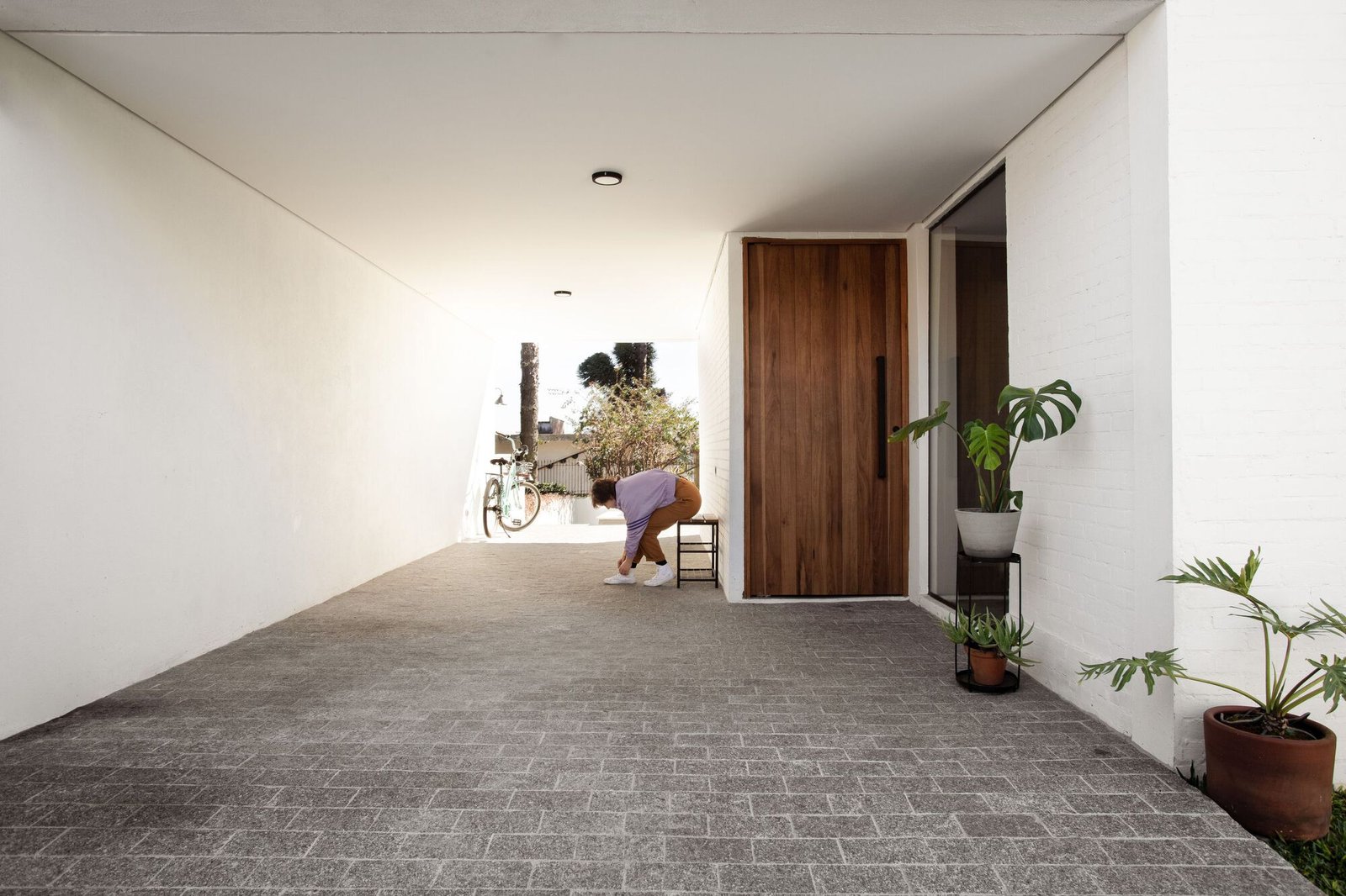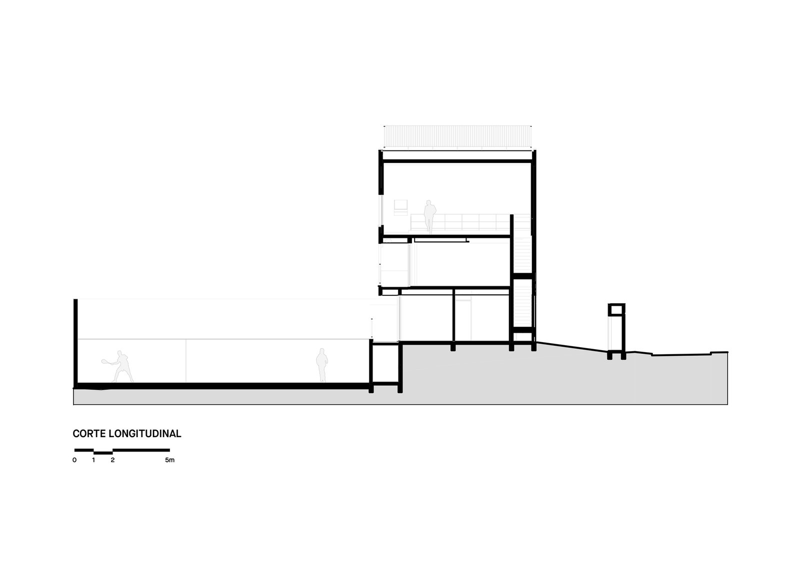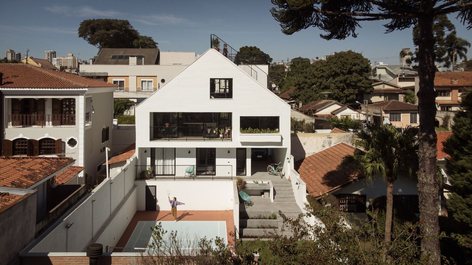 La definición de la volumetría del proyecto consideró la posibilidad de utilizar hastiales ciegos adosados a los límites laterales. El punto de partida fue el arquetipo de una casa con cubierta a dos aguas, que, revestida de blanco, realza la composición.