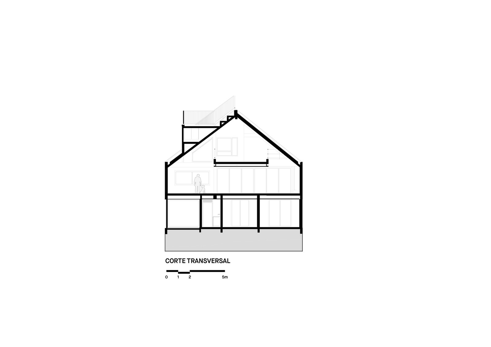 Aprovechando una de las pendientes del tejado, emerge una tribuna que funciona como mirador exterior. De esta forma lúdica, el proyecto evoca el imaginario colectivo de la icónica forma de la casa, a la vez que reorganiza su dinámica interna, transitando por niveles que se expanden e integran: desde el suelo, el huerto, hasta el cielo, el punto culminante de percepción e inspiración.