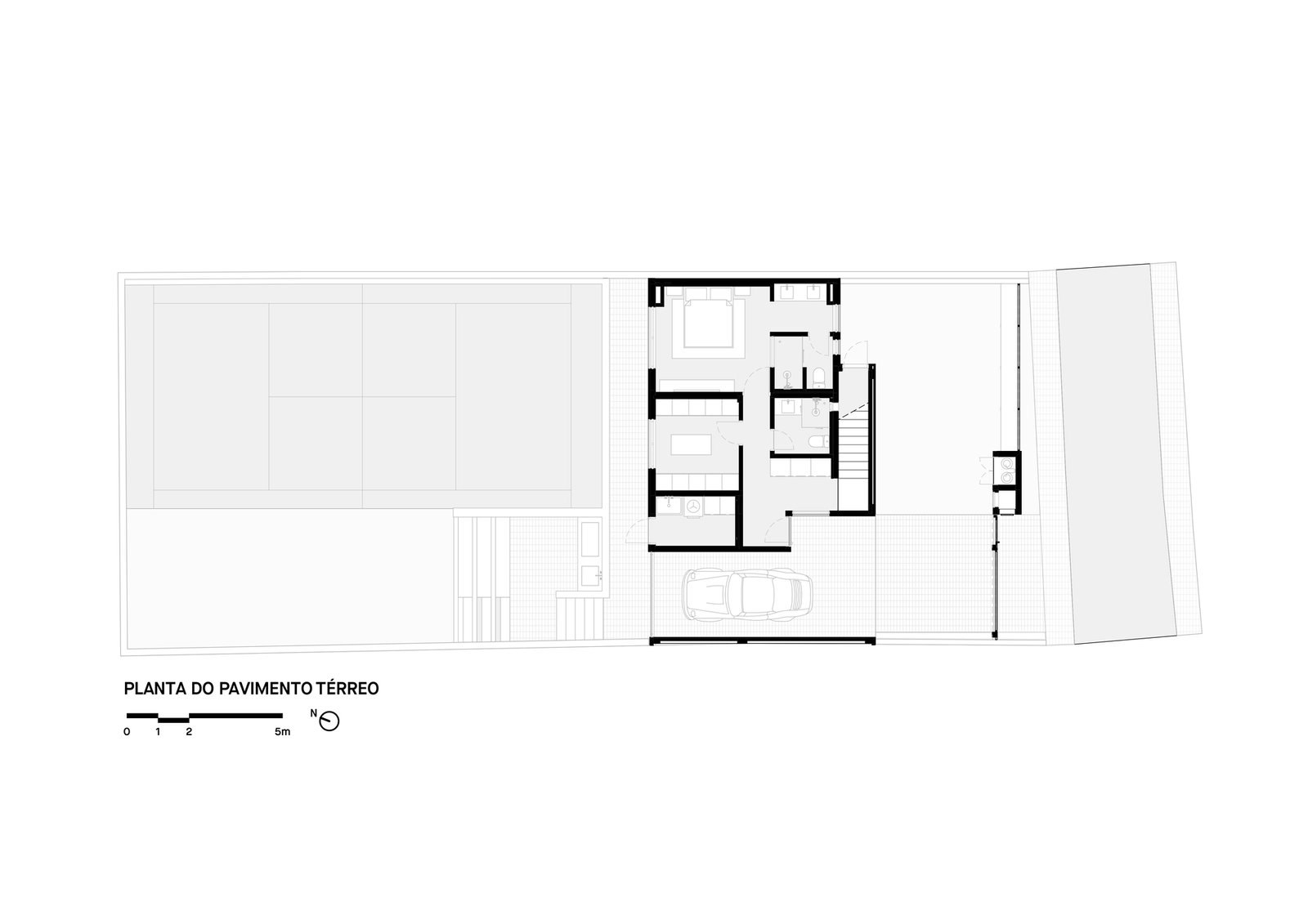 Considerando la pendiente del terreno y respetando la zona protegida de una araucaria, la zona deportiva se ubicó en la parte más baja, en la parte posterior de la propiedad, junto a un huerto y una huerta que se integra con la escalera que conecta la plataforma superior a nivel de calle. Para potenciar la conexión visual con el paisaje, el proyecto buscó invertir la lógica de distribución habitual en una vivienda de dos plantas: la zona privada, con sus dormitorios, se sitúa en la planta baja; mientras que la zona social se distribuye en un espacio abierto en la planta superior, convirtiéndola en el punto focal y ofreciendo vistas panorámicas.